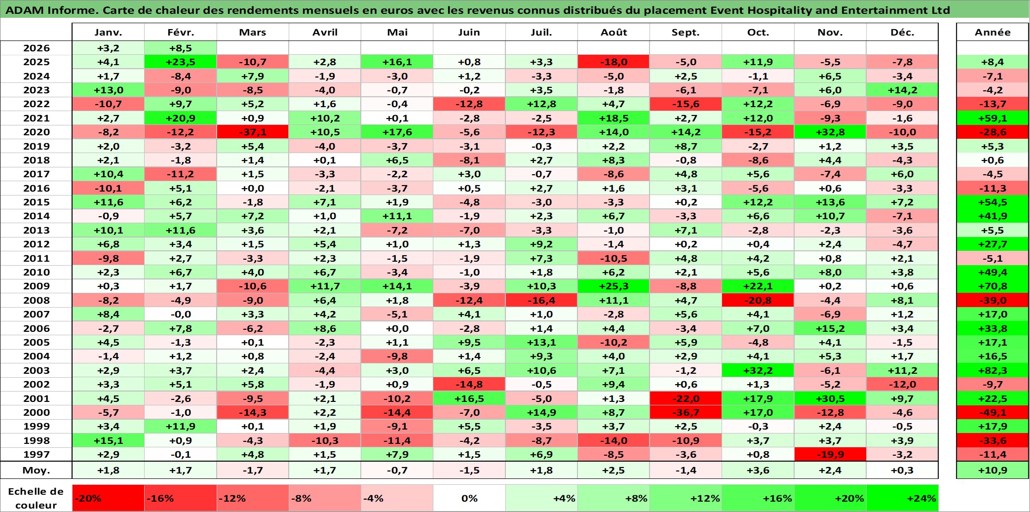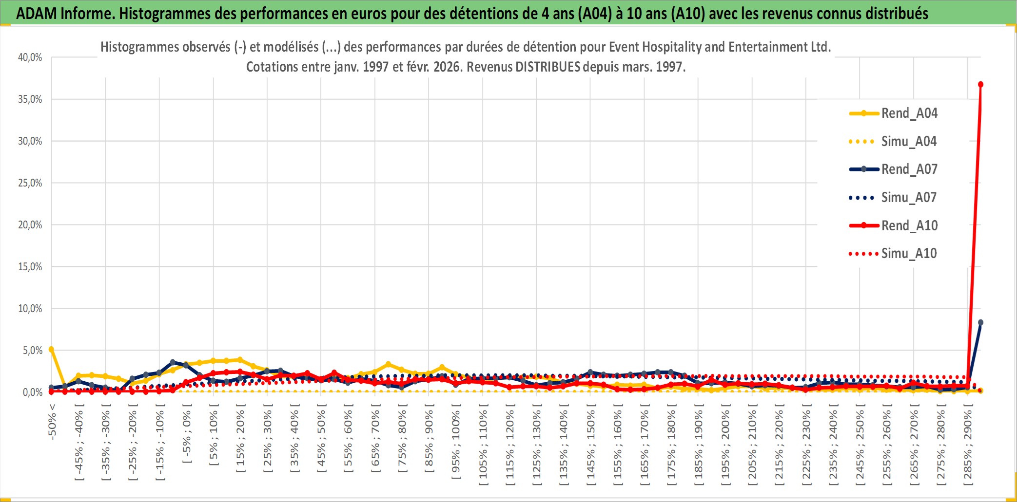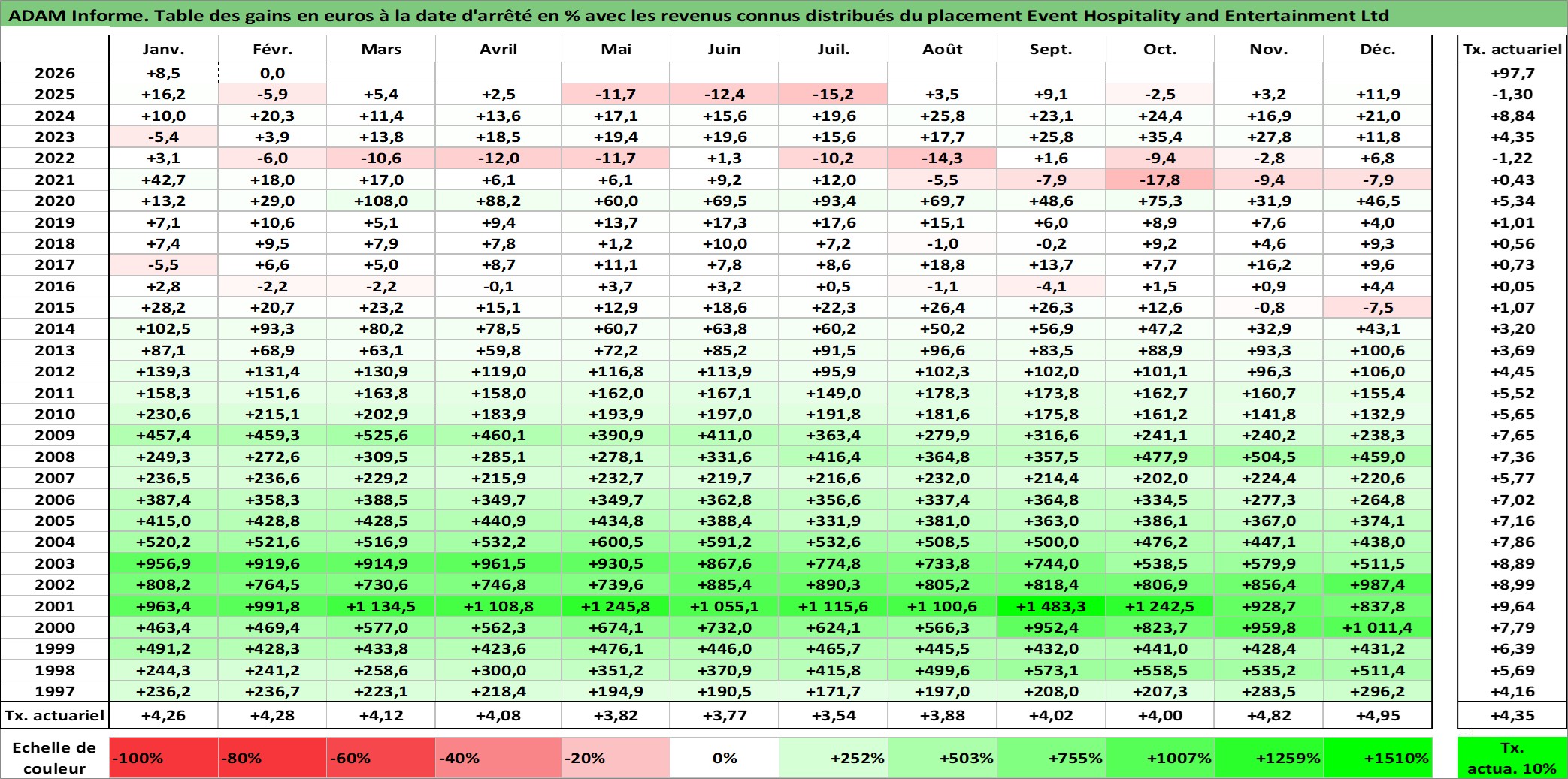 Site dédié aux investisseursPage dédiée sur site financeAnalyse des valorisations hebdomadaires de l'action Event Hospitality and Entertainment Ltd. Cet actif est cote en AUD. Les valorisations sont en contrevaleur EURO et couvrent les semaines 1997W01 a 2026W09. Les revenus de cet actif financier sont pris en compte depuis la semaine 1997W12. La note ESG de cet actif n'est pas connue.