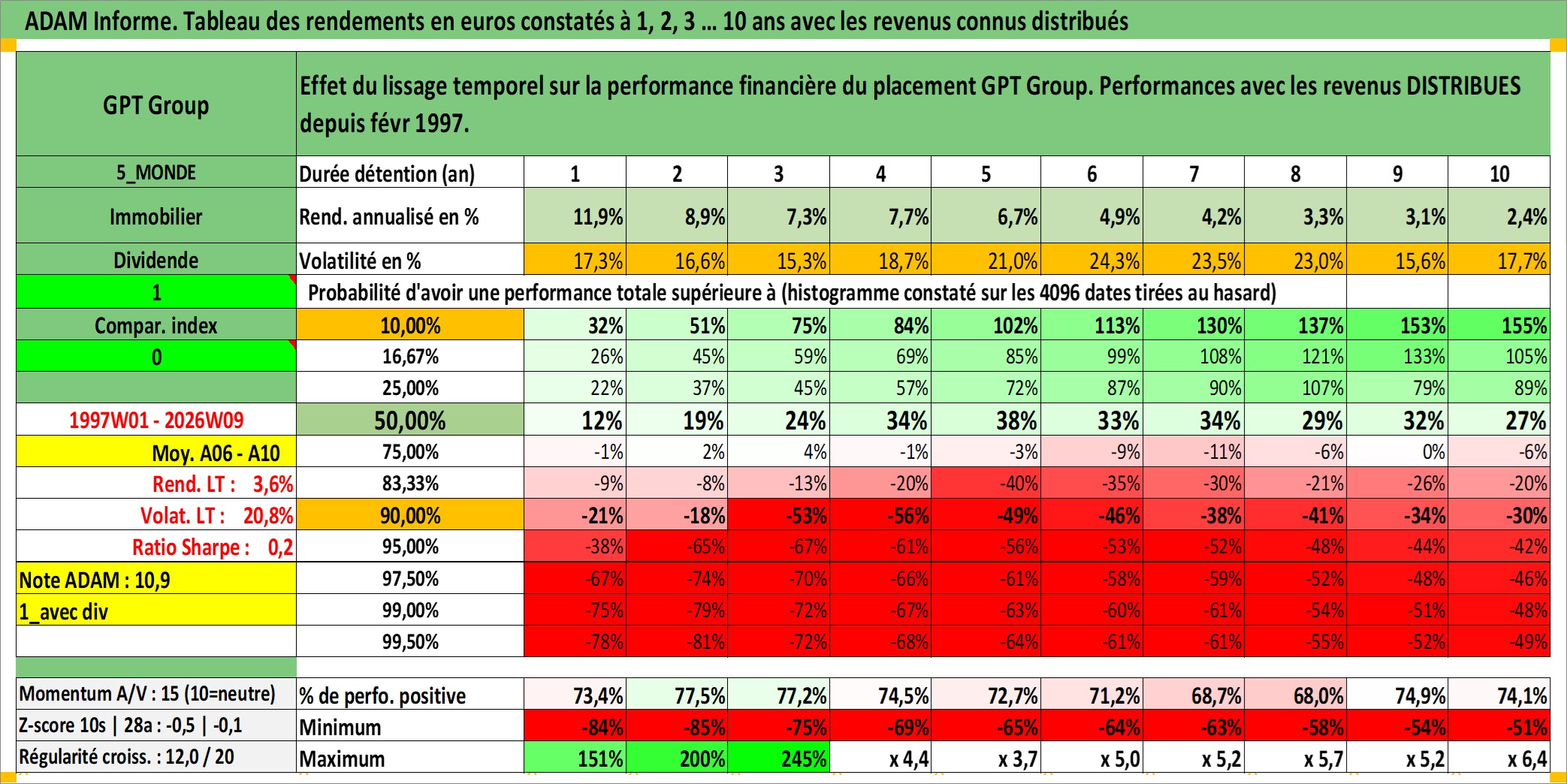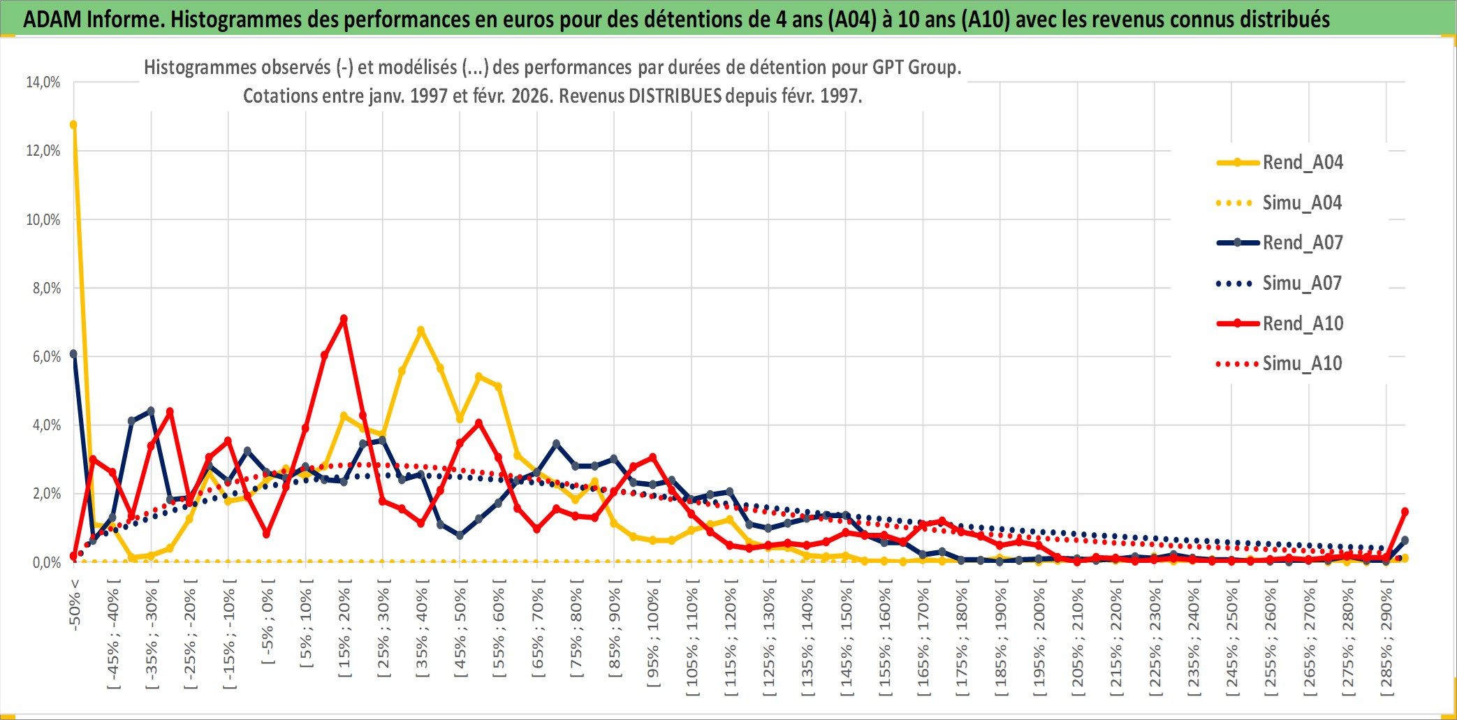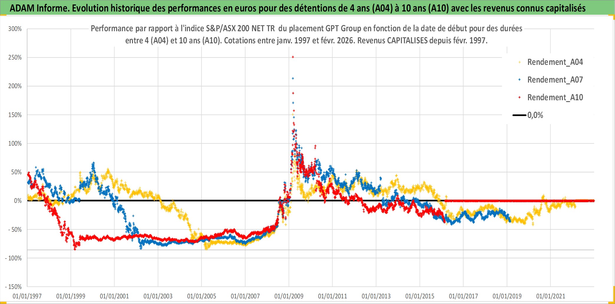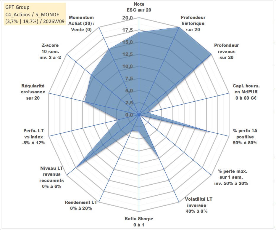 Site dédié aux investisseursPage dédiée sur site financeAnalyse des valorisations hebdomadaires de l'action GPT Group. Cet actif est cote en AUD. Les valorisations sont en contrevaleur EURO et couvrent les semaines 1997W01 a 2026W09. Les revenus de cet actif financier sont pris en compte depuis la semaine 1997W06. La note globale ESG de cet actif est estimee a 17.0 (apres rebasage entre 0 et 20).