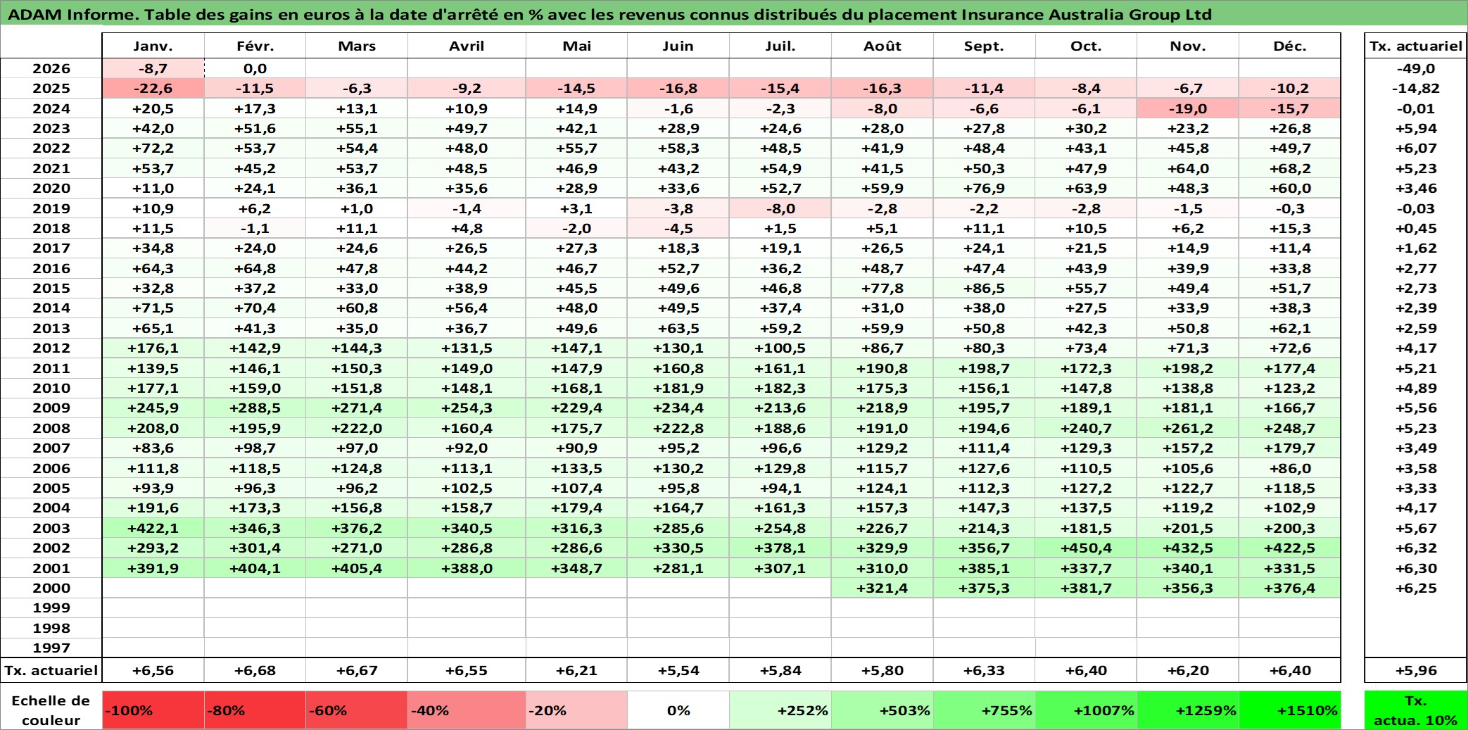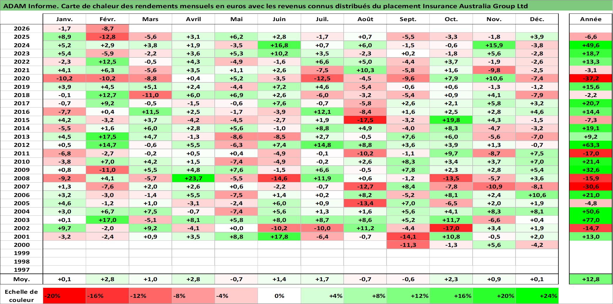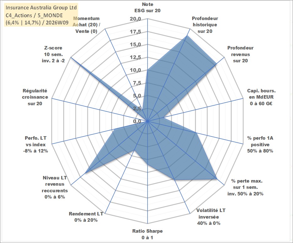 Site dédié aux investisseursPage dédiée sur site financeAnalyse des valorisations hebdomadaires de l'action Insurance Australia Group Ltd. Cet actif est cote en AUD. Les valorisations sont en contrevaleur EURO et couvrent les semaines 2000W32 a 2026W09. Les revenus de cet actif financier sont pris en compte depuis la semaine 2001W12. La note globale ESG de cet actif est estimee a 10.0 (apres rebasage entre 0 et 20).