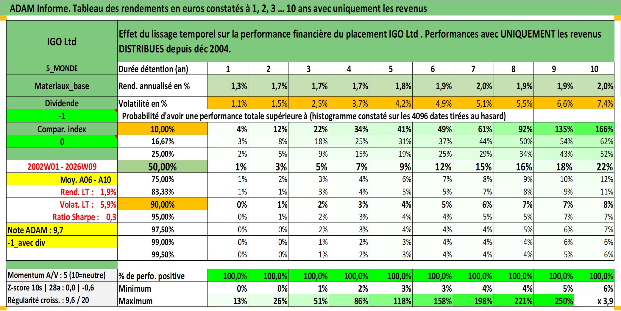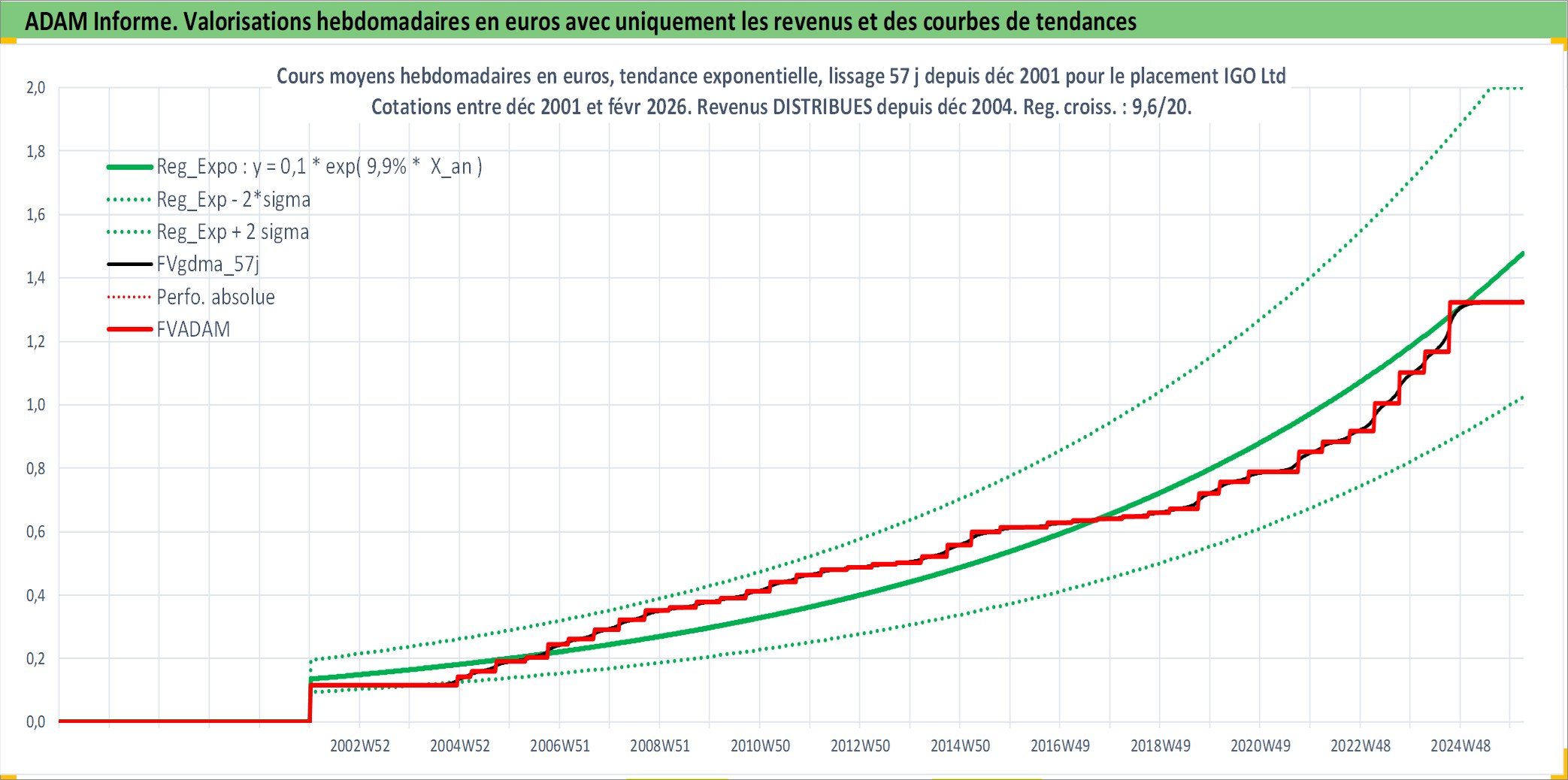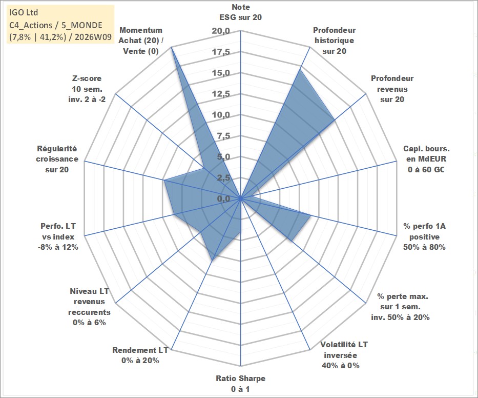 Site dédié aux investisseursPage dédiée sur site financeAnalyse des valorisations hebdomadaires de l'action IGO Ltd . Cet actif est cote en AUD. Les valorisations sont en contrevaleur EURO et couvrent les semaines 2002W01 a 2026W09. Les revenus de cet actif financier sont pris en compte depuis la semaine 2004W50. La note ESG de cet actif n'est pas connue.