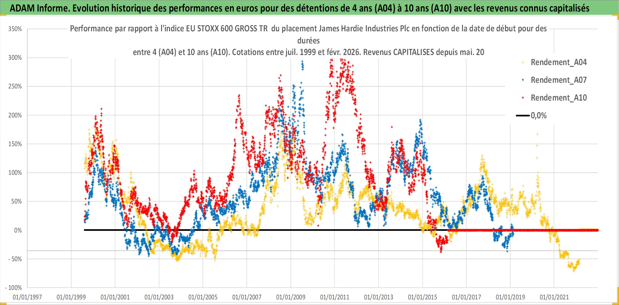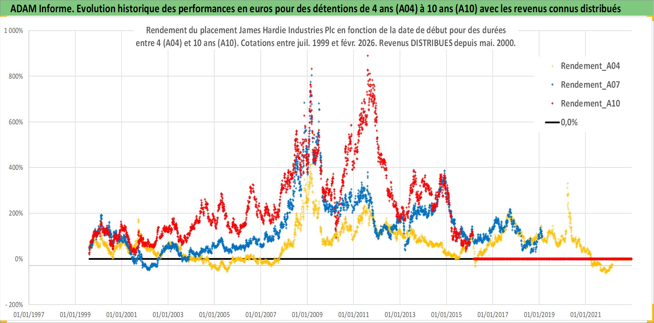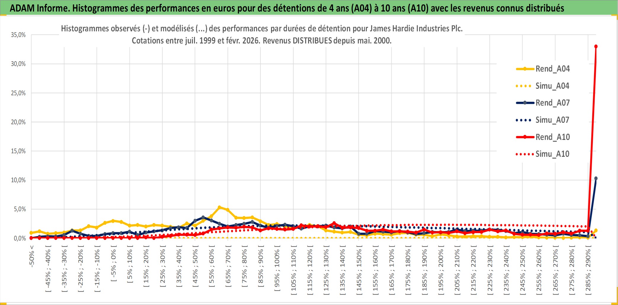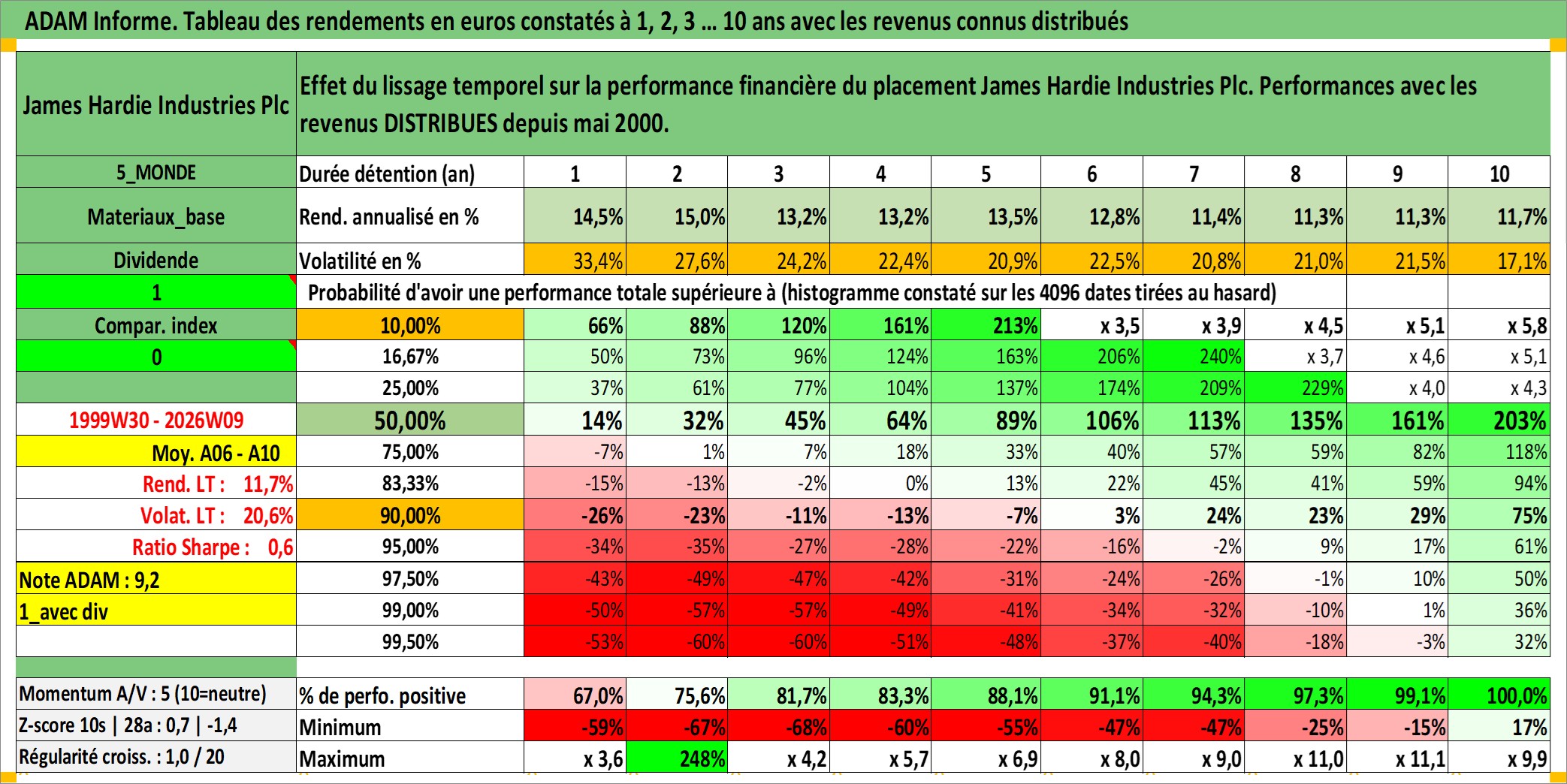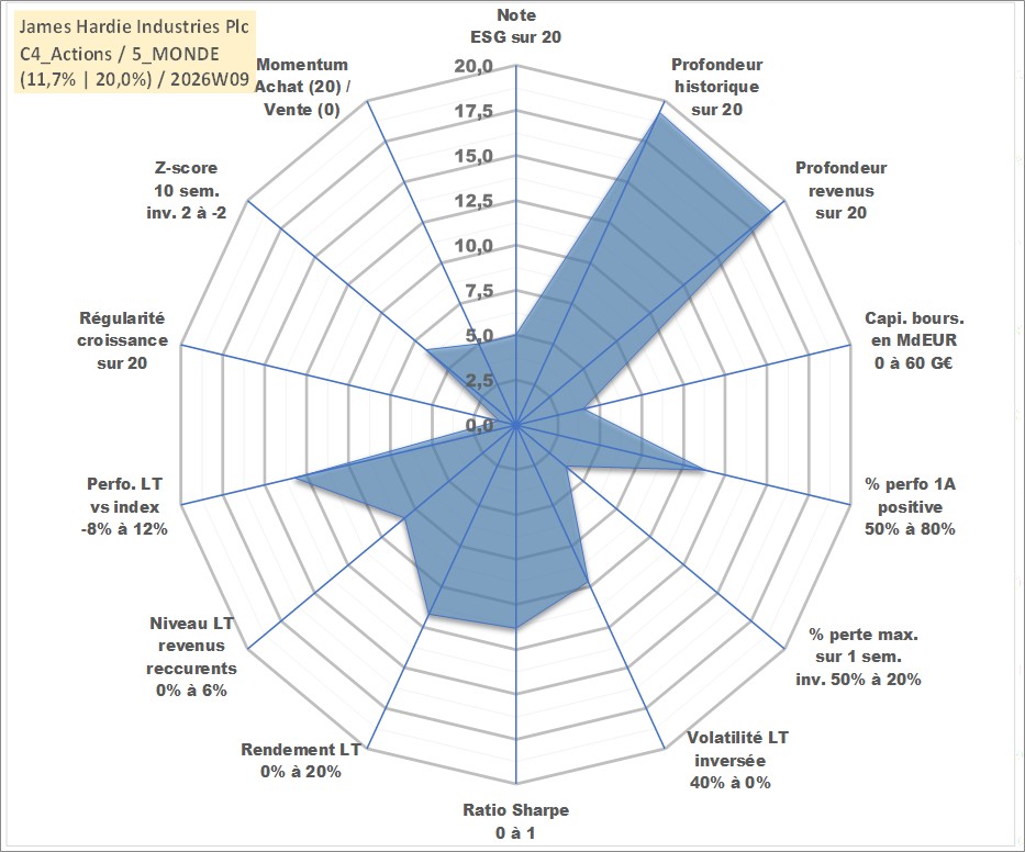 Site dédié aux investisseursPage dédiée sur site financeAnalyse des valorisations hebdomadaires de l'action James Hardie Industries Plc. Cet actif est cote en AUD. Les valorisations sont en contrevaleur EURO et couvrent les semaines 1999W30 a 2026W09. Les revenus de cet actif financier sont pris en compte depuis la semaine 2000W21. La note globale ESG de cet actif est estimee a 5.0 (apres rebasage entre 0 et 20).