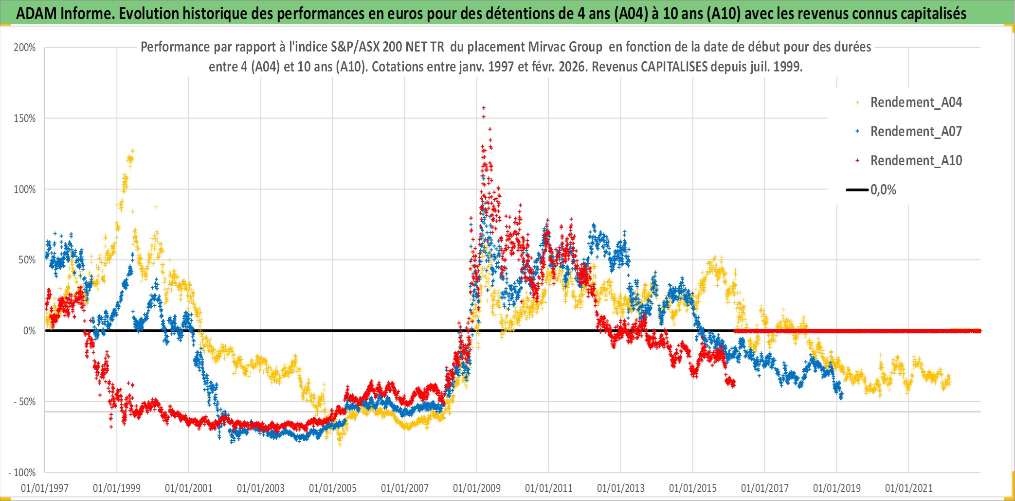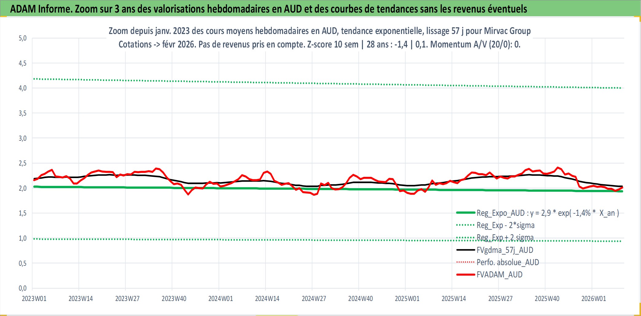 Site dédié aux investisseursPage dédiée sur site financeAnalyse des valorisations hebdomadaires de l'action Mirvac Group . Cet actif est cote en AUD. Les valorisations sont en contrevaleur EURO et couvrent les semaines 1997W01 a 2026W09. Les revenus de cet actif financier sont pris en compte depuis la semaine 1999W26. La note globale ESG de cet actif est estimee a 18.0 (apres rebasage entre 0 et 20).