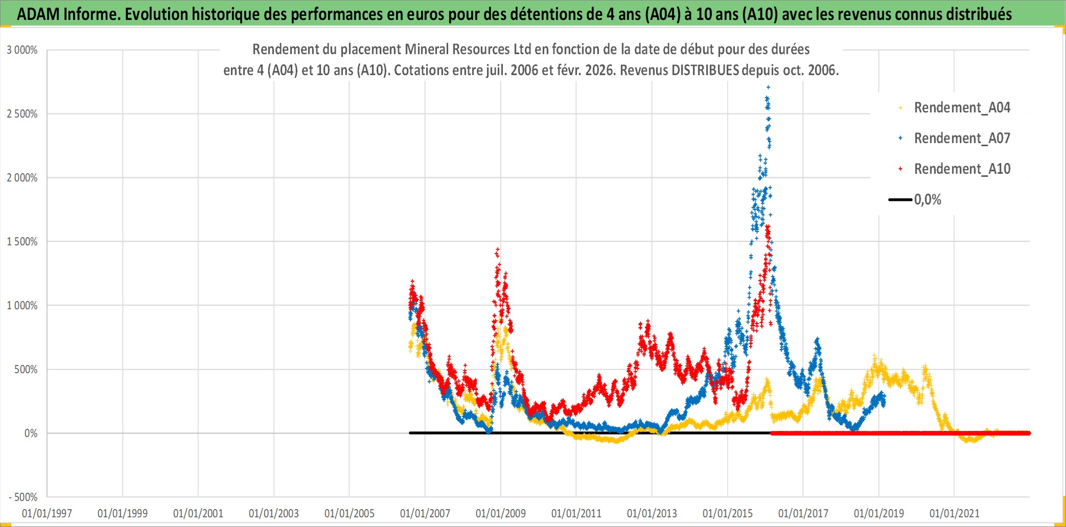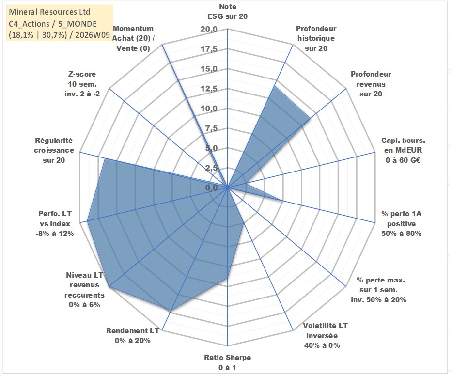 Site dédié aux investisseursPage dédiée sur site financeAnalyse des valorisations hebdomadaires de l'action Mineral Resources Ltd. Cet actif est cote en AUD. Les valorisations sont en contrevaleur EURO et couvrent les semaines 2006W30 a 2026W09. Les revenus de cet actif financier sont pris en compte depuis la semaine 2006W41. La note ESG de cet actif n'est pas connue.