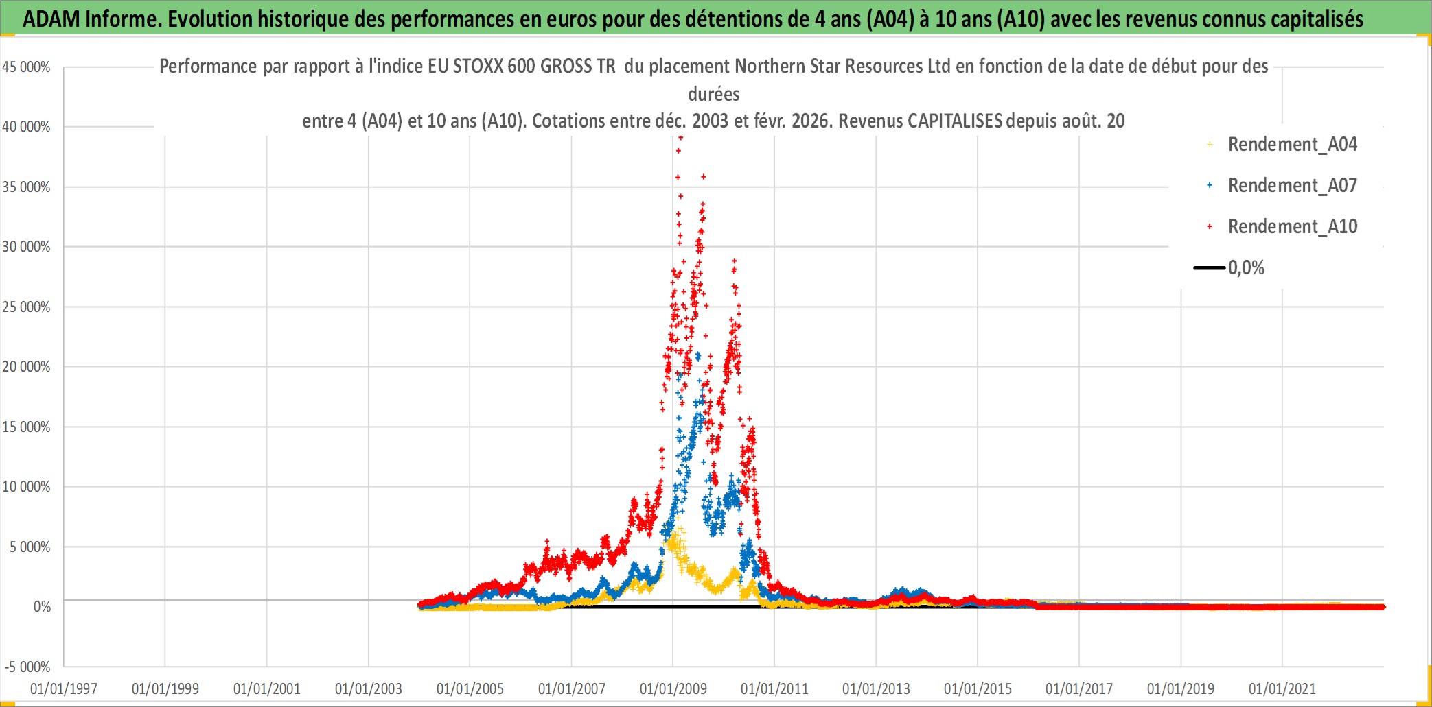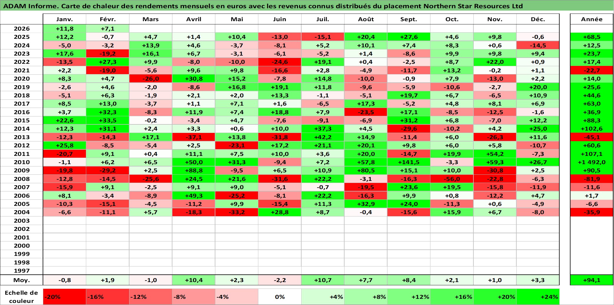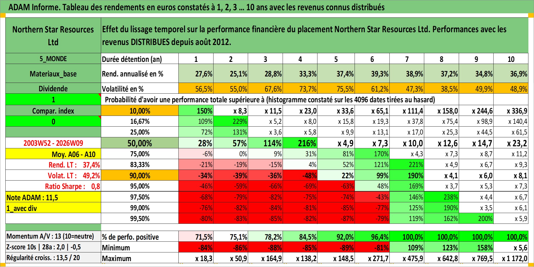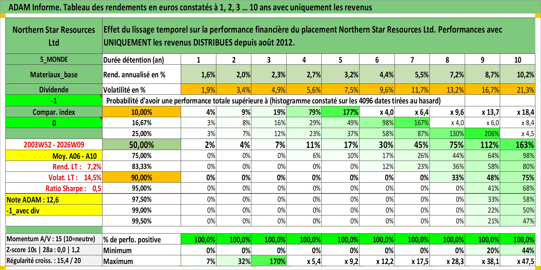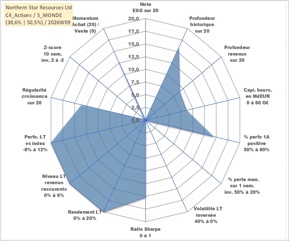 Site dédié aux investisseursPage dédiée sur site financeAnalyse des valorisations hebdomadaires de l'action Northern Star Resources Ltd. Cet actif est cote en AUD. Les valorisations sont en contrevaleur EURO et couvrent les semaines 2003W52 a 2026W09. Les revenus de cet actif financier sont pris en compte depuis la semaine 2012W35. La note ESG de cet actif n'est pas connue.