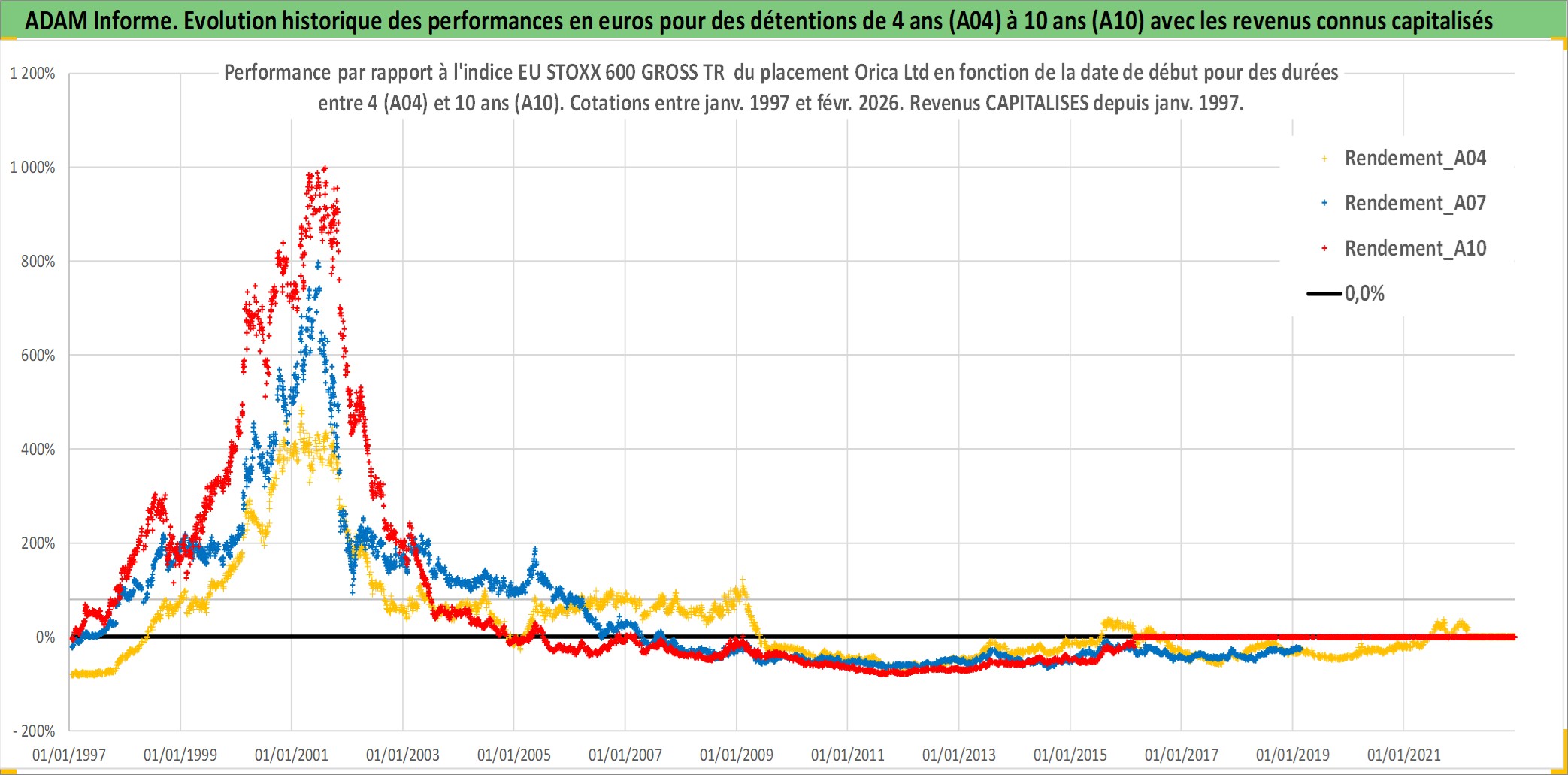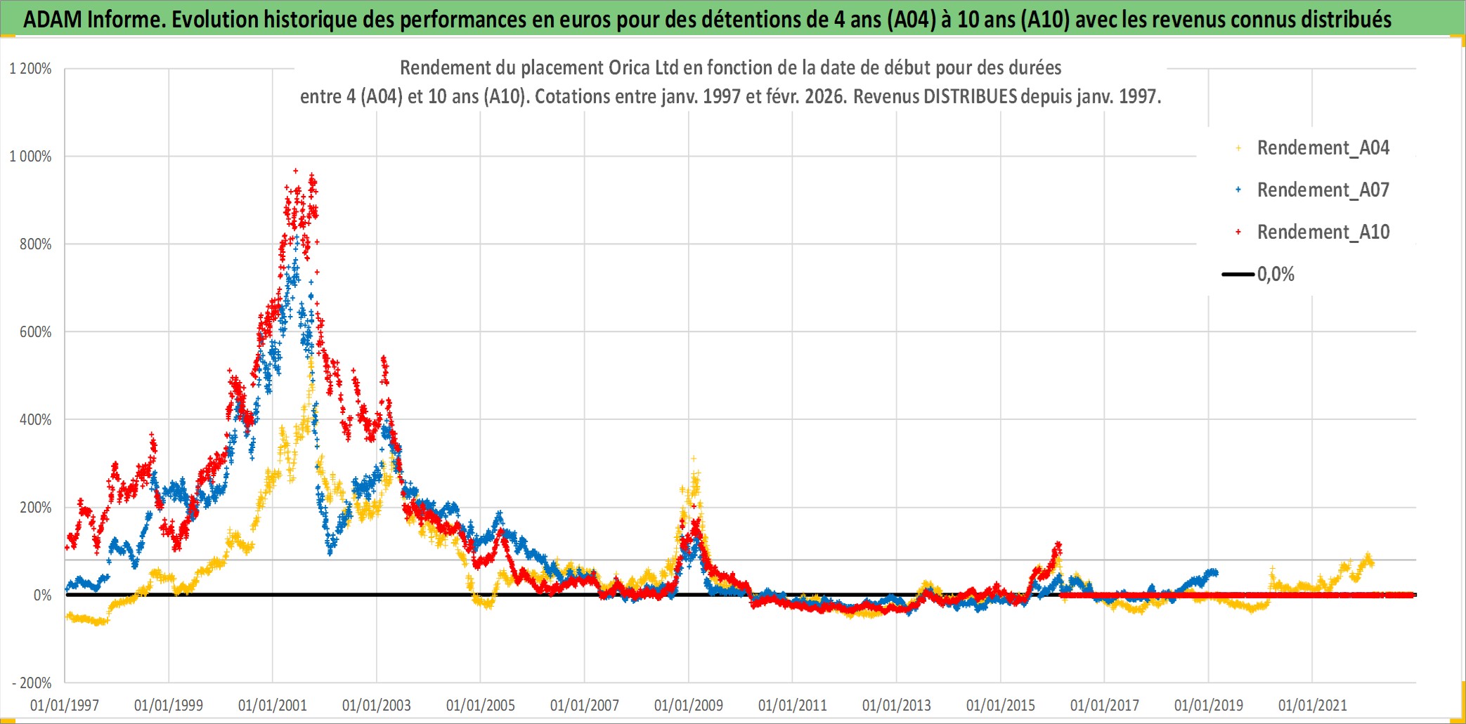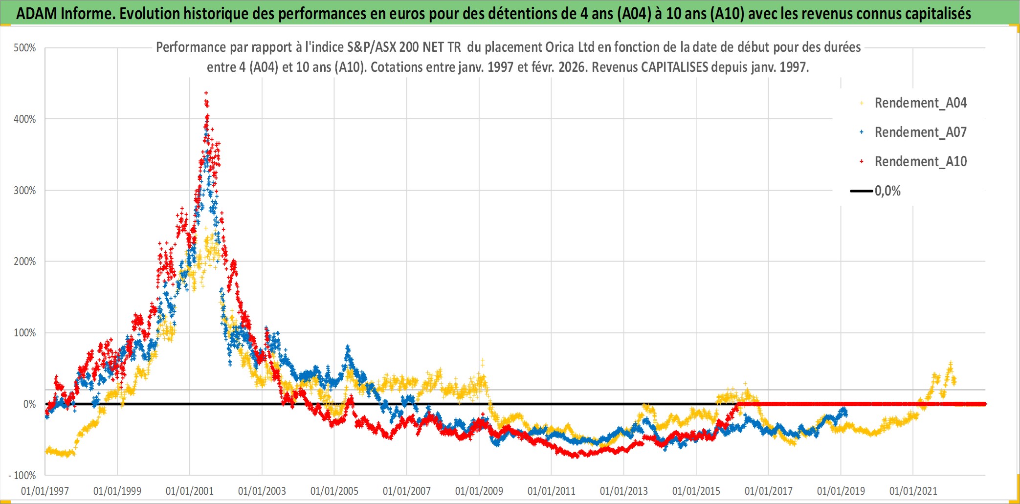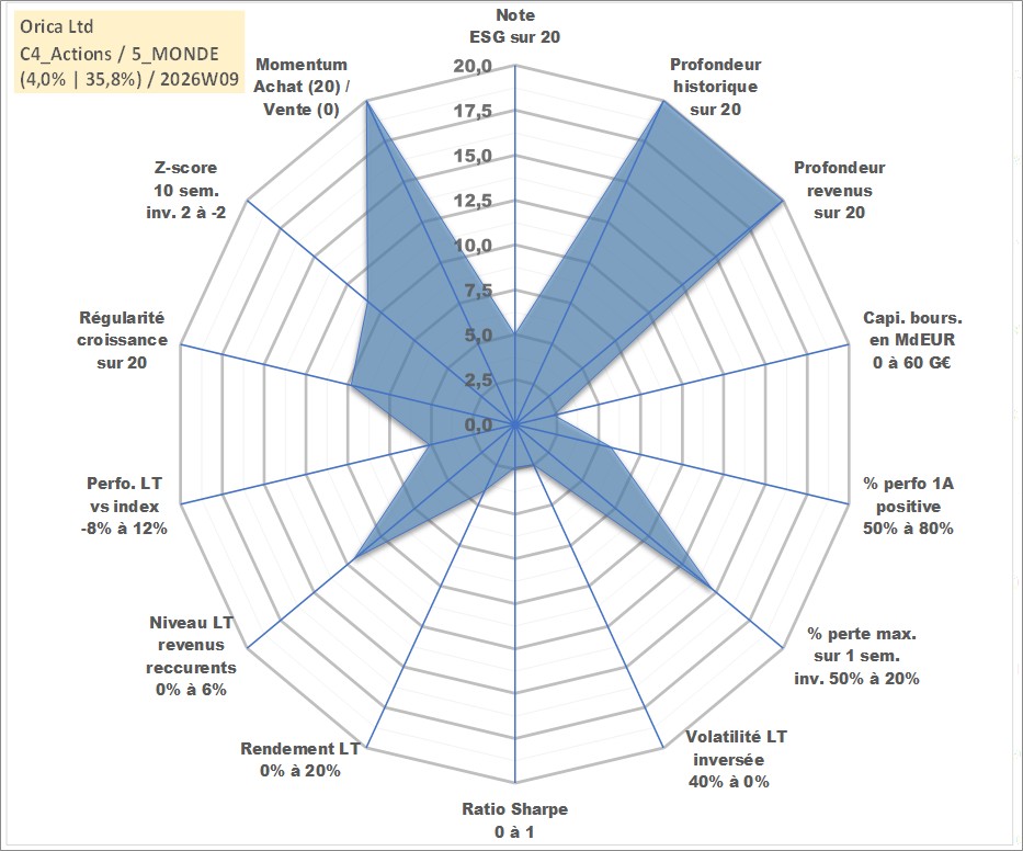 Site dédié aux investisseursPage dédiée sur site financeAnalyse des valorisations hebdomadaires de l'action Orica Ltd. Cet actif est cote en AUD. Les valorisations sont en contrevaleur EURO et couvrent les semaines 1997W01 a 2026W09. Les revenus de cet actif financier sont pris en compte depuis la semaine 1997W01. La note globale ESG de cet actif est estimee a 5.0 (apres rebasage entre 0 et 20).