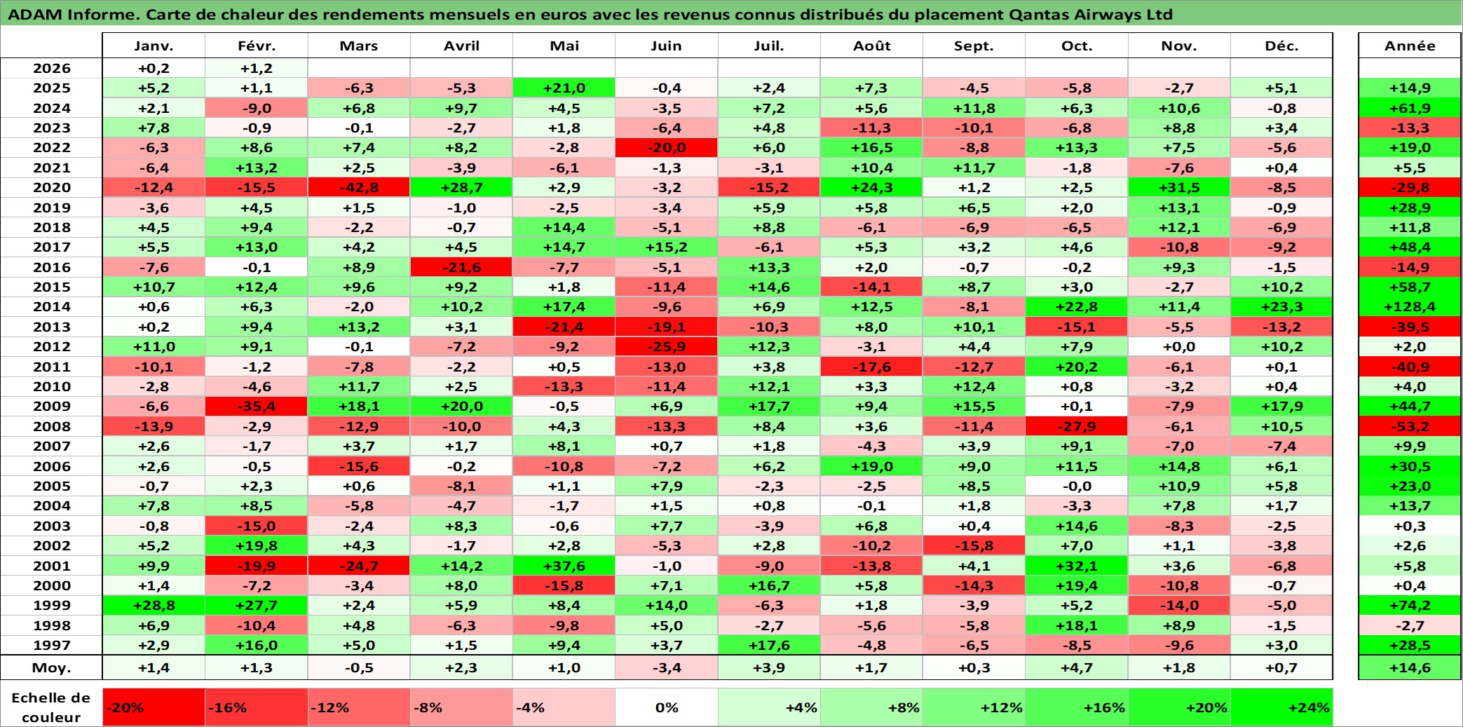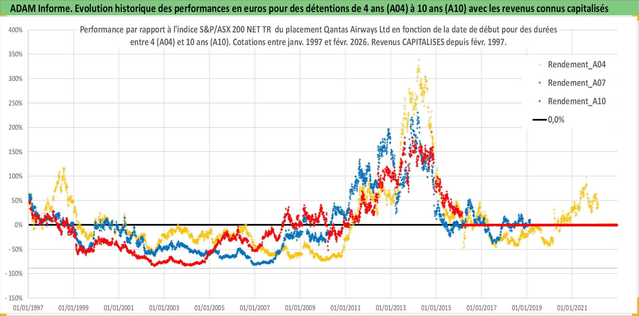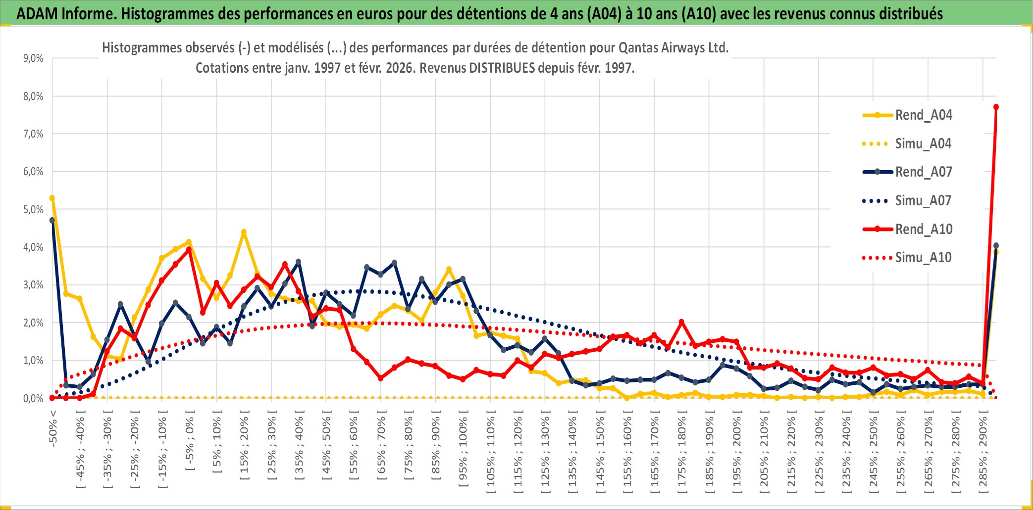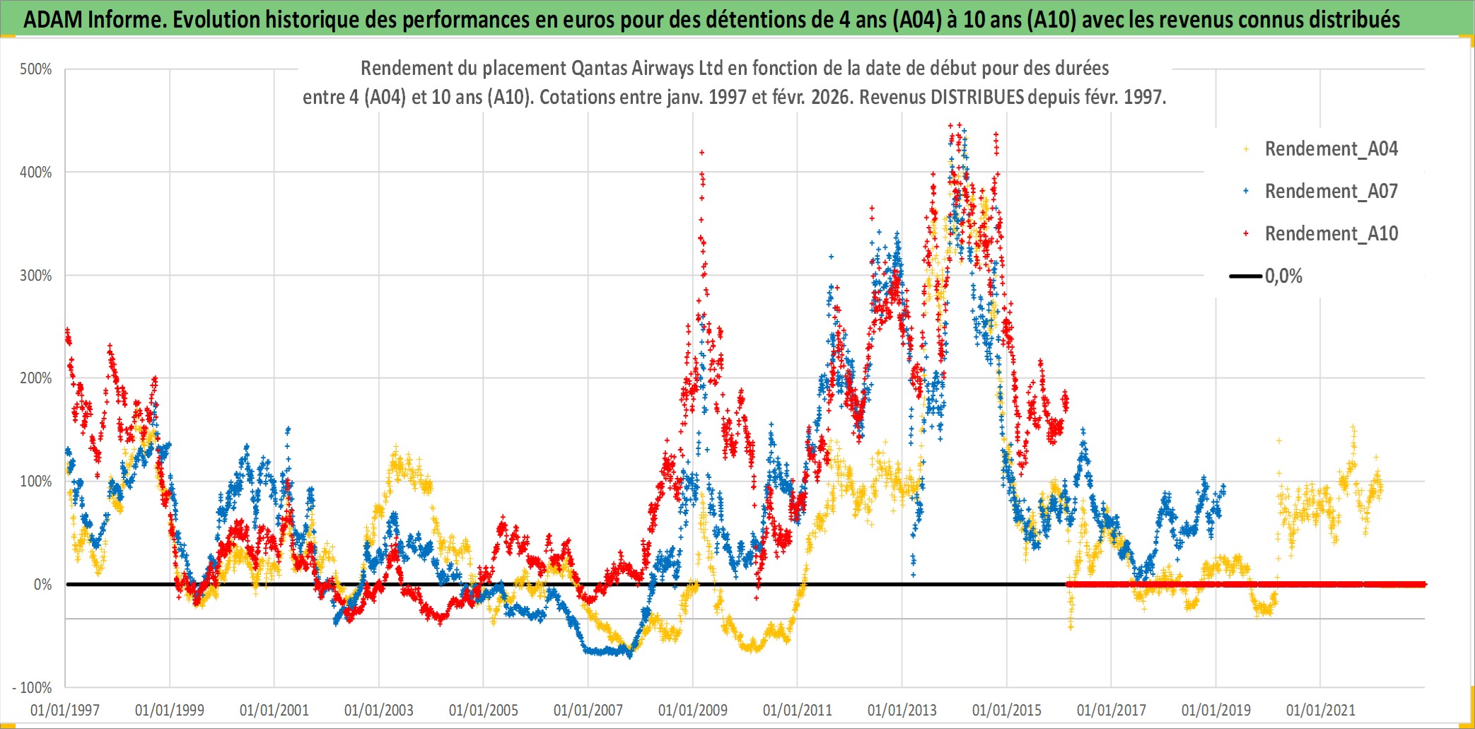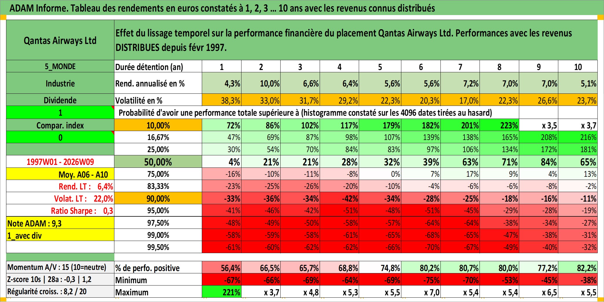 Site dédié aux investisseursPage dédiée sur site financeAnalyse des valorisations hebdomadaires de l'action Qantas Airways Ltd. Cet actif est cote en AUD. Les valorisations sont en contrevaleur EURO et couvrent les semaines 1997W01 a 2026W09. Les revenus de cet actif financier sont pris en compte depuis la semaine 1997W09. La note ESG de cet actif n'est pas connue.