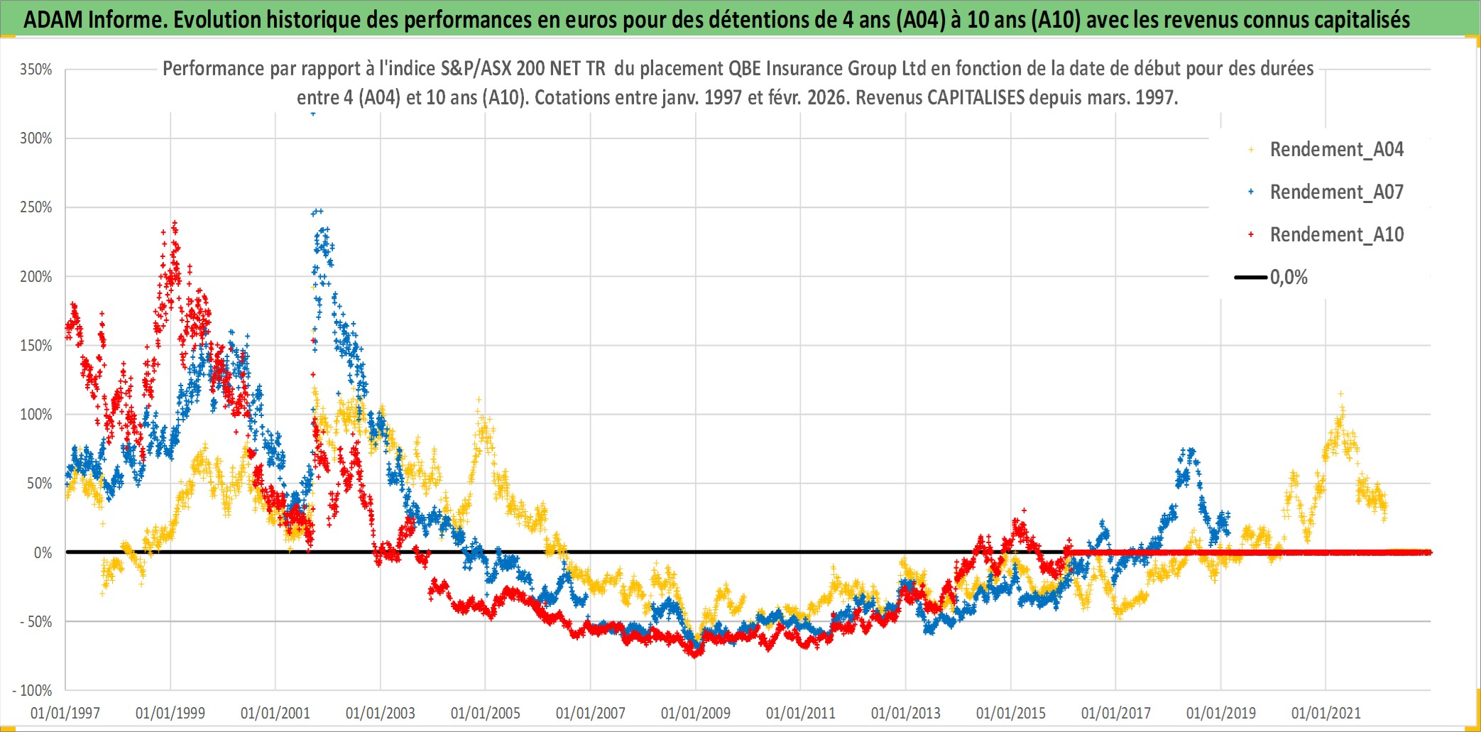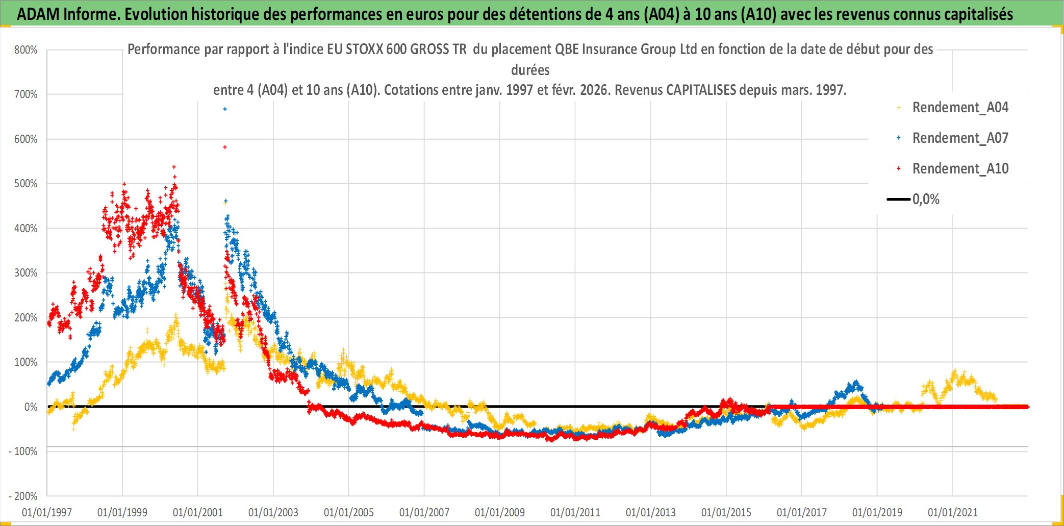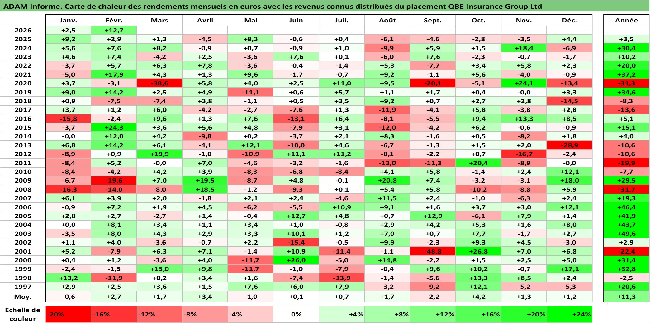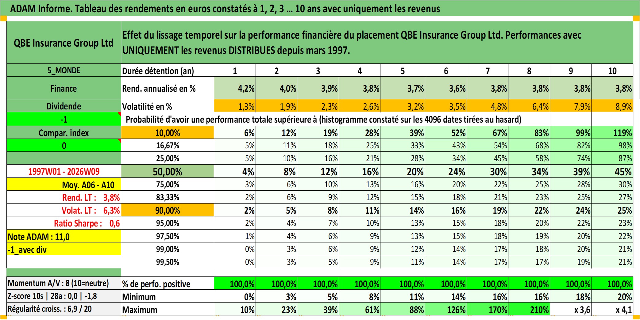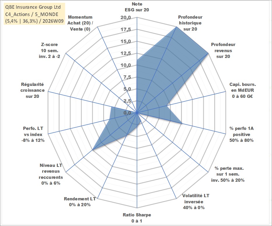 Site dédié aux investisseursPage dédiée sur site financeAnalyse des valorisations hebdomadaires de l'action QBE Insurance Group Ltd. Cet actif est cote en AUD. Les valorisations sont en contrevaleur EURO et couvrent les semaines 1997W01 a 2026W09. Les revenus de cet actif financier sont pris en compte depuis la semaine 1997W09. La note globale ESG de cet actif est estimee a 11.0 (apres rebasage entre 0 et 20).