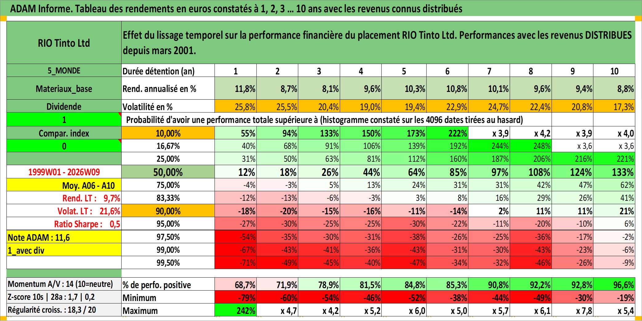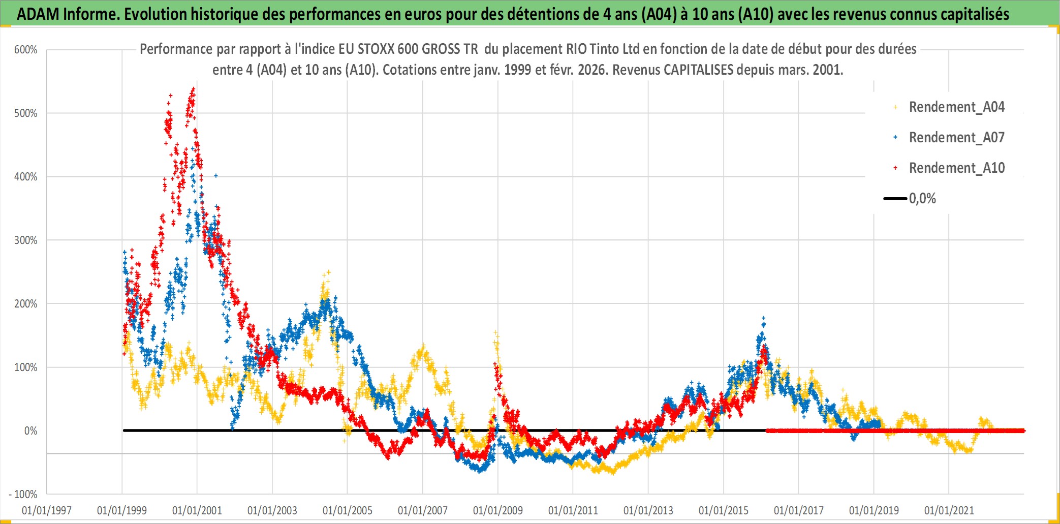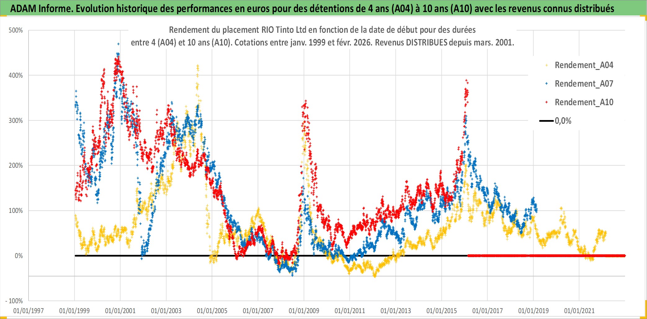 Site dédié aux investisseursPage dédiée sur site financeAnalyse des valorisations hebdomadaires de l'action RIO Tinto Ltd. Cet actif est cote en AUD. Les valorisations sont en contrevaleur EURO et couvrent les semaines 1999W01 a 2026W09. Les revenus de cet actif financier sont pris en compte depuis la semaine 2001W09. La note globale ESG de cet actif est estimee a 4.0 (apres rebasage entre 0 et 20).