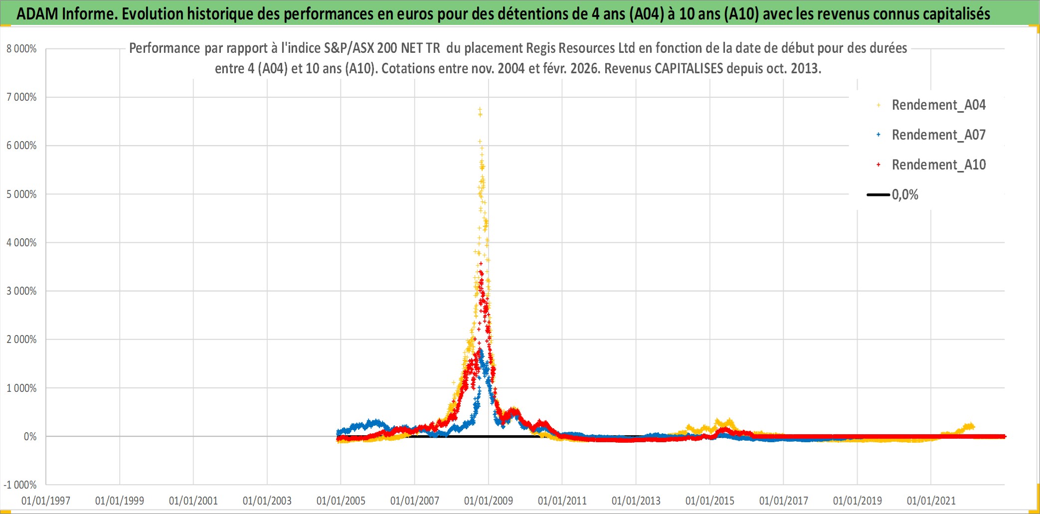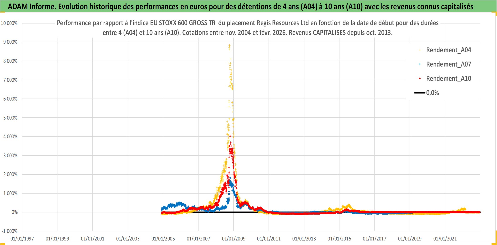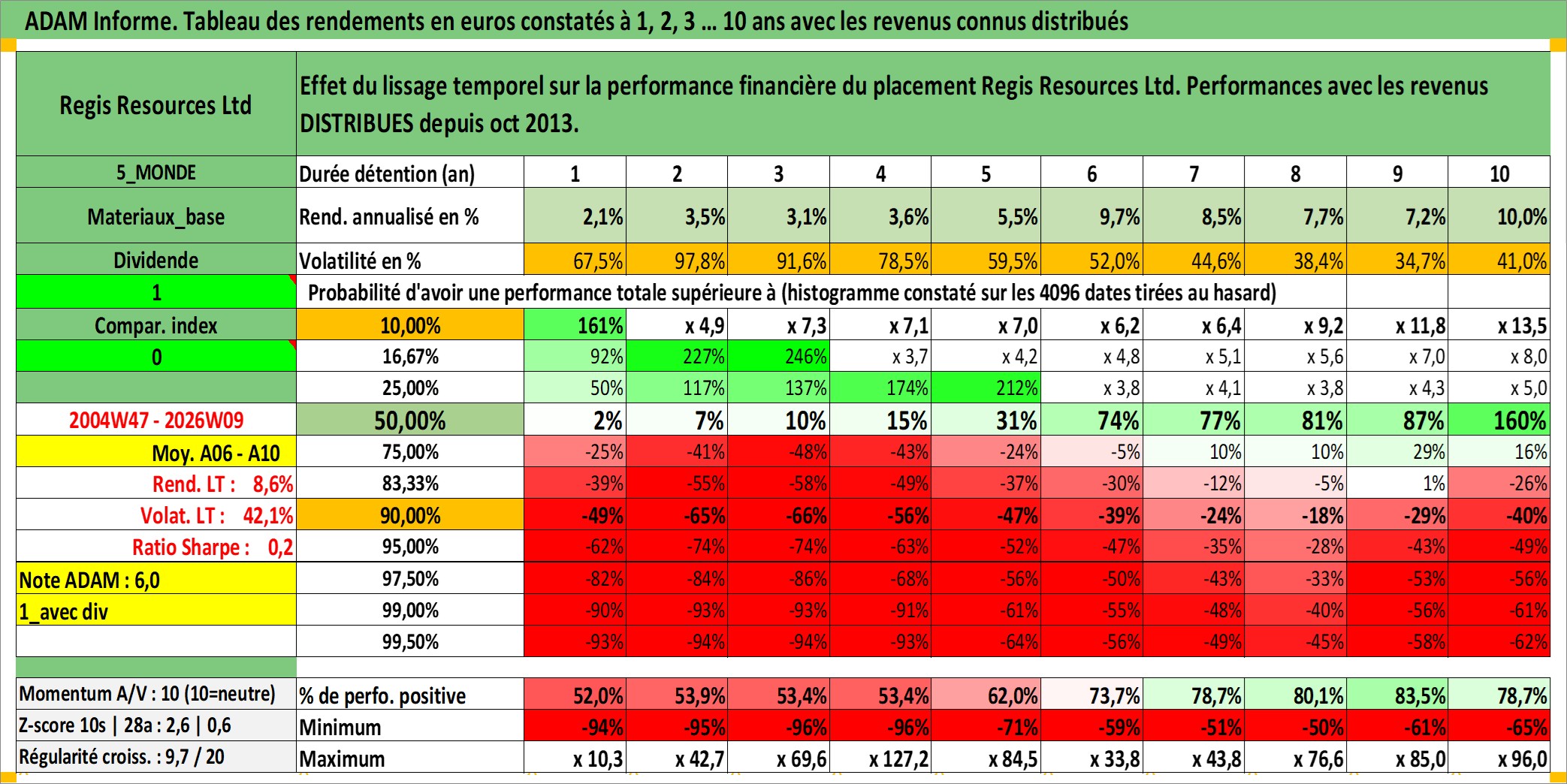 Site dédié aux investisseursPage dédiée sur site financeAnalyse des valorisations hebdomadaires de l'action Regis Resources Ltd. Cet actif est cote en AUD. Les valorisations sont en contrevaleur EURO et couvrent les semaines 2004W47 a 2026W09. Les revenus de cet actif financier sont pris en compte depuis la semaine 2013W41. La note ESG de cet actif n'est pas connue.