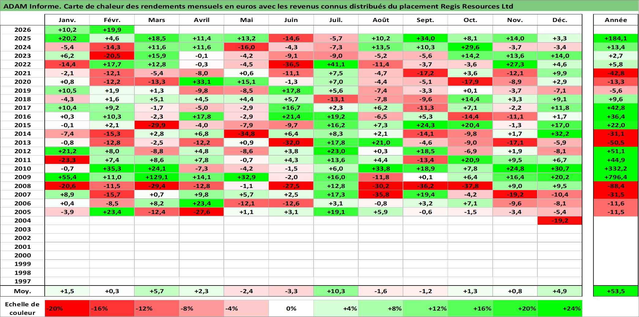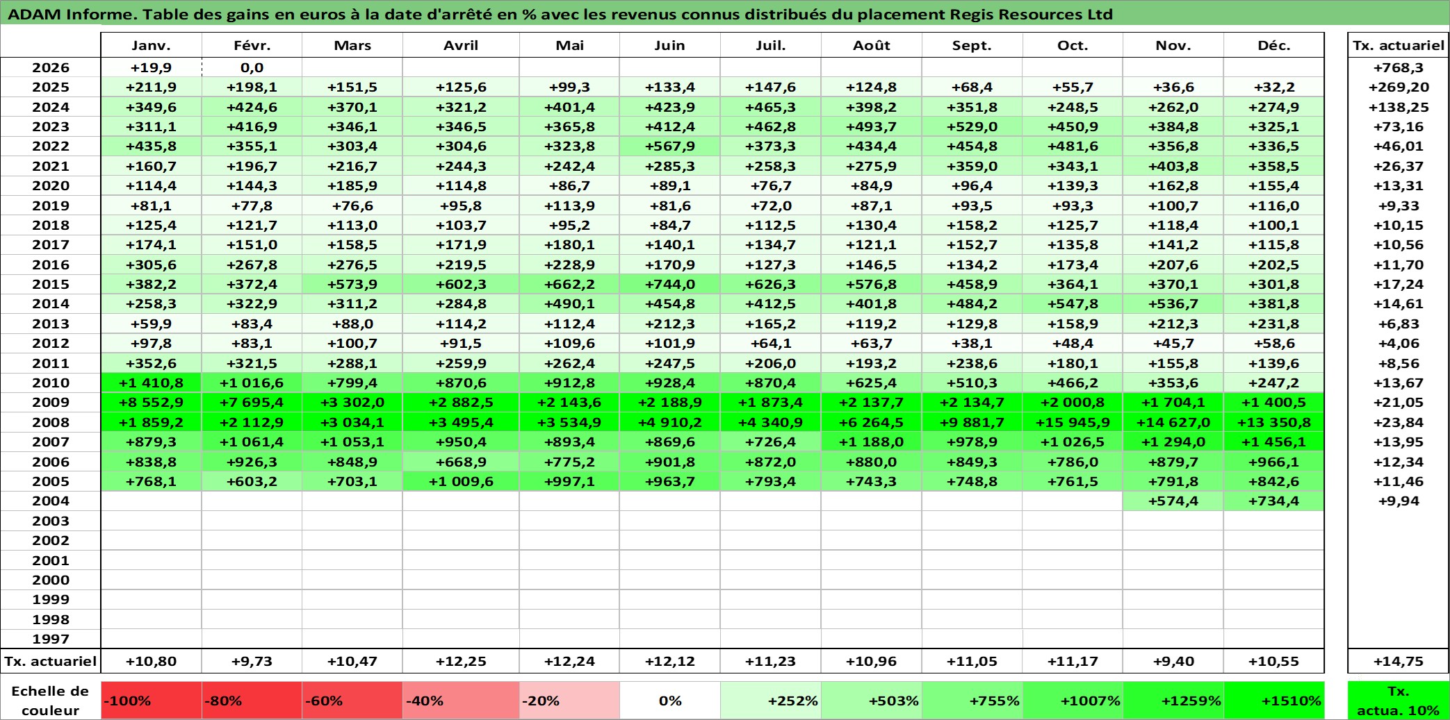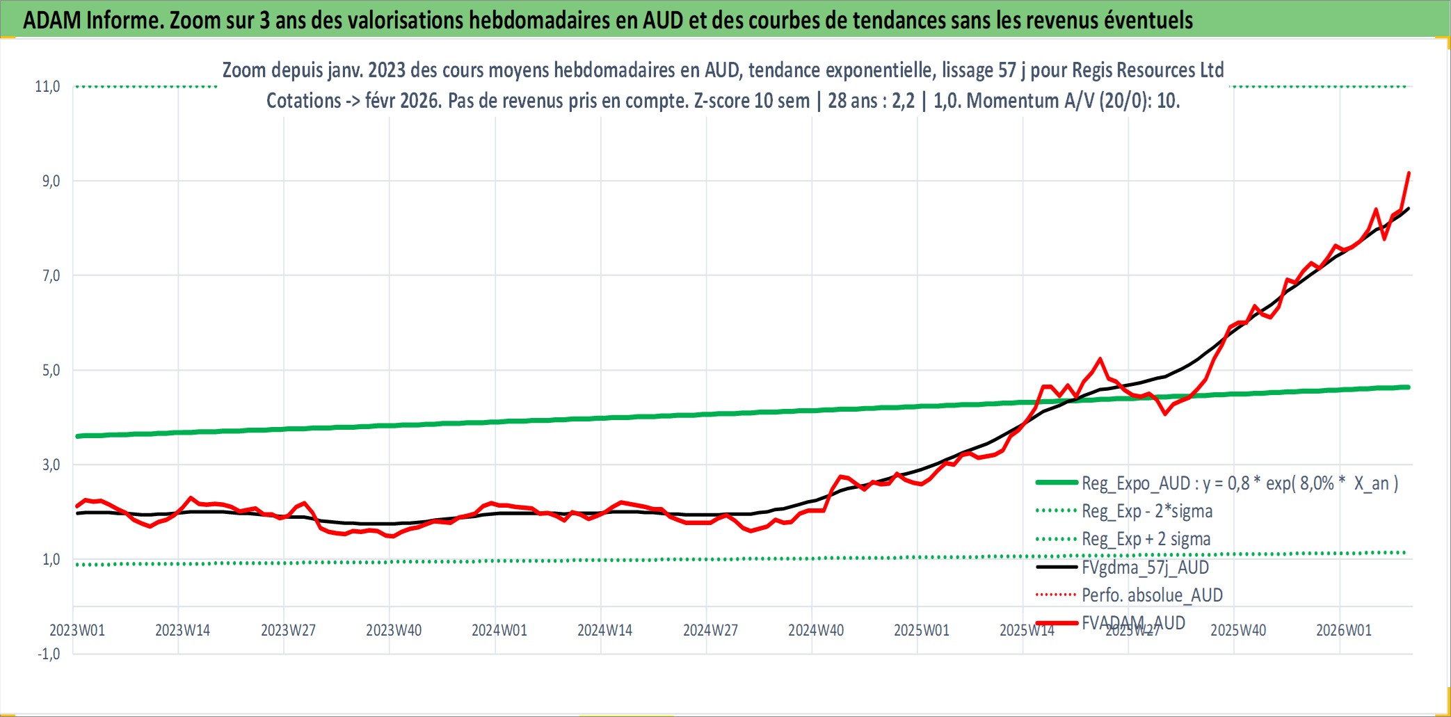 Site dédié aux investisseursPage dédiée sur site financeAnalyse des valorisations hebdomadaires de l'action Regis Resources Ltd. Cet actif est cote en AUD. Les valorisations sont en contrevaleur EURO et couvrent les semaines 2004W47 a 2026W09. Les revenus de cet actif financier sont pris en compte depuis la semaine 2013W41. La note ESG de cet actif n'est pas connue.
