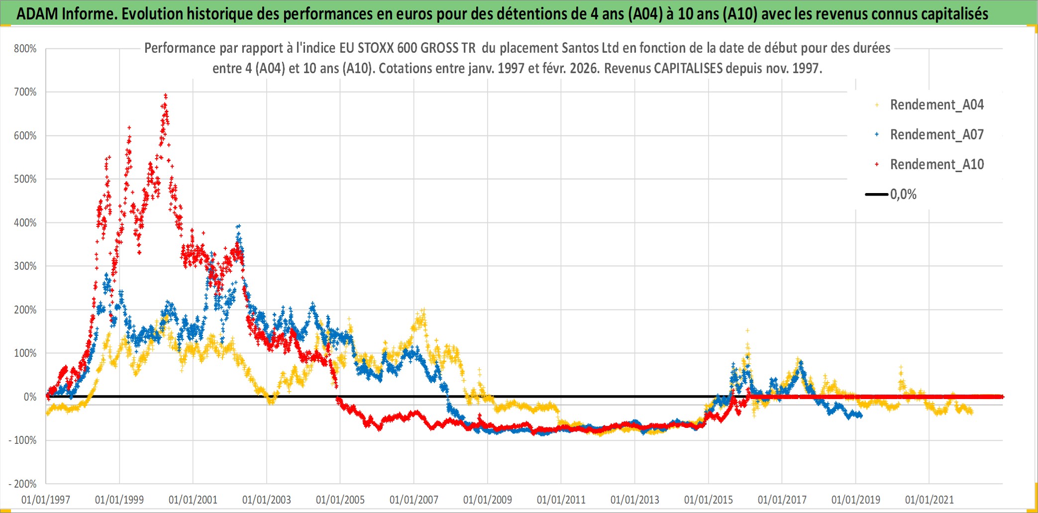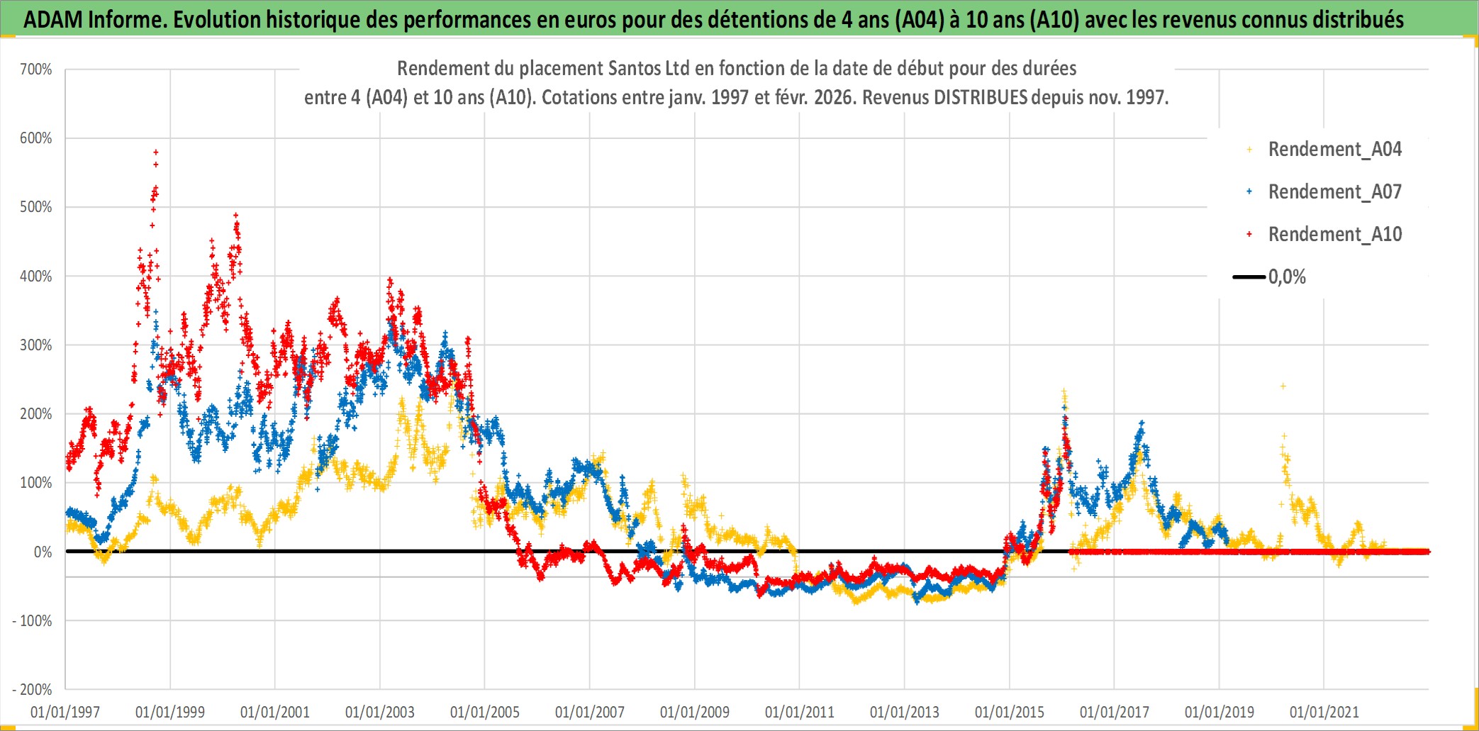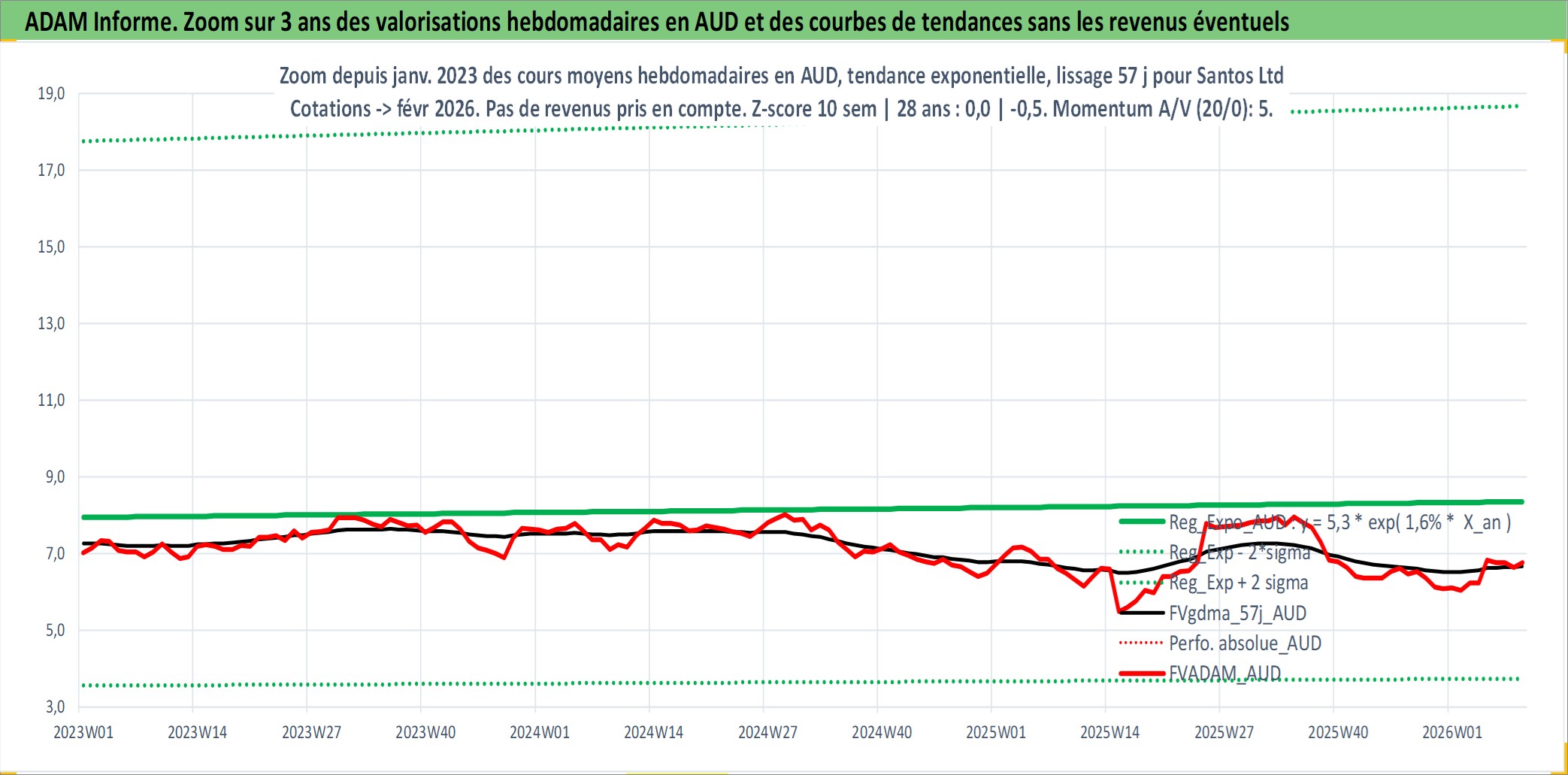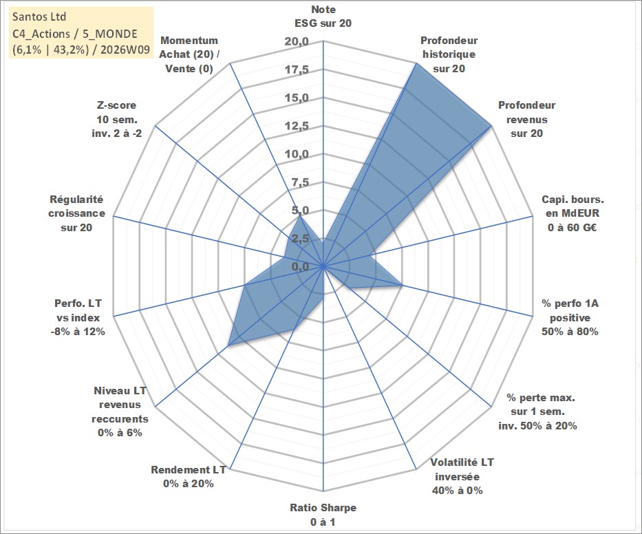 Site dédié aux investisseursPage dédiée sur site financeAnalyse des valorisations hebdomadaires de l'action Santos Ltd. Cet actif est cote en AUD. Les valorisations sont en contrevaleur EURO et couvrent les semaines 1997W01 a 2026W09. Les revenus de cet actif financier sont pris en compte depuis la semaine 1997W46. La note globale ESG de cet actif est estimee a 2.0 (apres rebasage entre 0 et 20).
