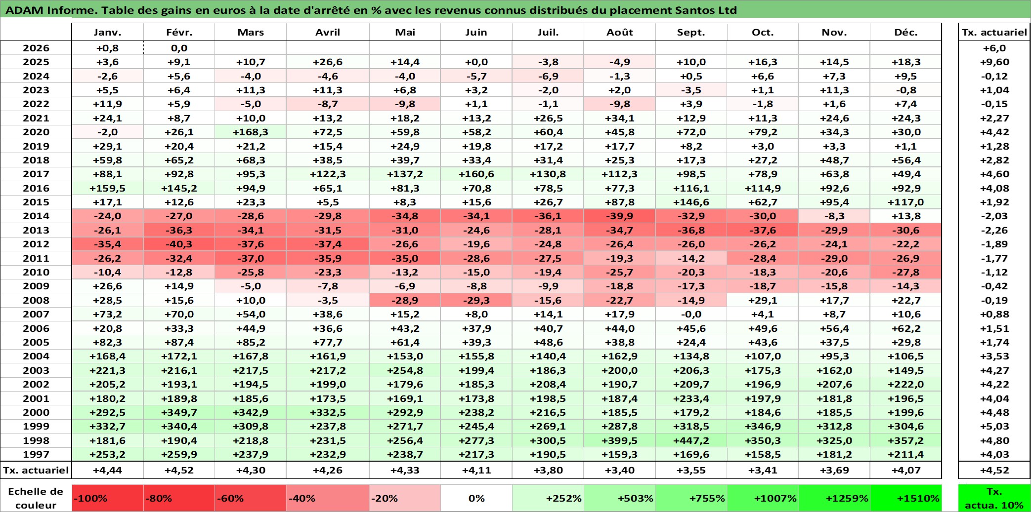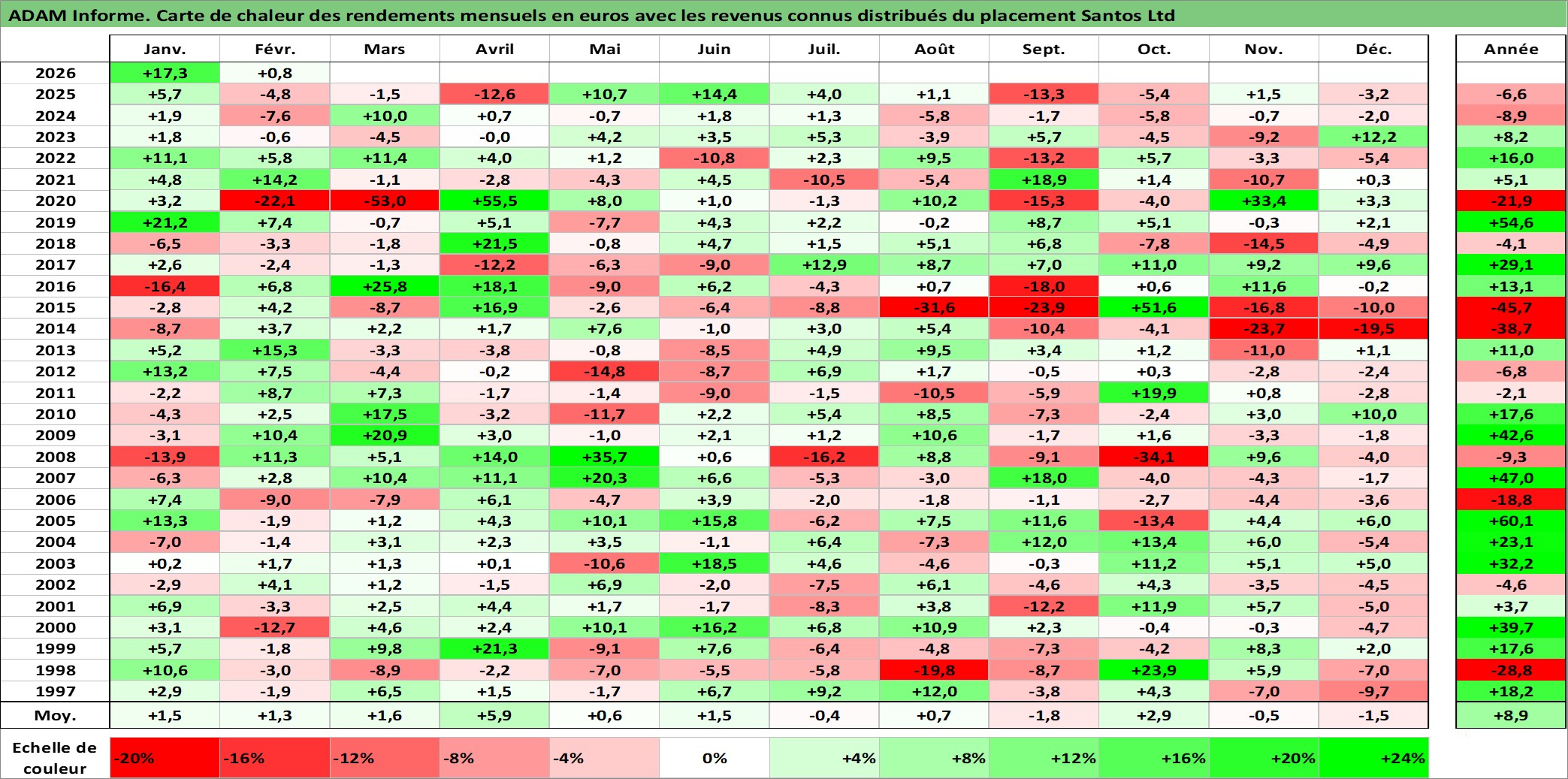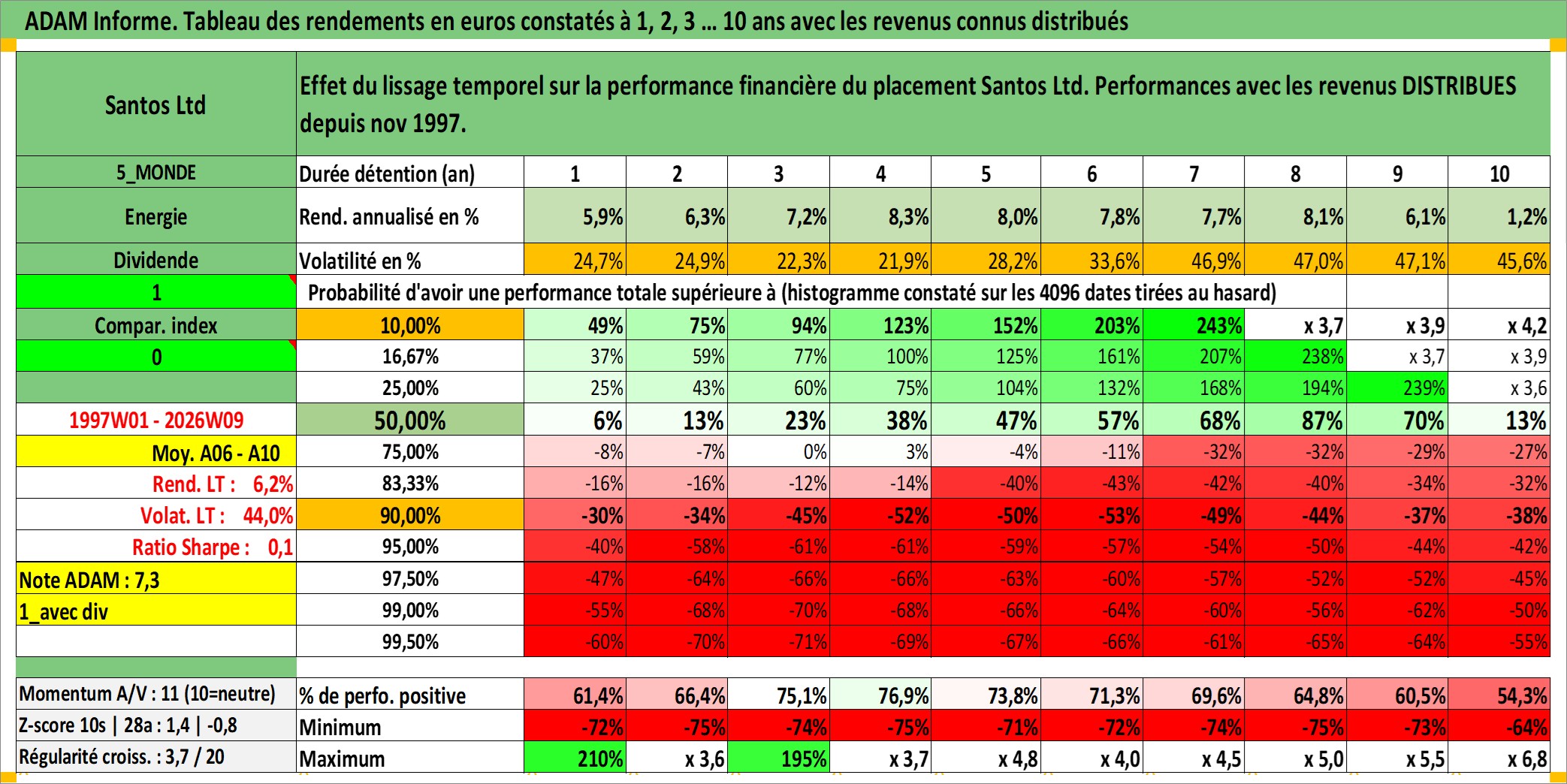 Site dédié aux investisseursPage dédiée sur site financeAnalyse des valorisations hebdomadaires de l'action Santos Ltd. Cet actif est cote en AUD. Les valorisations sont en contrevaleur EURO et couvrent les semaines 1997W01 a 2026W09. Les revenus de cet actif financier sont pris en compte depuis la semaine 1997W46. La note globale ESG de cet actif est estimee a 2.0 (apres rebasage entre 0 et 20).