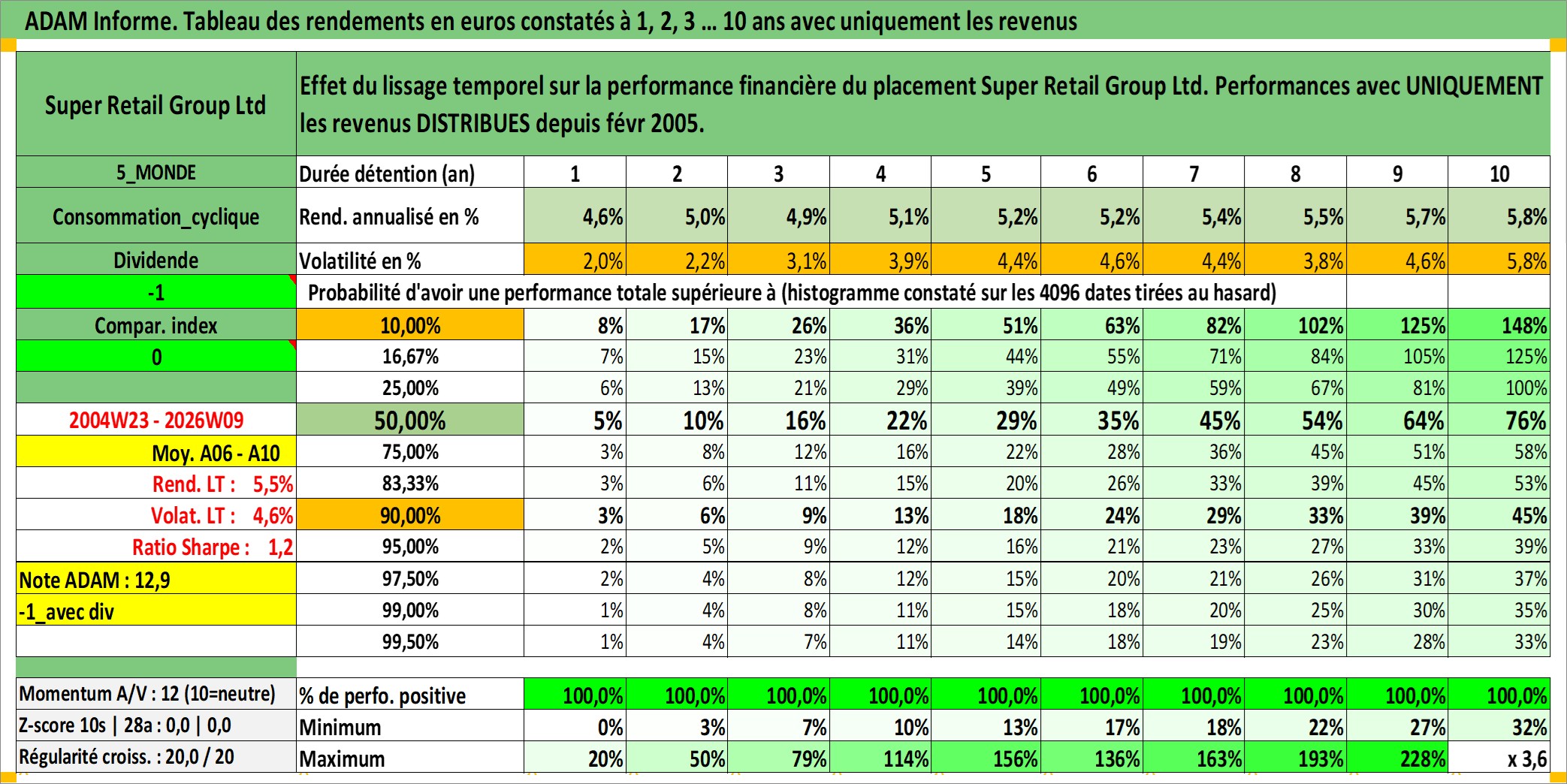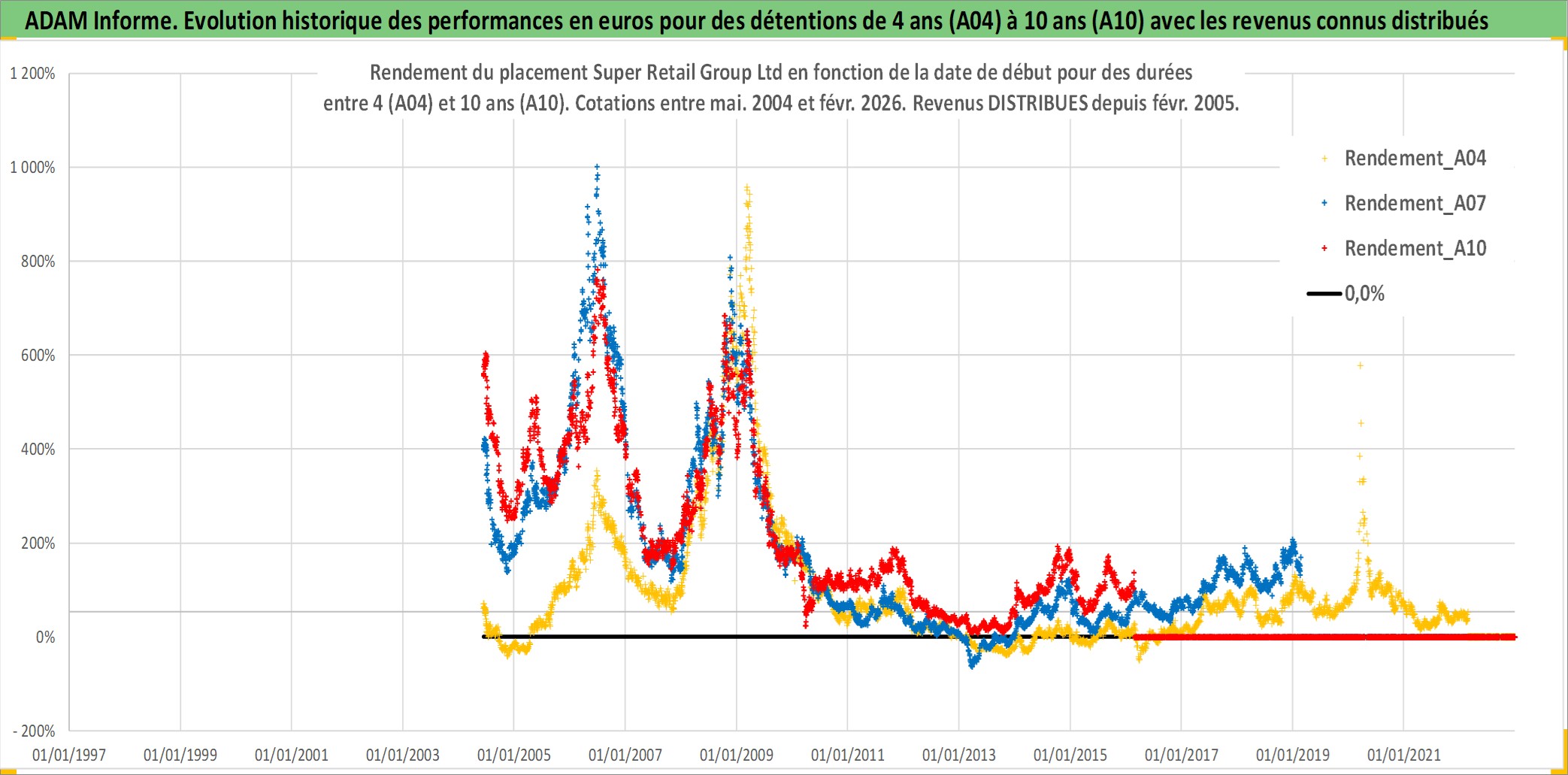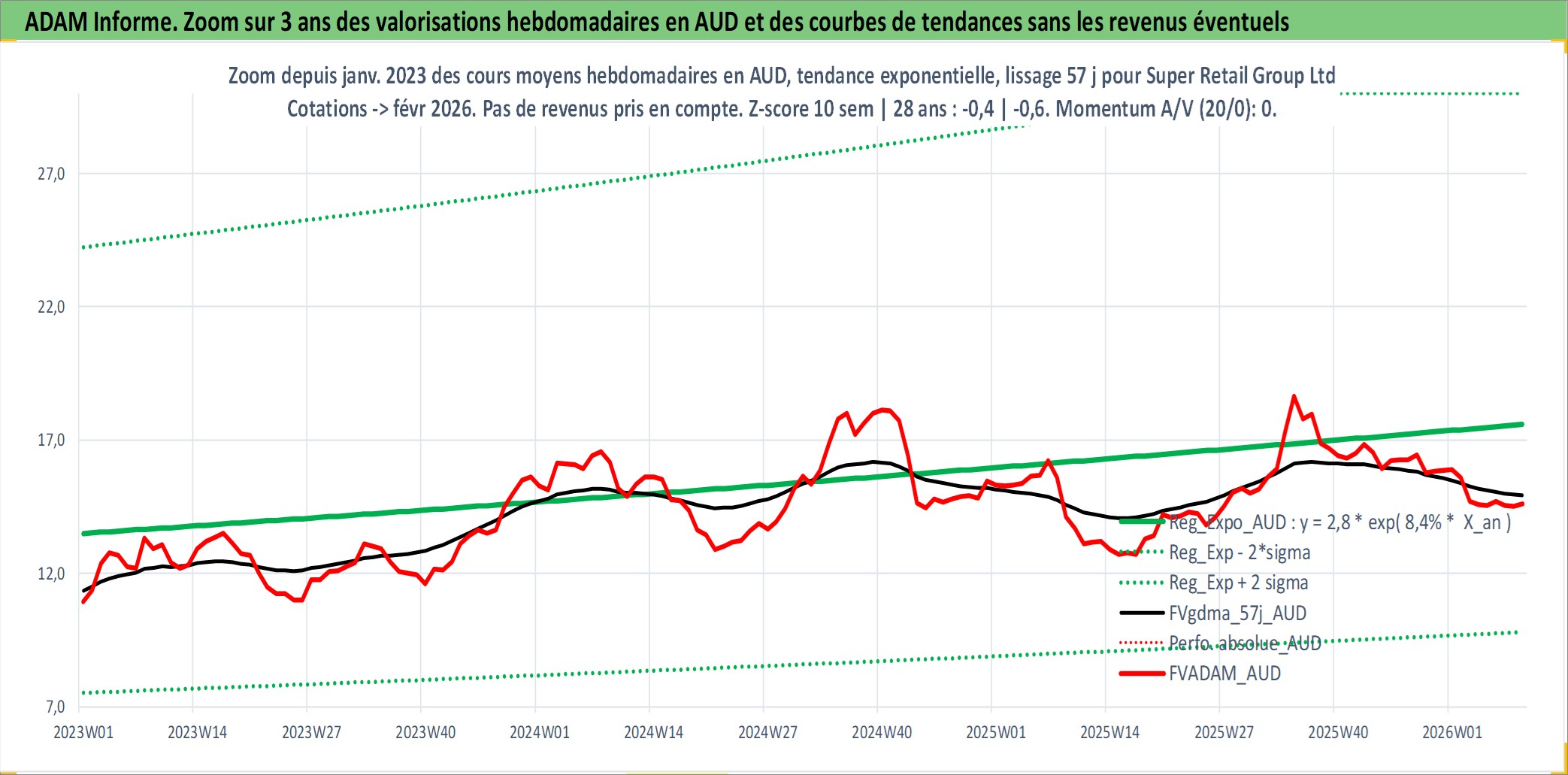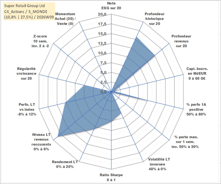 Site dédié aux investisseursPage dédiée sur site financeAnalyse des valorisations hebdomadaires de l'action Super Retail Group Ltd. Cet actif est cote en AUD. Les valorisations sont en contrevaleur EURO et couvrent les semaines 2004W23 a 2026W09. Les revenus de cet actif financier sont pris en compte depuis la semaine 2005W08. La note ESG de cet actif n'est pas connue.