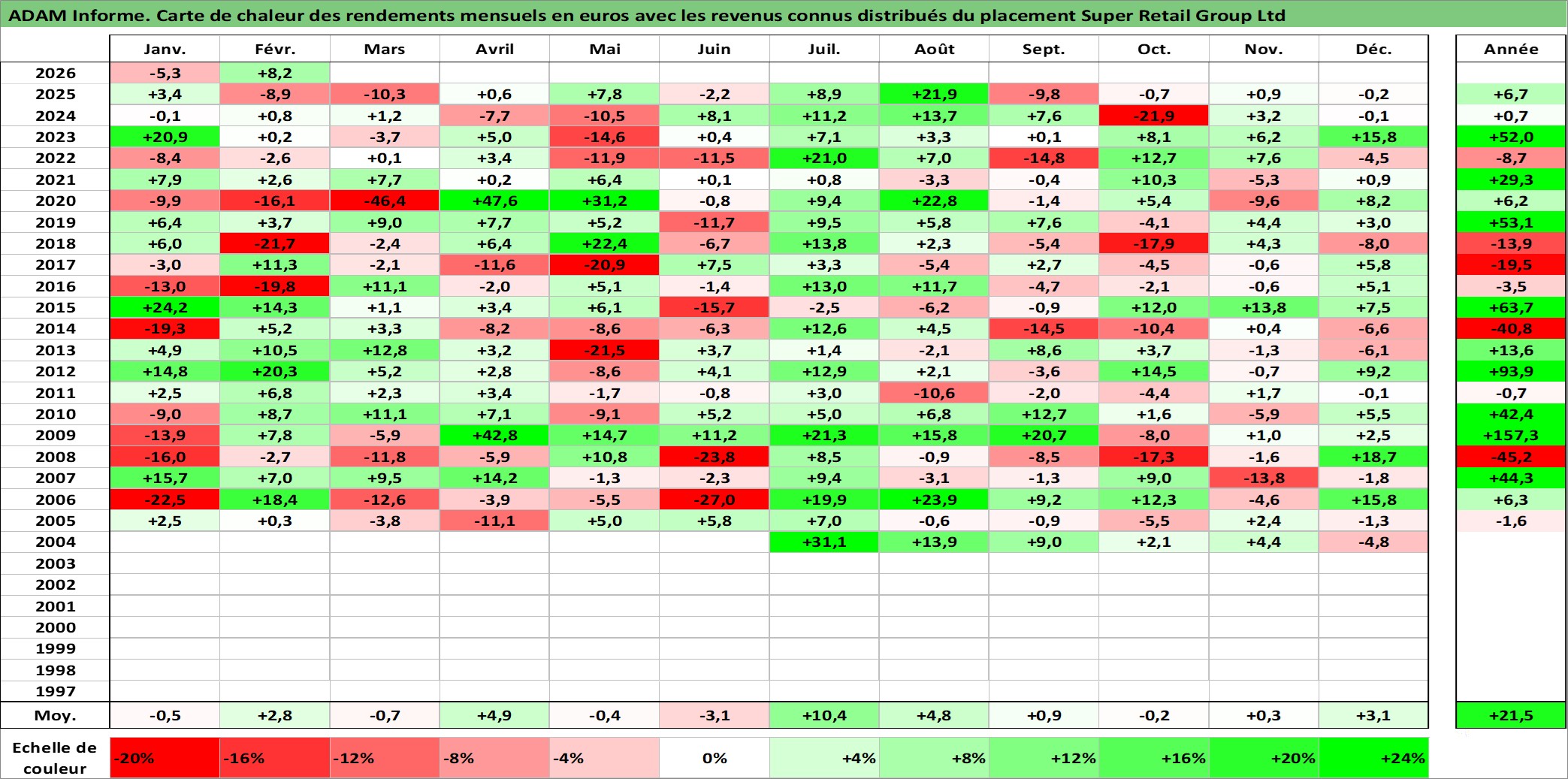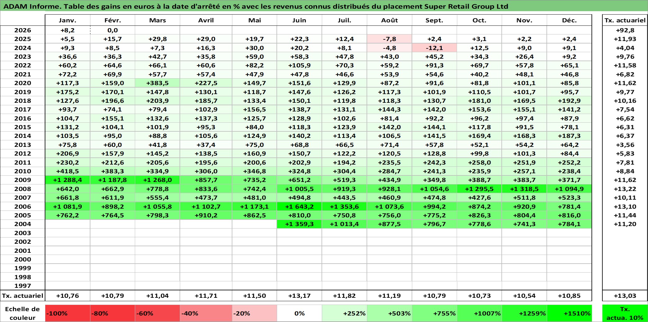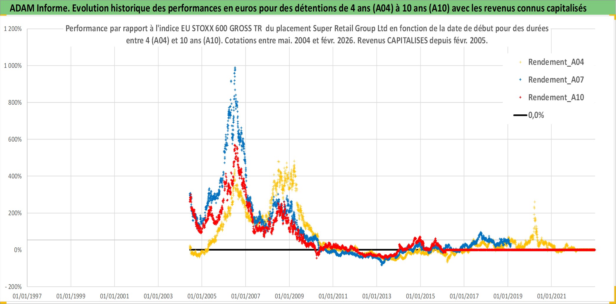 Site dédié aux investisseursPage dédiée sur site financeAnalyse des valorisations hebdomadaires de l'action Super Retail Group Ltd. Cet actif est cote en AUD. Les valorisations sont en contrevaleur EURO et couvrent les semaines 2004W23 a 2026W09. Les revenus de cet actif financier sont pris en compte depuis la semaine 2005W08. La note ESG de cet actif n'est pas connue.