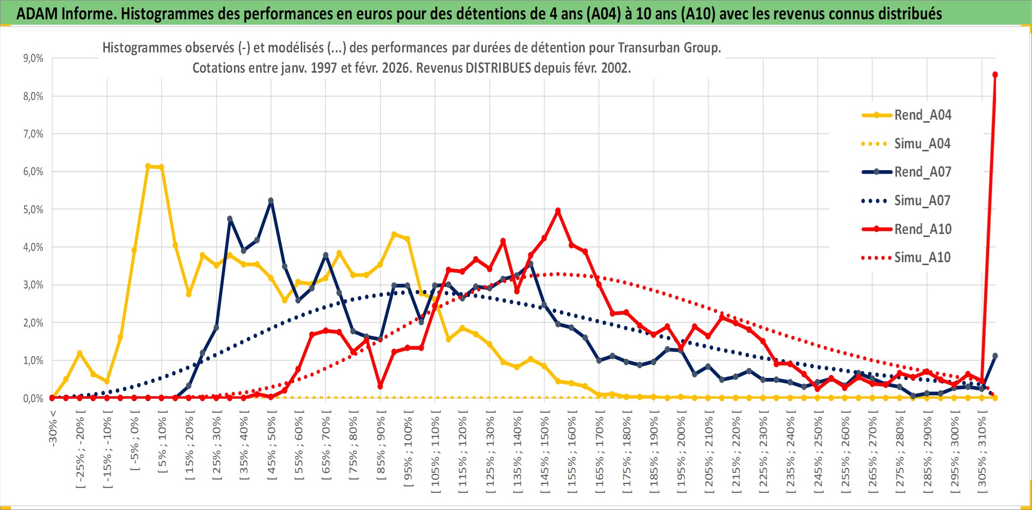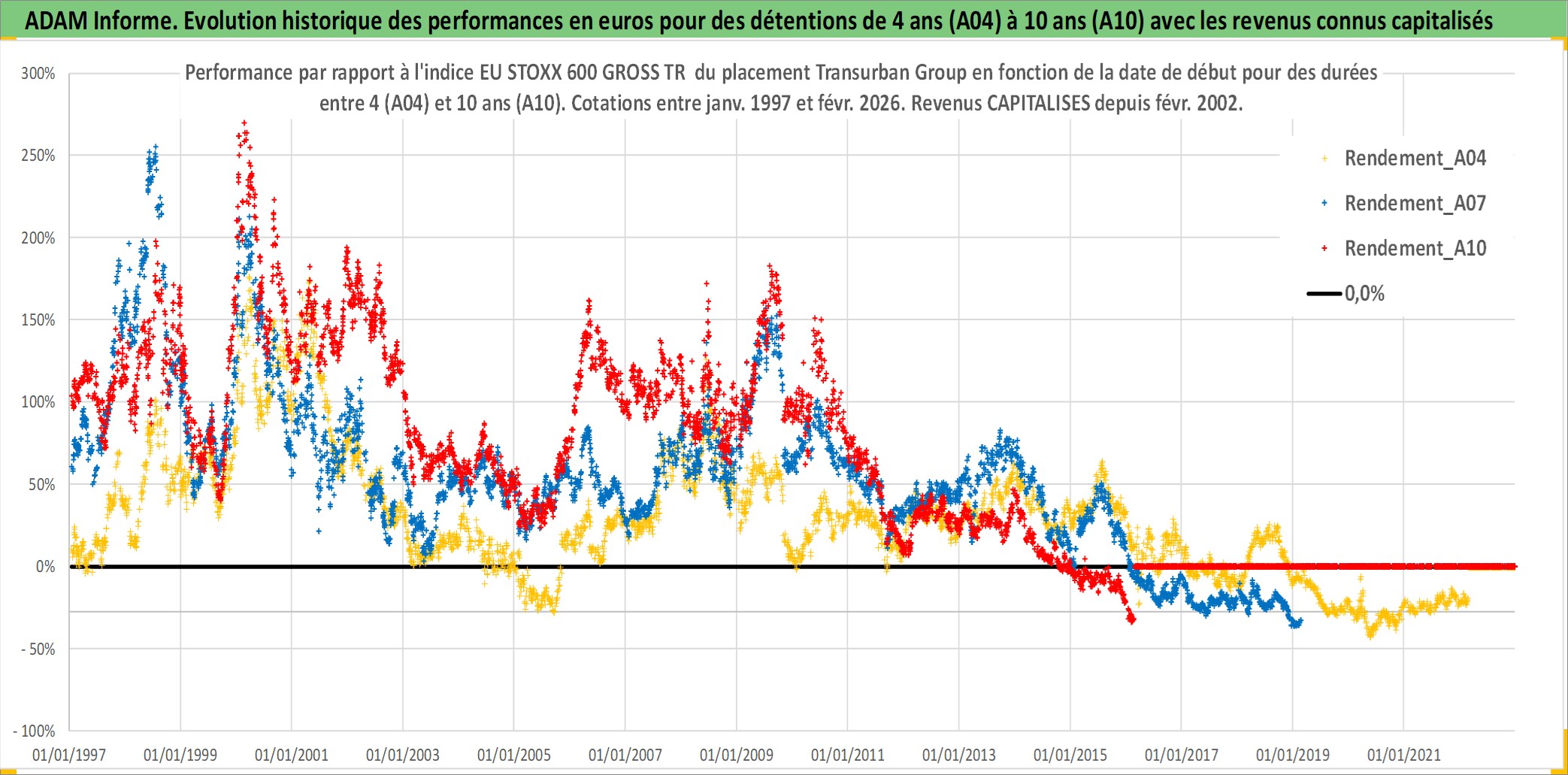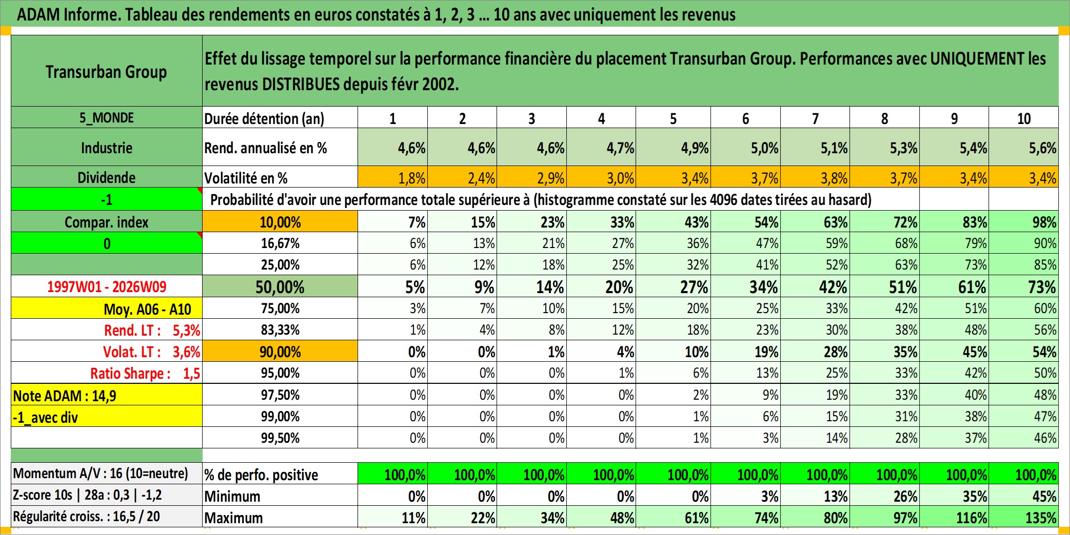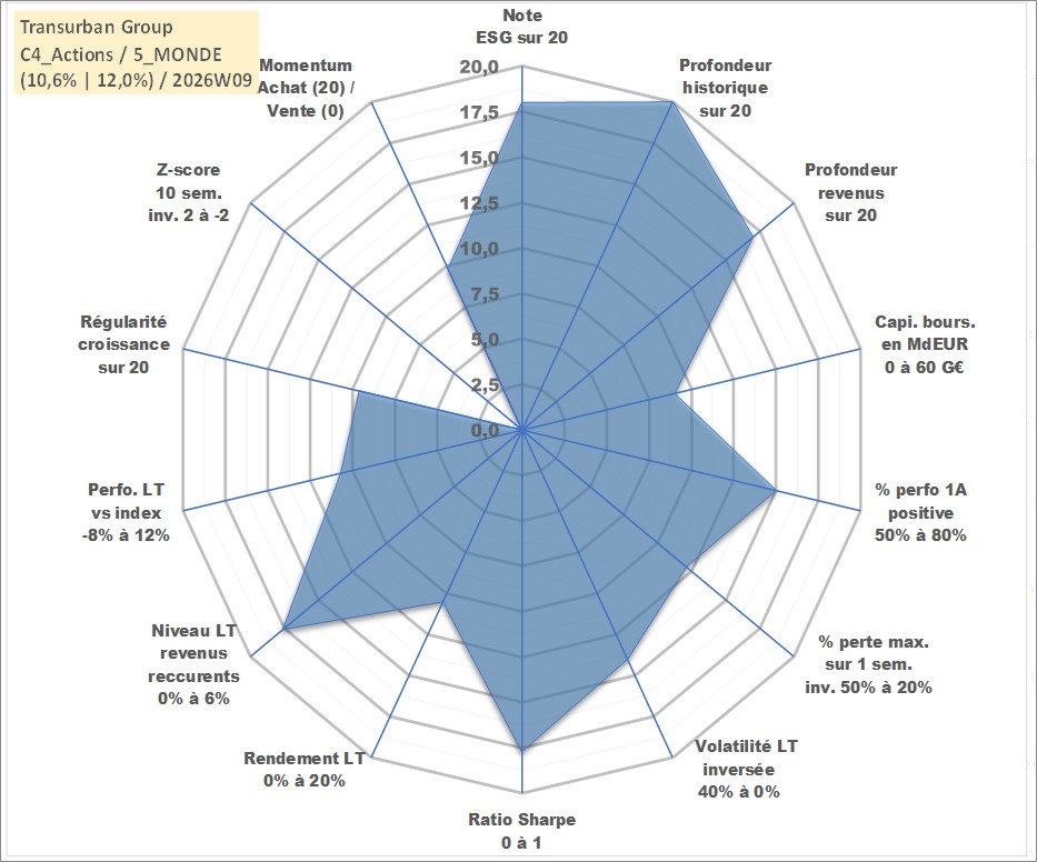 Site dédié aux investisseursPage dédiée sur site financeAnalyse des valorisations hebdomadaires de l'action Transurban Group. Cet actif est cote en AUD. Les valorisations sont en contrevaleur EURO et couvrent les semaines 1997W01 a 2026W09. Les revenus de cet actif financier sont pris en compte depuis la semaine 2002W06. La note globale ESG de cet actif est estimee a 18.0 (apres rebasage entre 0 et 20).