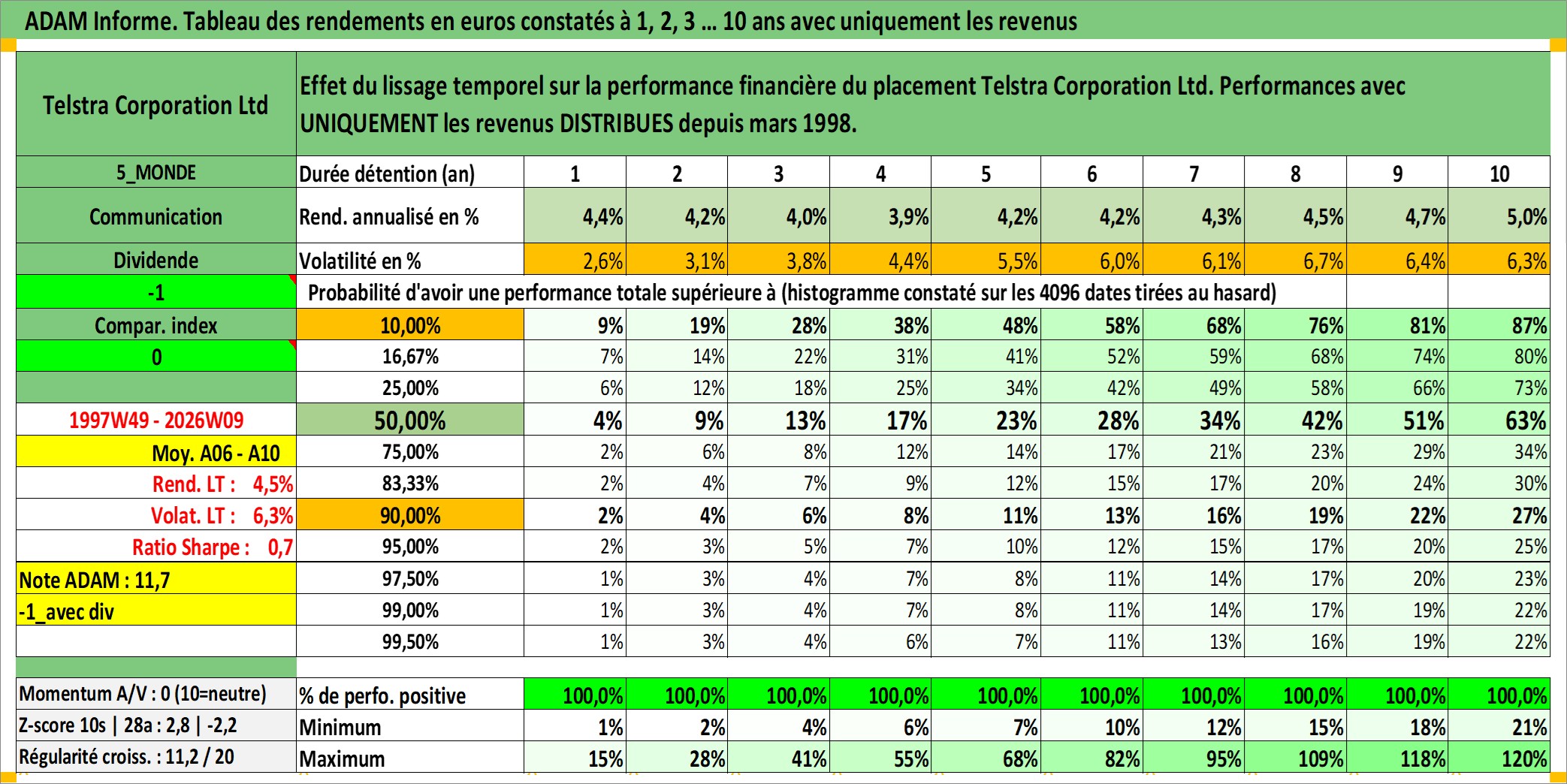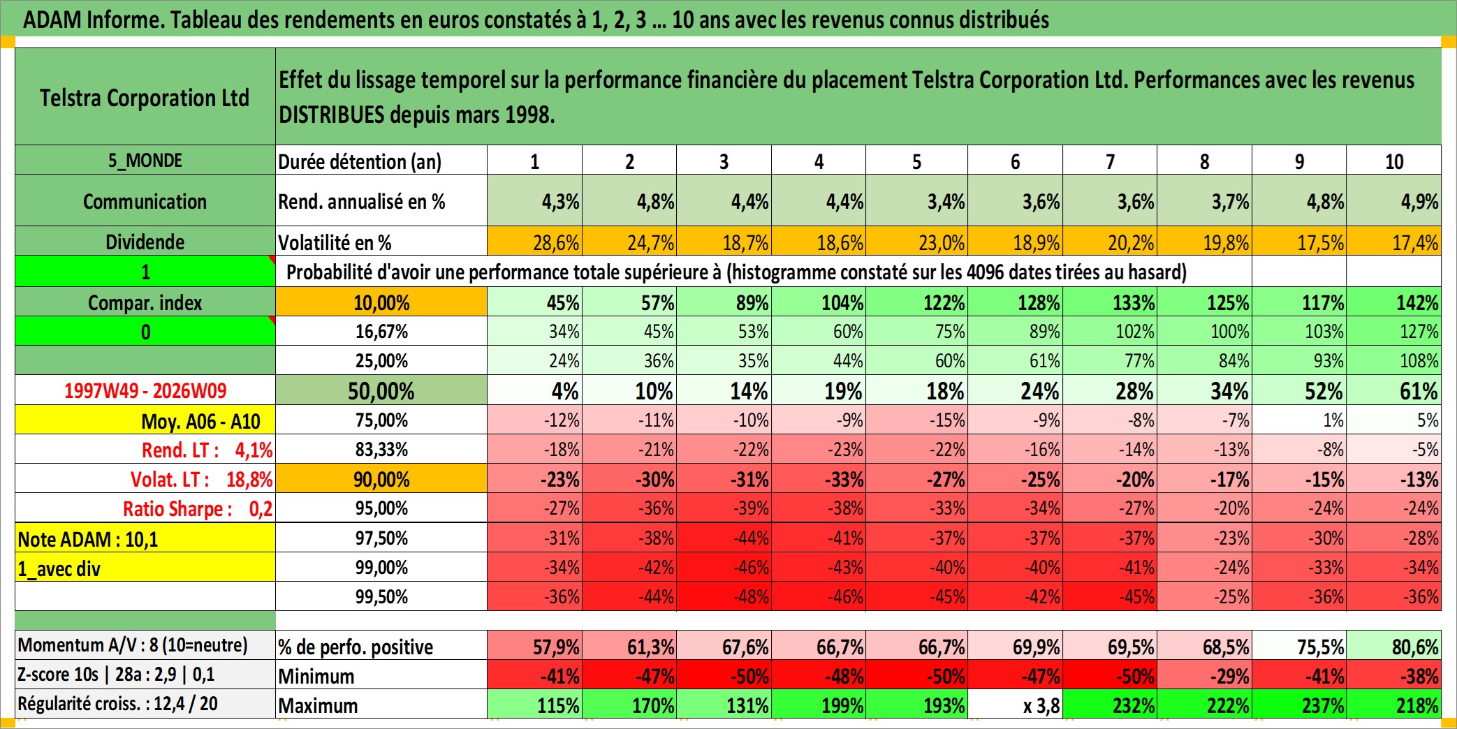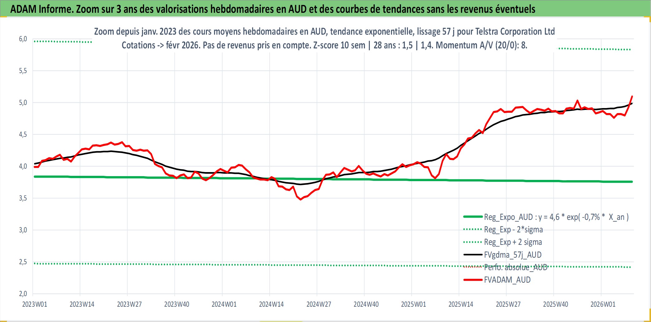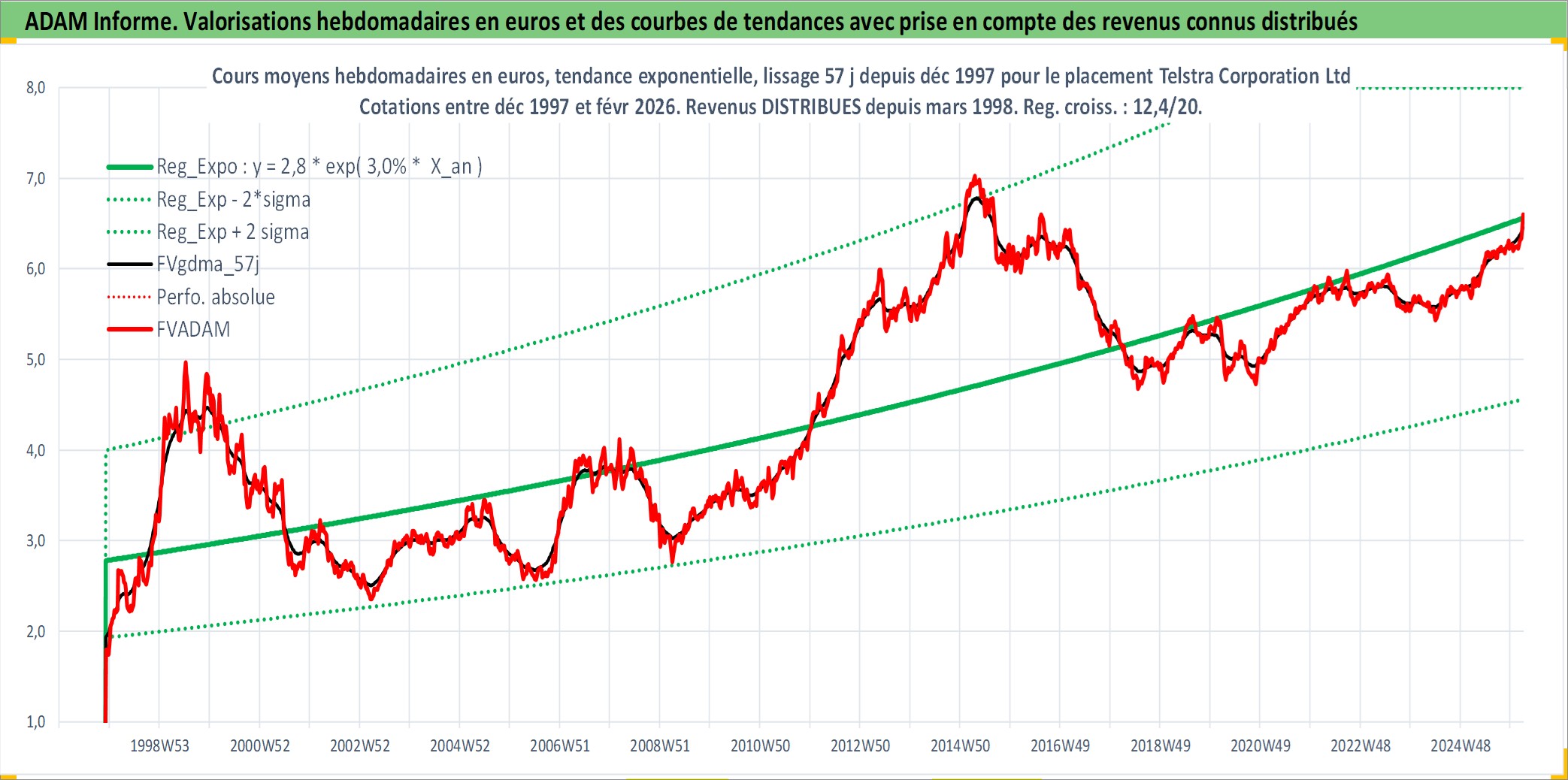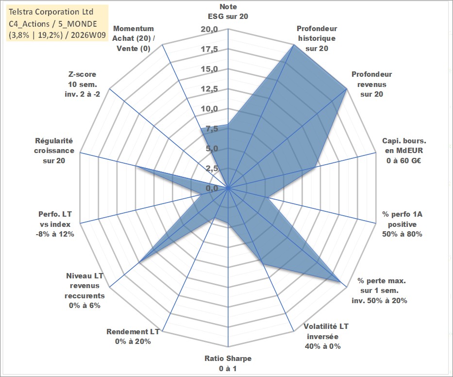 Site dédié aux investisseursPage dédiée sur site financeAnalyse des valorisations hebdomadaires de l'action Telstra Corporation Ltd. Cet actif est cote en AUD. Les valorisations sont en contrevaleur EURO et couvrent les semaines 1997W49 a 2026W09. Les revenus de cet actif financier sont pris en compte depuis la semaine 1998W09. La note globale ESG de cet actif est estimee a 8.0 (apres rebasage entre 0 et 20).