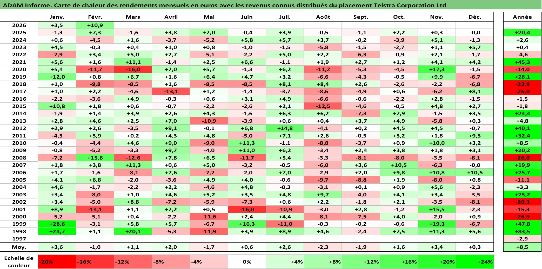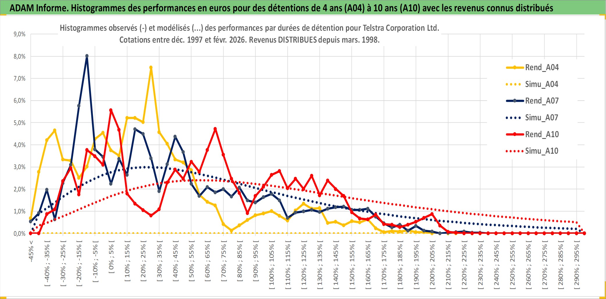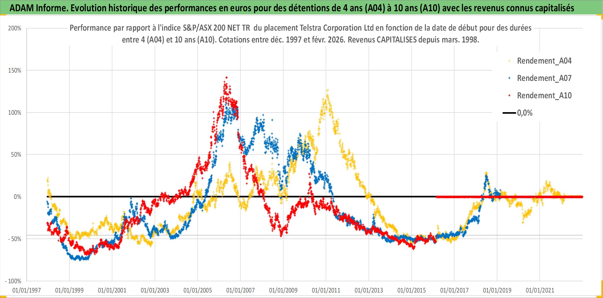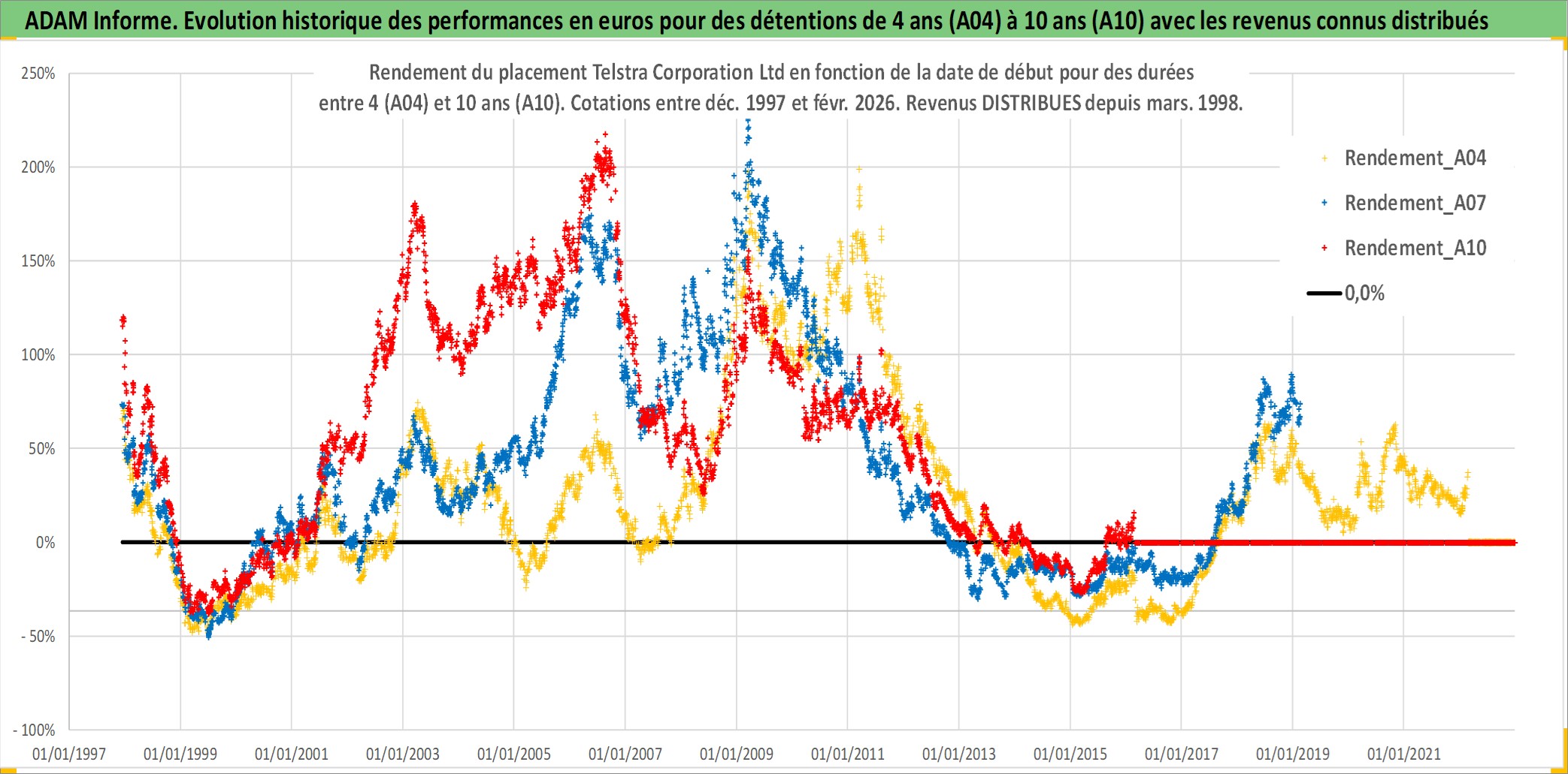 Site dédié aux investisseursPage dédiée sur site financeAnalyse des valorisations hebdomadaires de l'action Telstra Corporation Ltd. Cet actif est cote en AUD. Les valorisations sont en contrevaleur EURO et couvrent les semaines 1997W49 a 2026W09. Les revenus de cet actif financier sont pris en compte depuis la semaine 1998W09. La note globale ESG de cet actif est estimee a 8.0 (apres rebasage entre 0 et 20).
