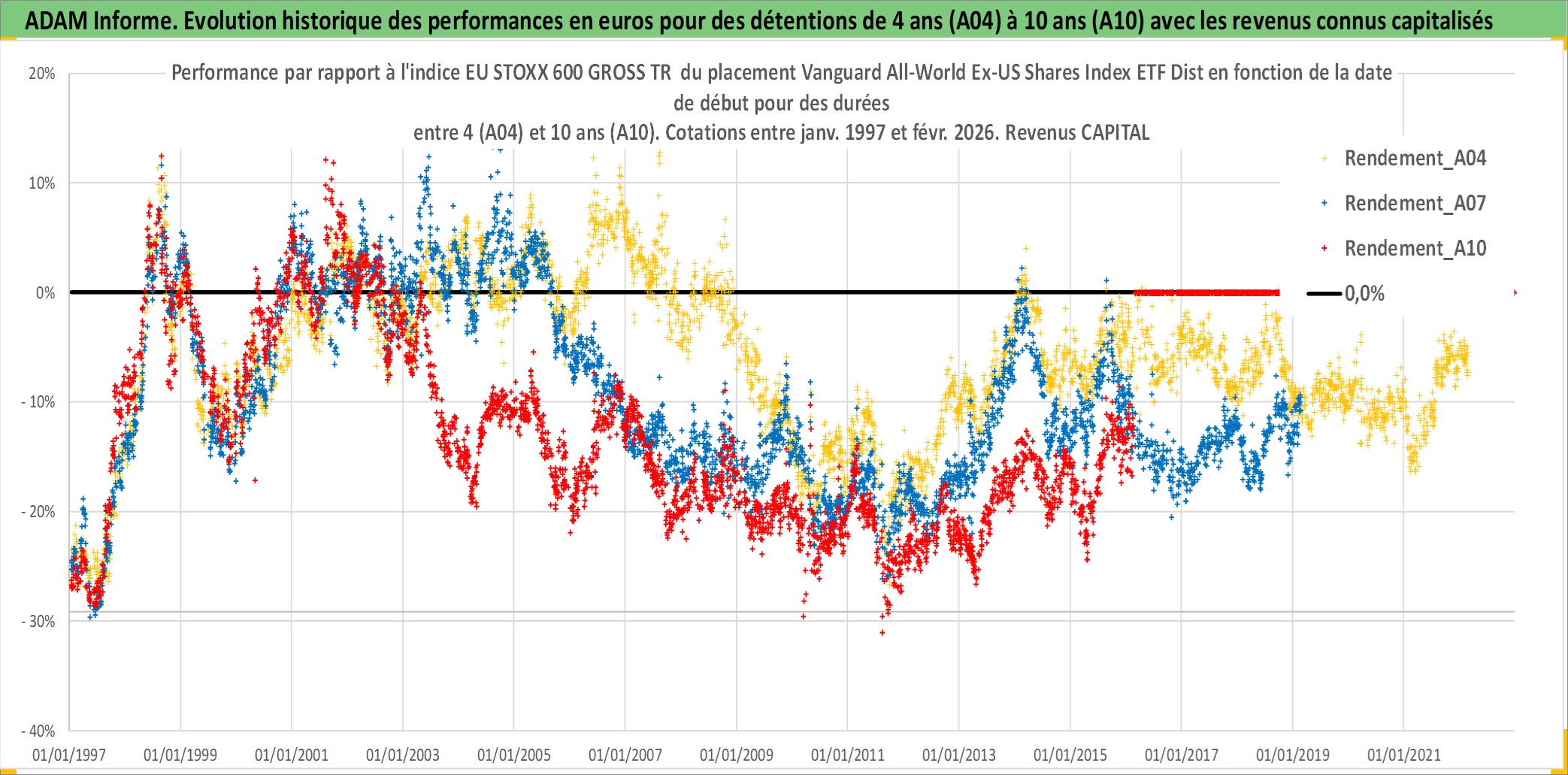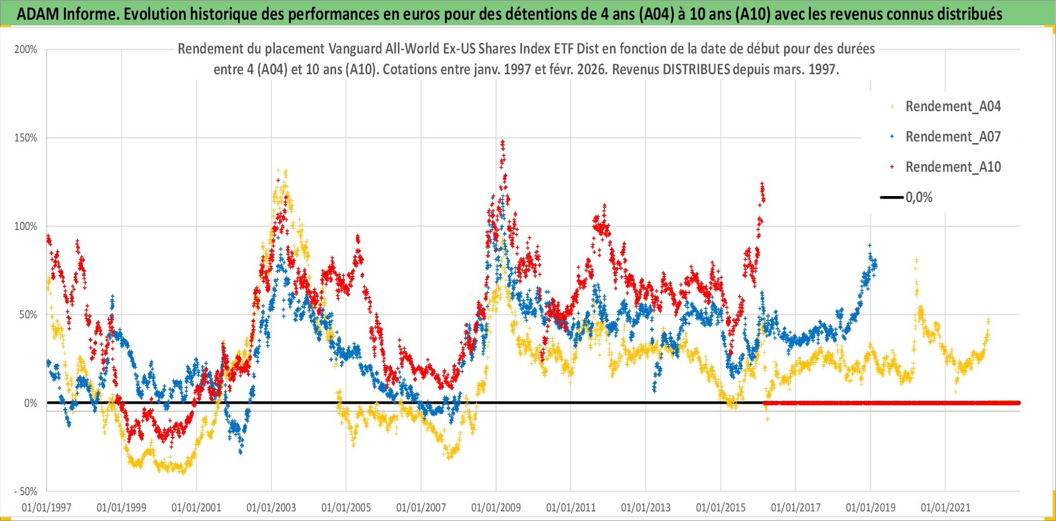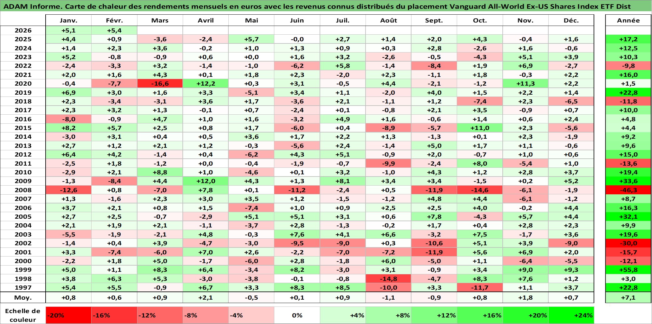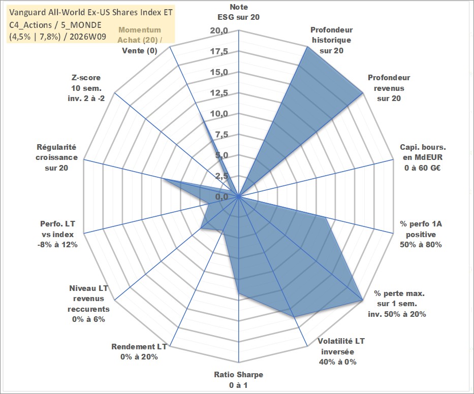 Site dédié aux investisseursPage dédiée sur site financeAnalyse des valorisations hebdomadaires du fonds Vanguard All-World Ex-US Shares Index ETF Dist. Cet actif est cote en AUD. Les valorisations sont en contrevaleur EURO et couvrent les semaines 1997W01 a 2026W09. Les revenus de cet actif financier sont pris en compte depuis la semaine 1997W12. La note ESG de cet actif n'est pas connue.