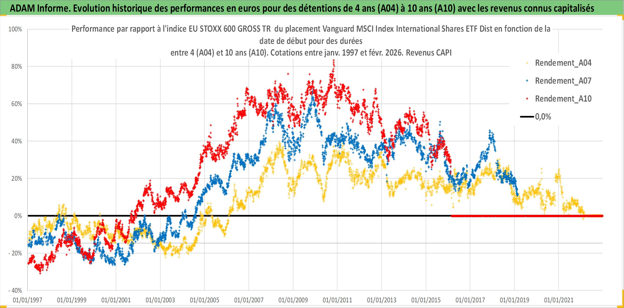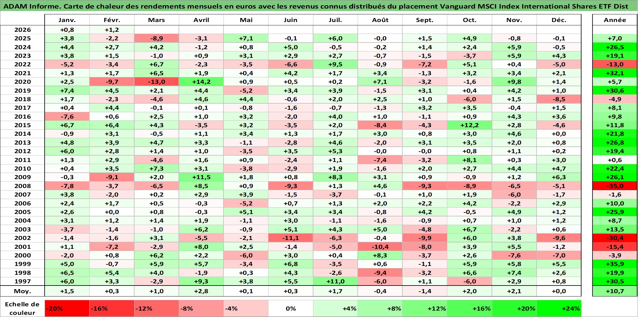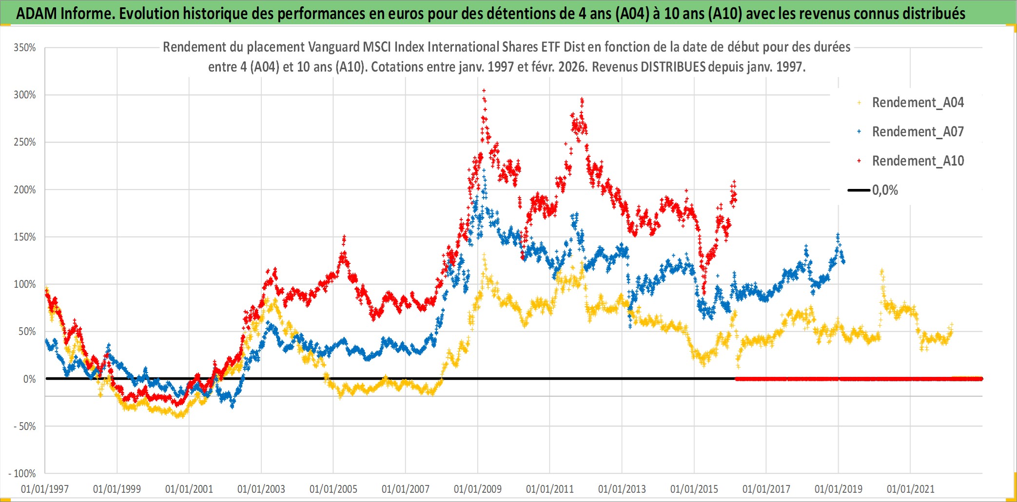Site dédié aux investisseursPage dédiée sur site financeAnalyse des valorisations hebdomadaires du fonds Vanguard MSCI Index International Shares ETF Dist. Cet actif est cote en AUD. Les valorisations sont en contrevaleur EURO et couvrent les semaines 1997W01 a 2026W09. Les revenus de cet actif financier sont pris en compte depuis la semaine 1997W02. La note ESG de cet actif n'est pas connue.