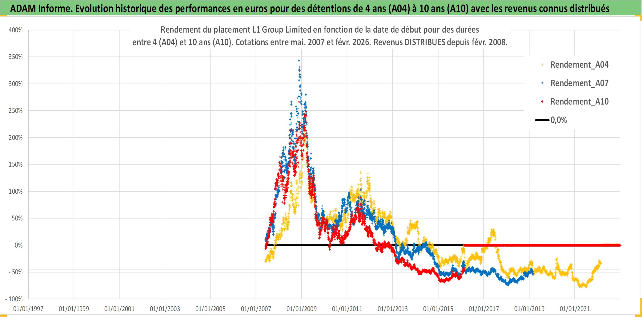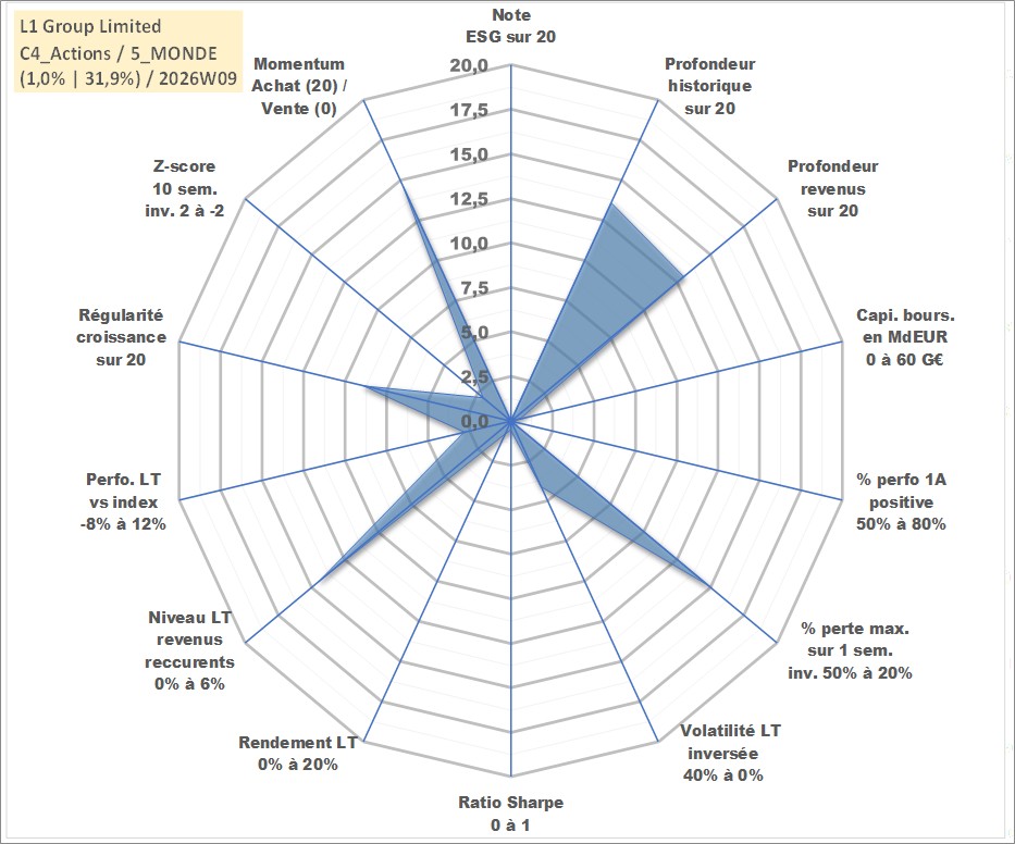 Site dédié aux investisseursPage dédiée sur site financeAnalyse des valorisations hebdomadaires de l'action L1 Group Limited. Cet actif est cote en AUD. Les valorisations sont en contrevaleur EURO et couvrent les semaines 2007W21 a 2026W09. Les revenus de cet actif financier sont pris en compte depuis la semaine 2008W08. La note ESG de cet actif n'est pas connue.