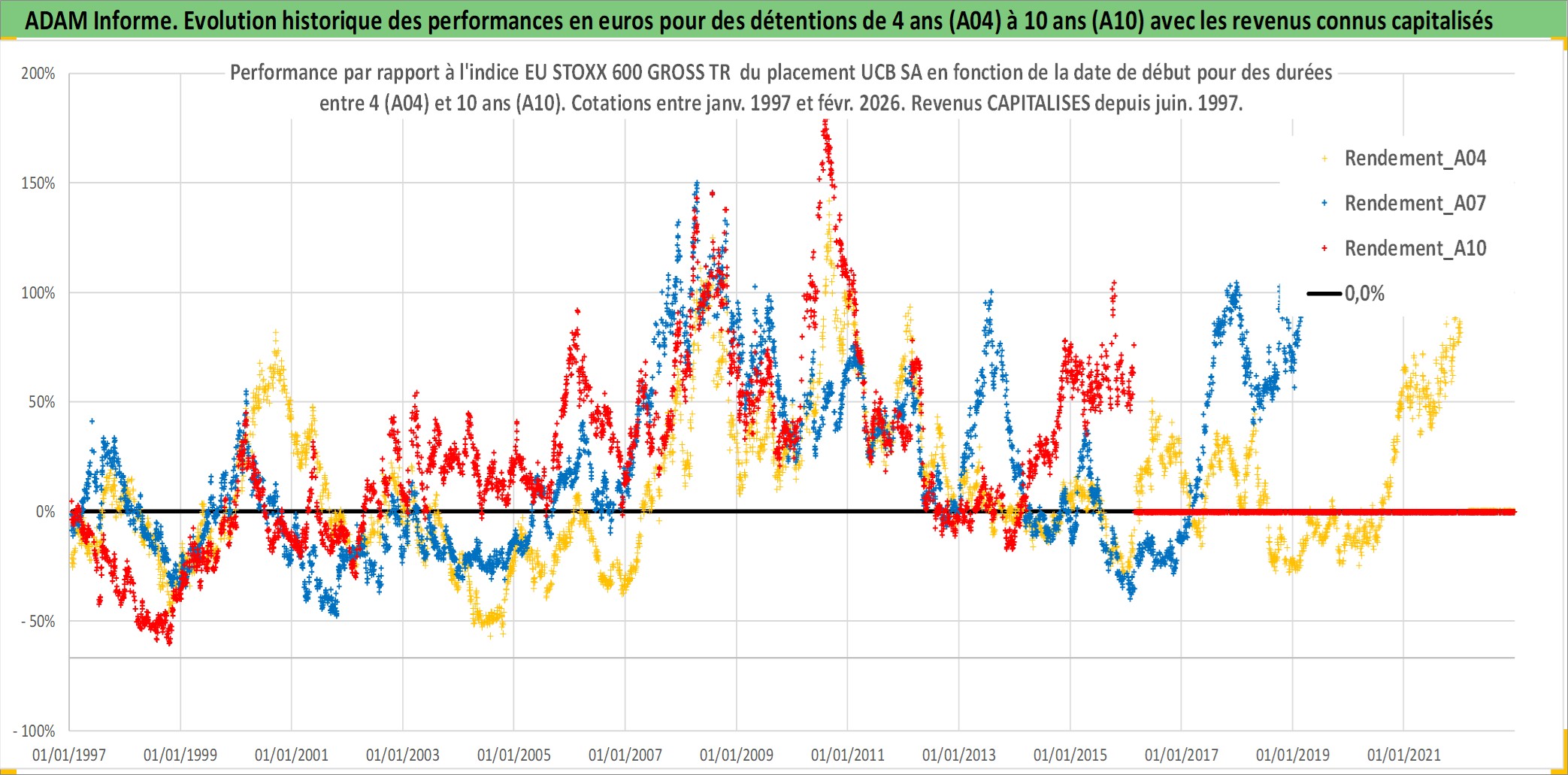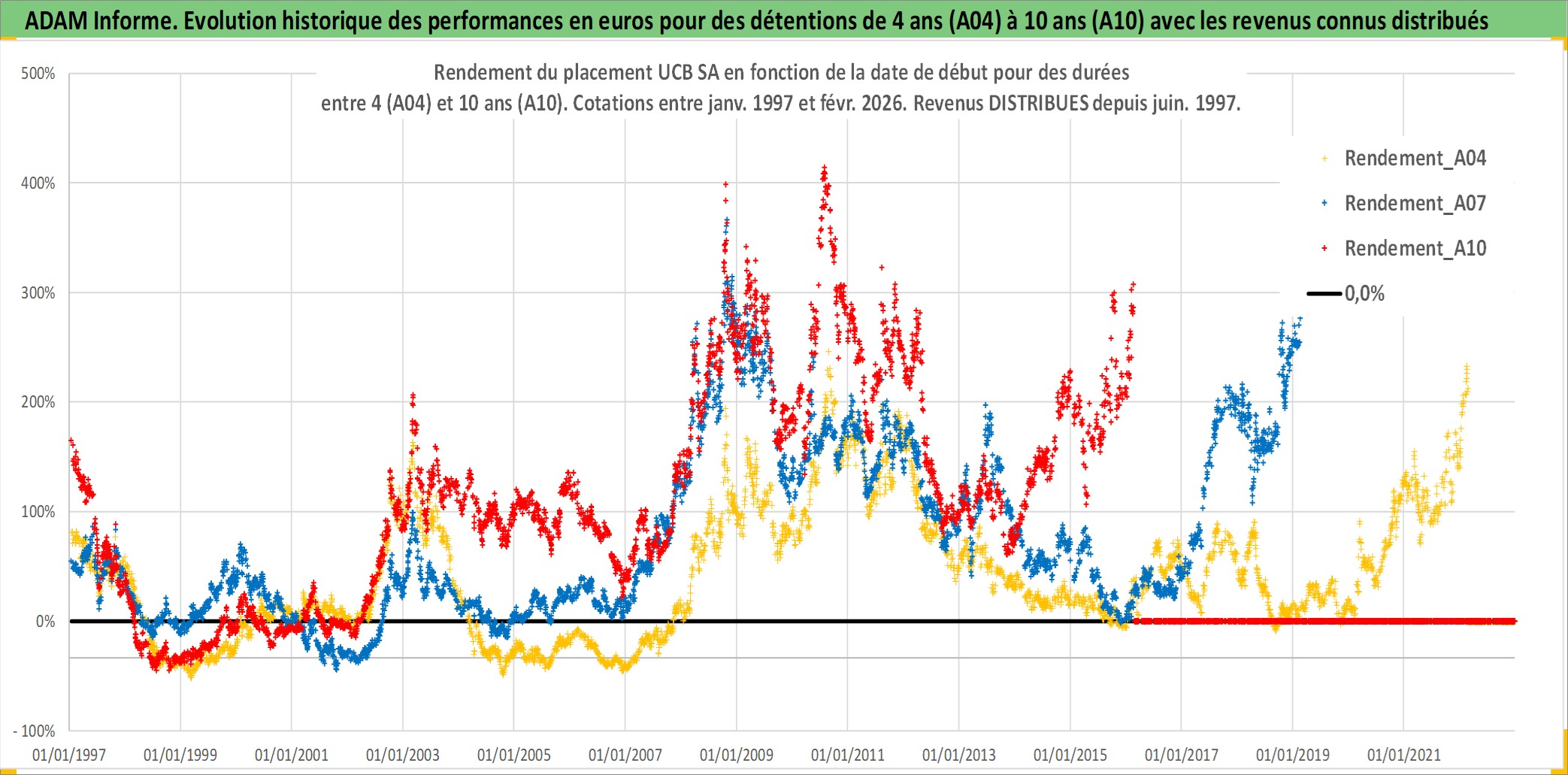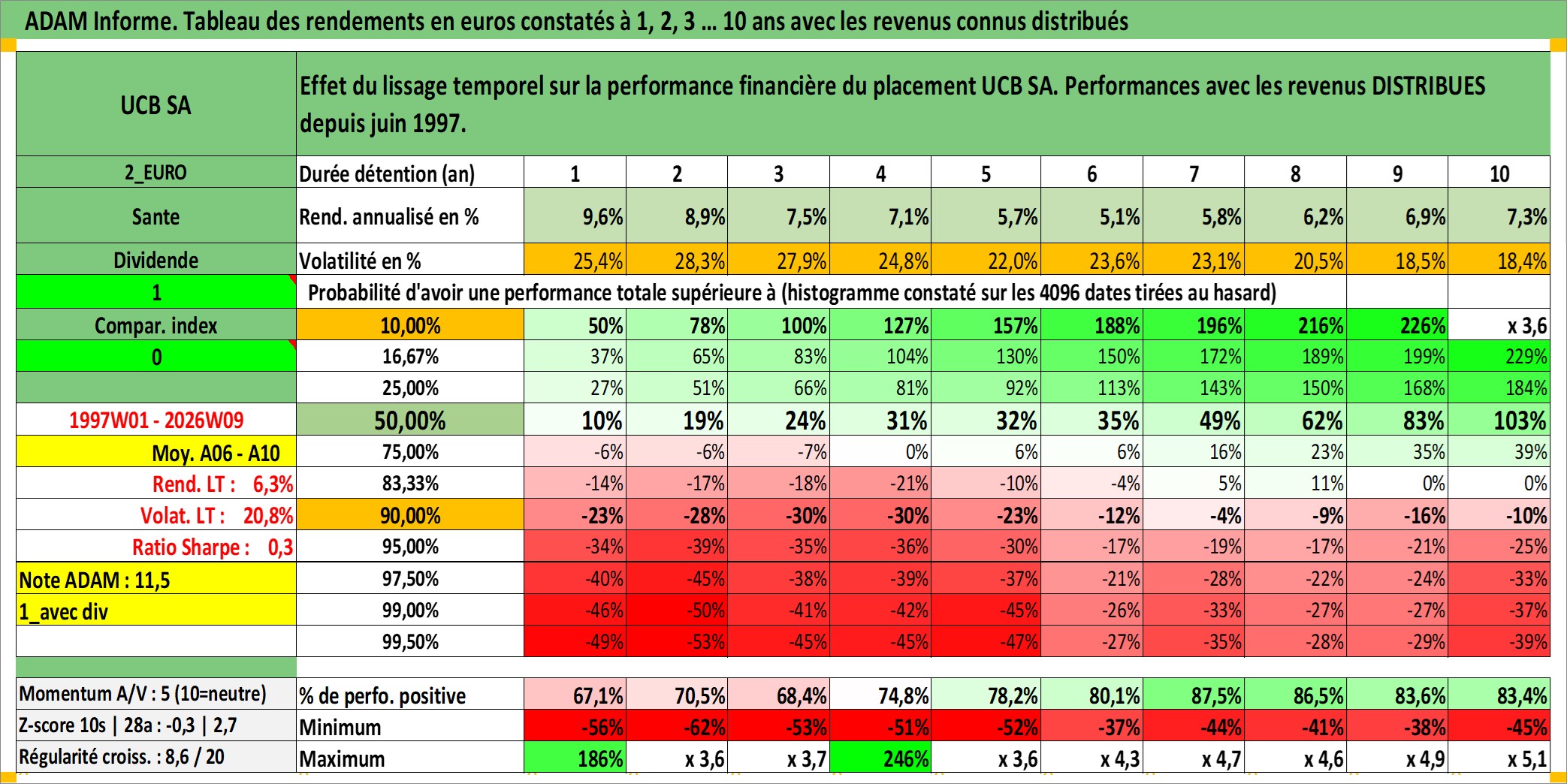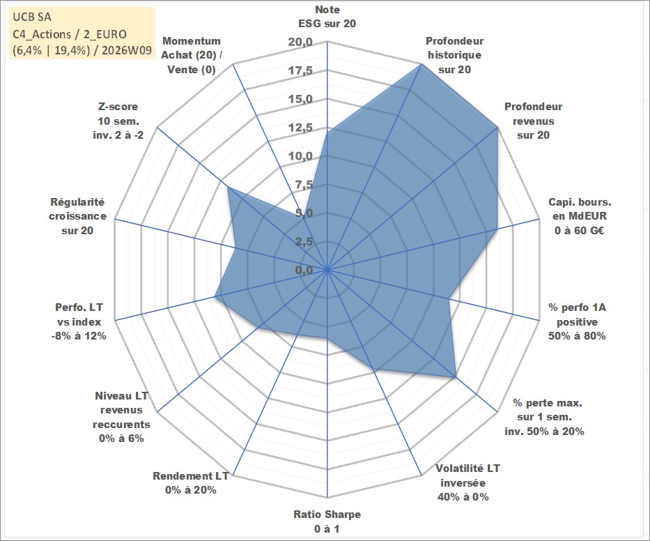Site dédié aux investisseursPage dédiée sur site financeAnalyse des valorisations hebdomadaires de l'action UCB SA. Cet actif est cote en EUR. Les valorisations couvrent les semaines 1997W01 a 2026W09. Les revenus de cet actif financier sont pris en compte depuis la semaine 1997W26. La note globale ESG de cet actif est estimee a 12.0 (apres rebasage entre 0 et 20).