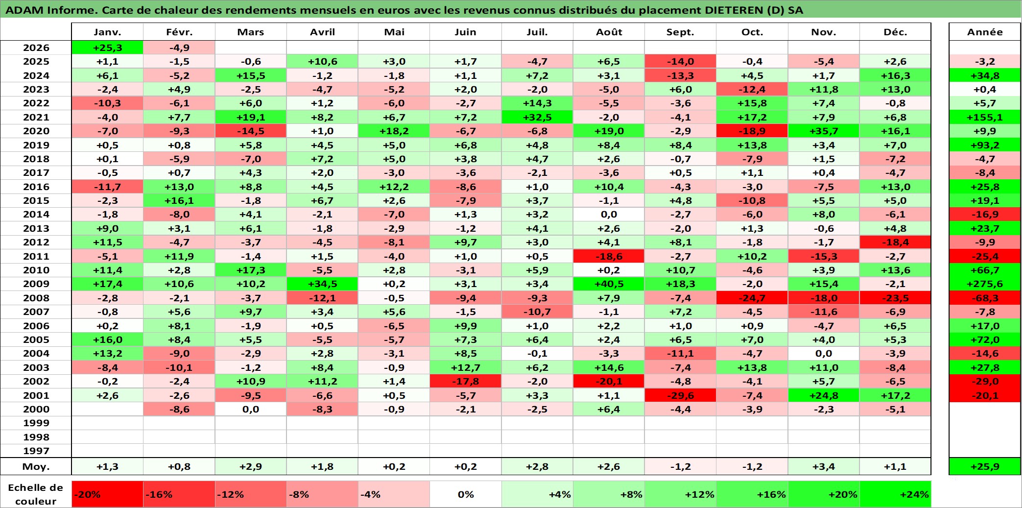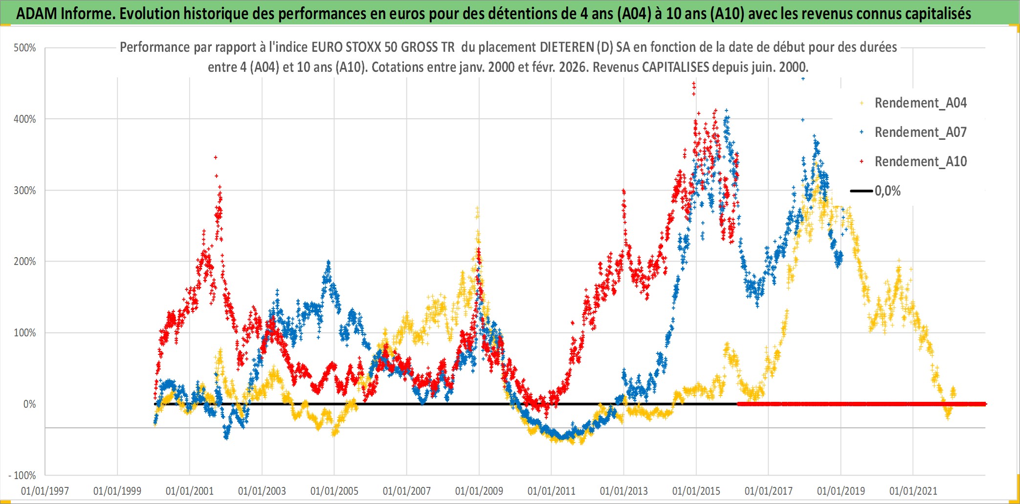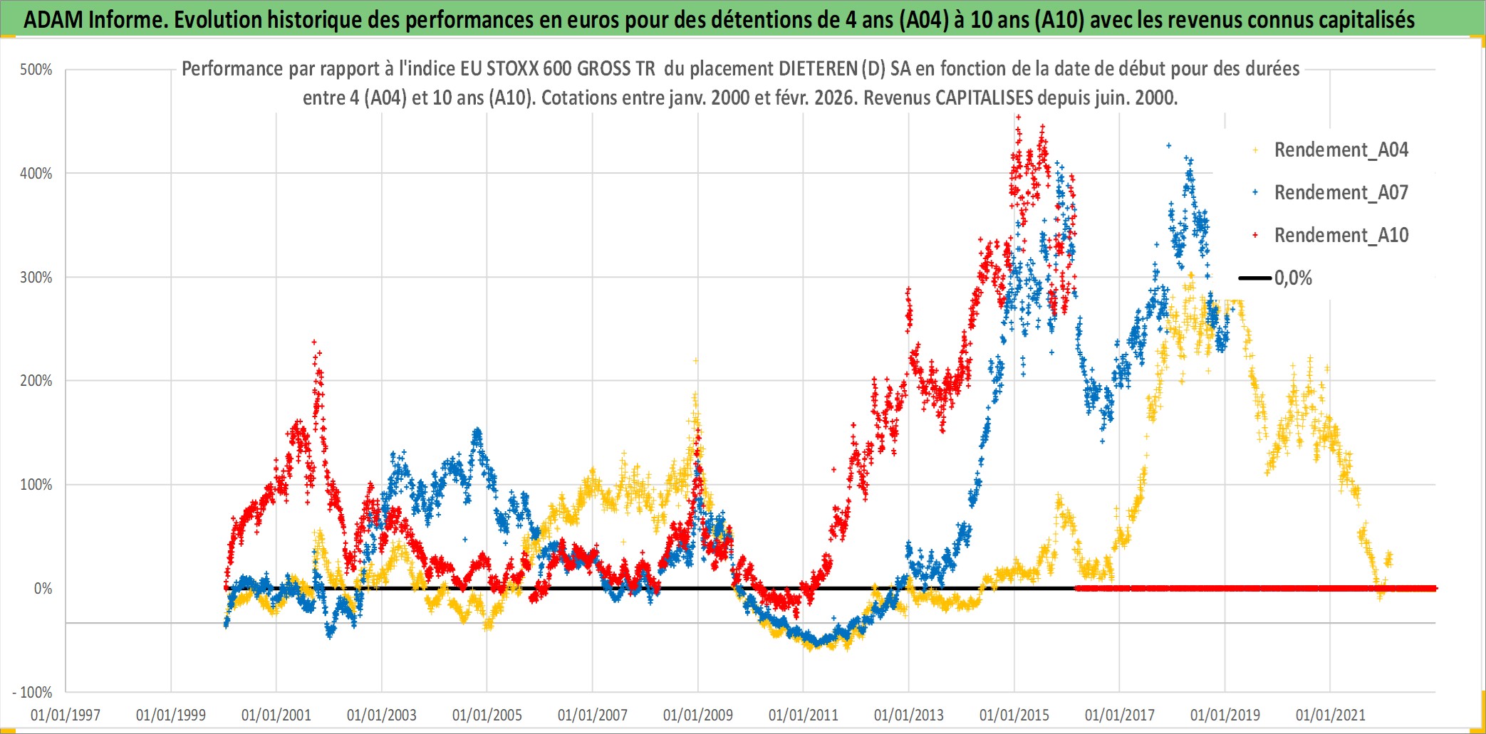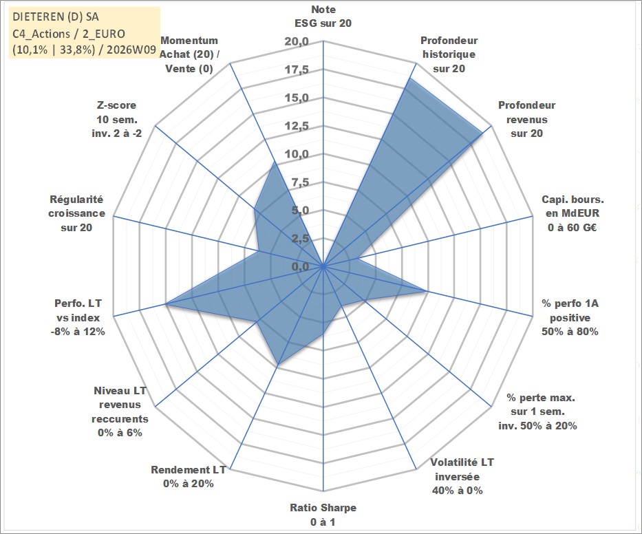 Site dédié aux investisseursPage dédiée sur site financeAnalyse des valorisations hebdomadaires de l'action DIETEREN (D) SA. Cet actif est cote en EUR. Les valorisations couvrent les semaines 2000W01 a 2026W09. Les revenus de cet actif financier sont pris en compte depuis la semaine 2000W24. La note ESG de cet actif n'est pas connue.