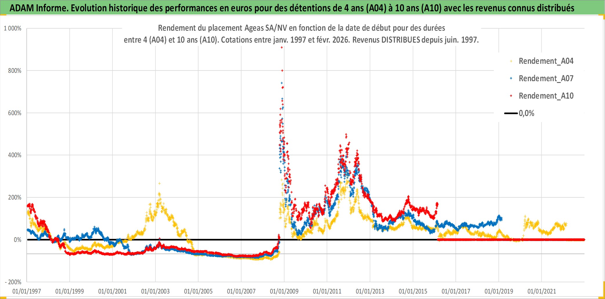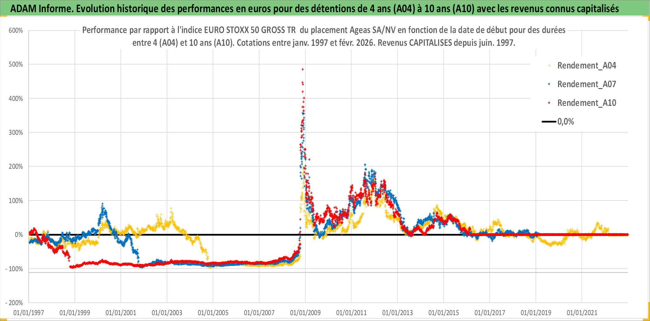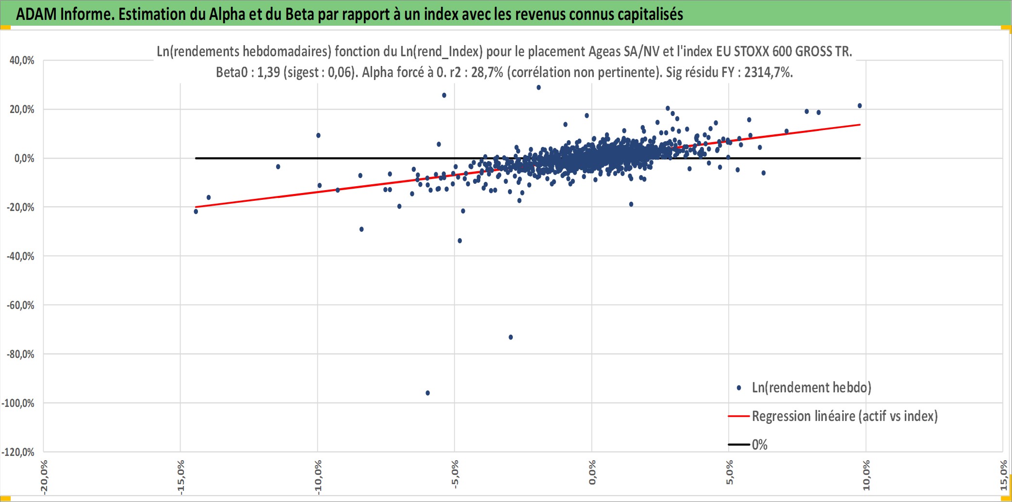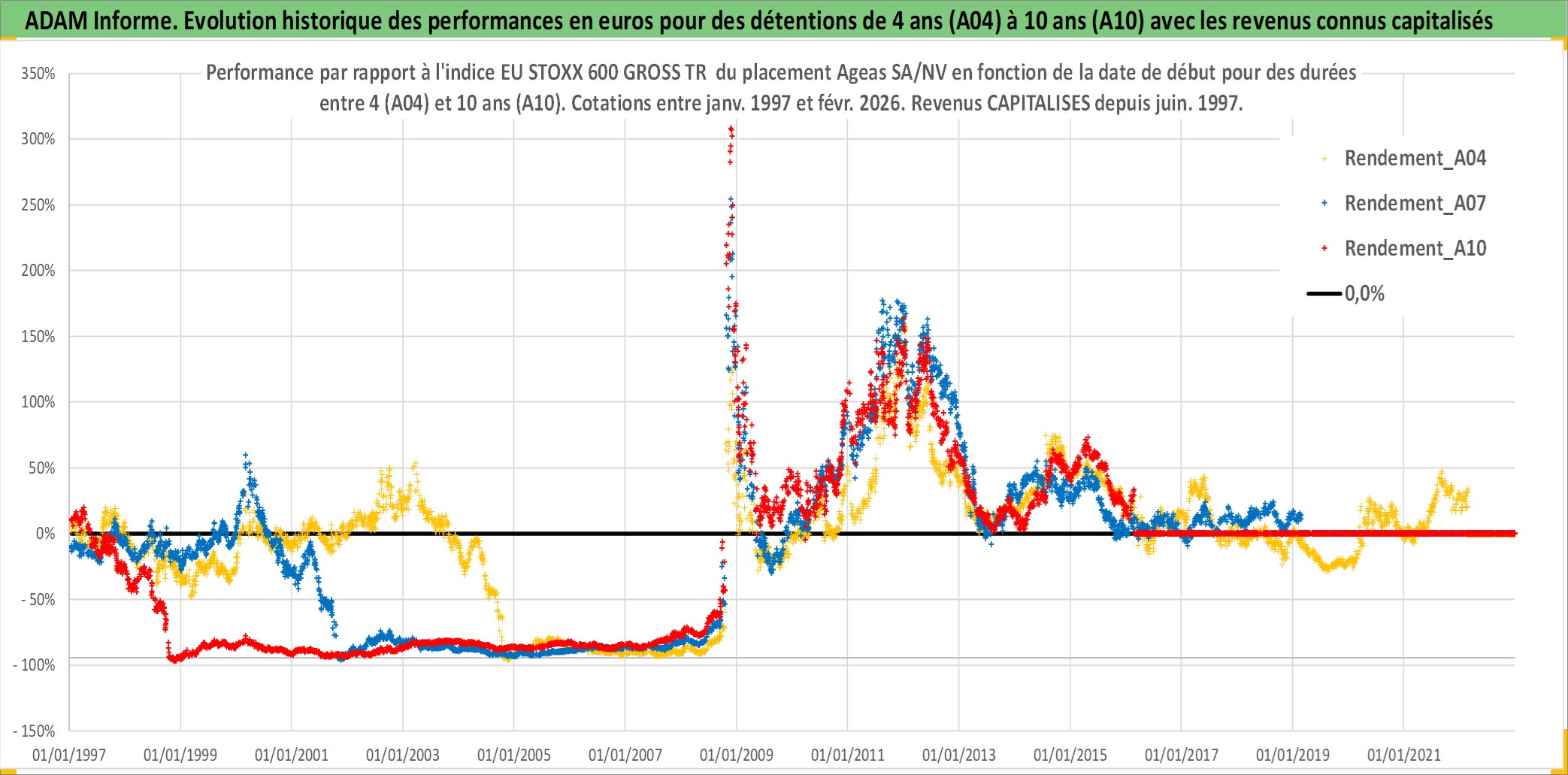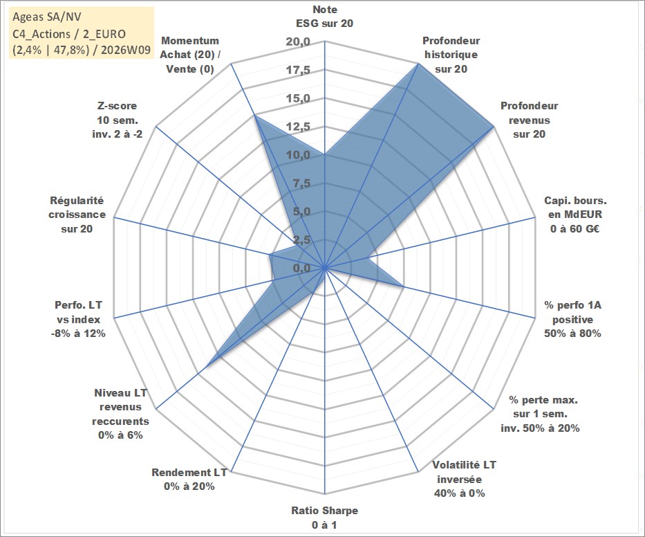 Site dédié aux investisseursPage dédiée sur site financeAnalyse des valorisations hebdomadaires de l'action Ageas SA/NV. Cet actif est cote en EUR. Les valorisations couvrent les semaines 1997W01 a 2026W09. Les revenus de cet actif financier sont pris en compte depuis la semaine 1997W24. La note globale ESG de cet actif est estimee a 10.0 (apres rebasage entre 0 et 20).