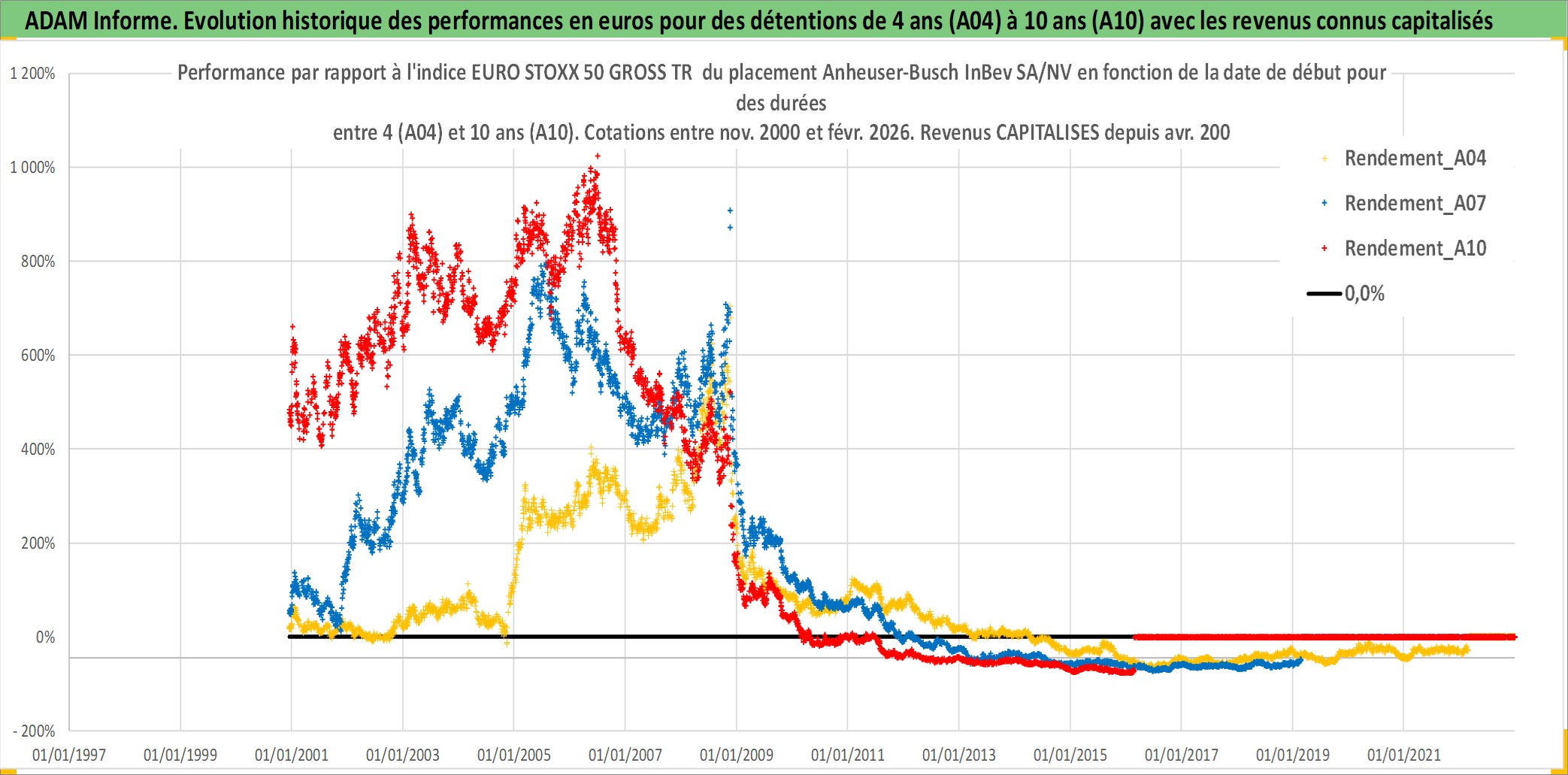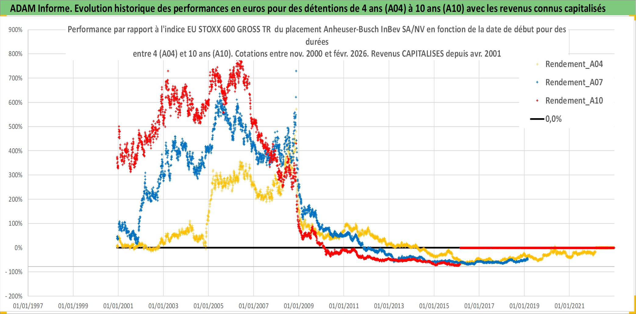 Site dédié aux investisseursPage dédiée sur site financeAnalyse des valorisations hebdomadaires de l'action Anheuser-Busch InBev SA/NV. Cet actif est cote en EUR. Les valorisations couvrent les semaines 2000W48 a 2026W09. Les revenus de cet actif financier sont pris en compte depuis la semaine 2001W17. La note globale ESG de cet actif est estimee a 10.0 (apres rebasage entre 0 et 20).
