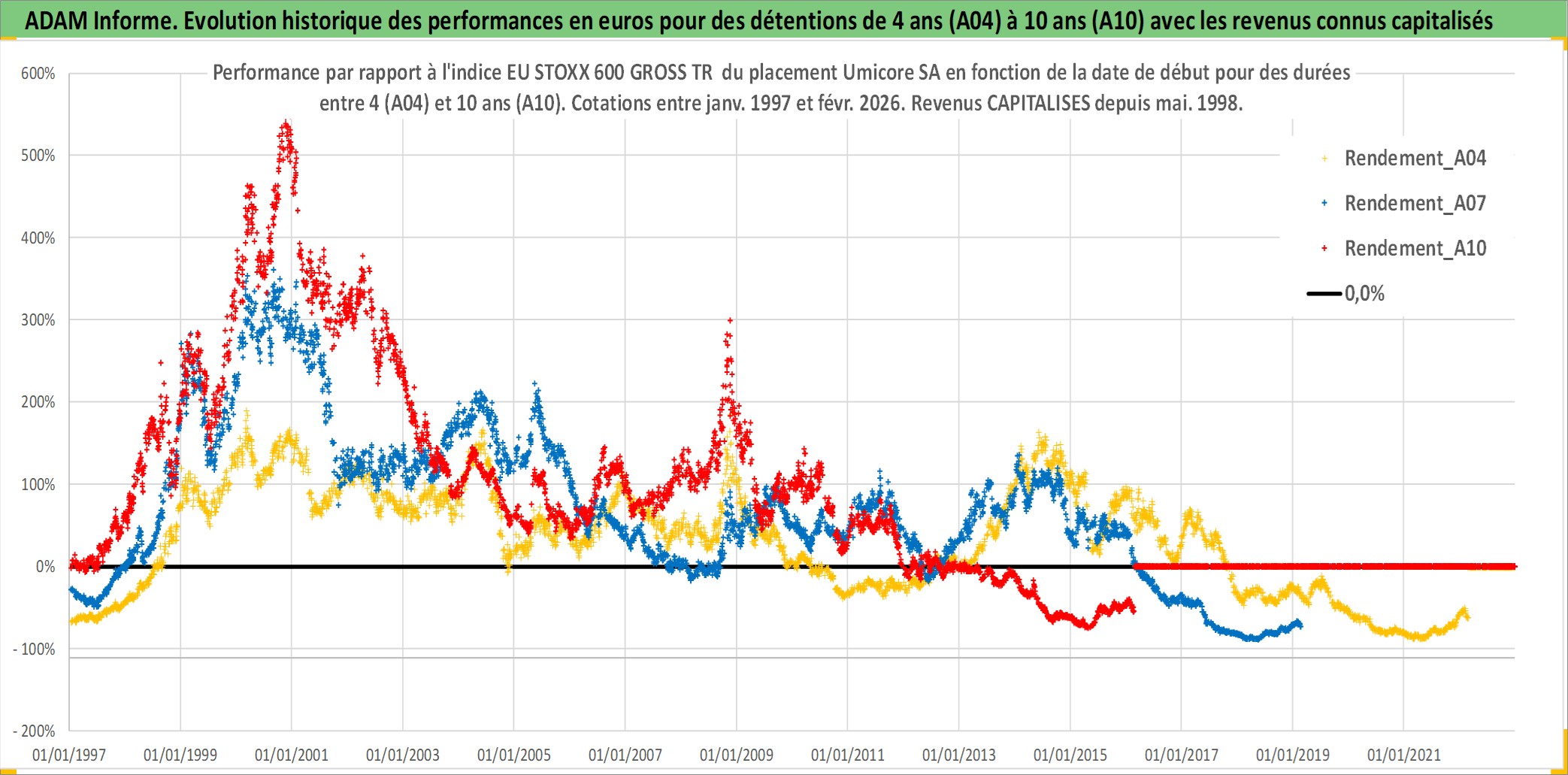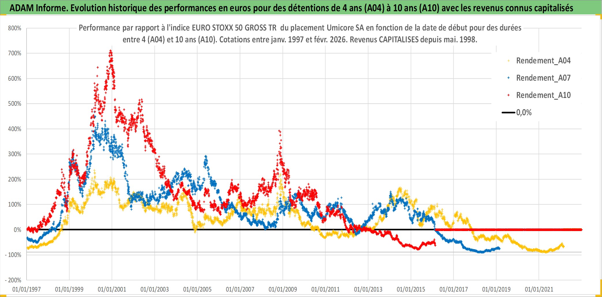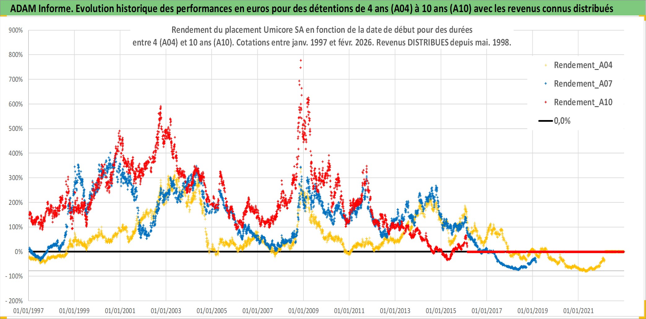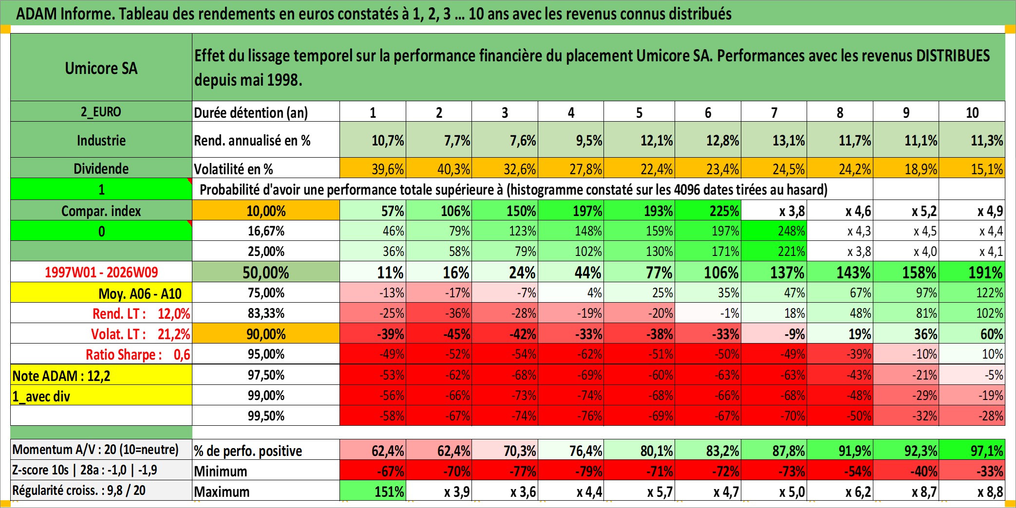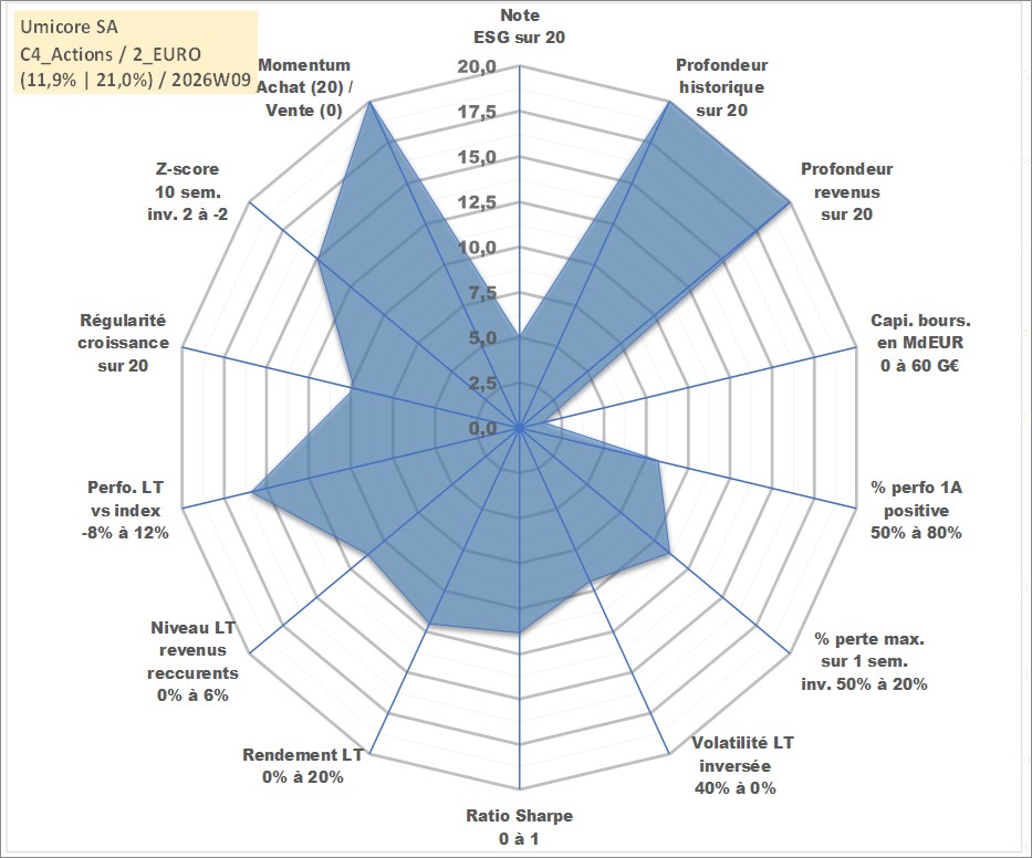Site dédié aux investisseursPage dédiée sur site financeAnalyse des valorisations hebdomadaires de l'action Umicore SA. Cet actif est cote en EUR. Les valorisations couvrent les semaines 1997W01 a 2026W09. Les revenus de cet actif financier sont pris en compte depuis la semaine 1998W22. La note globale ESG de cet actif est estimee a 5.0 (apres rebasage entre 0 et 20).