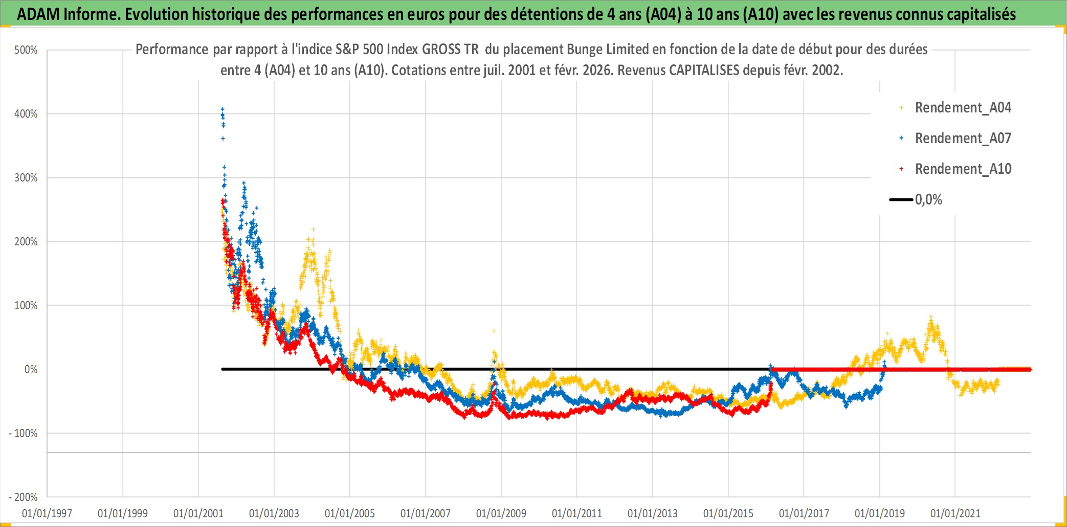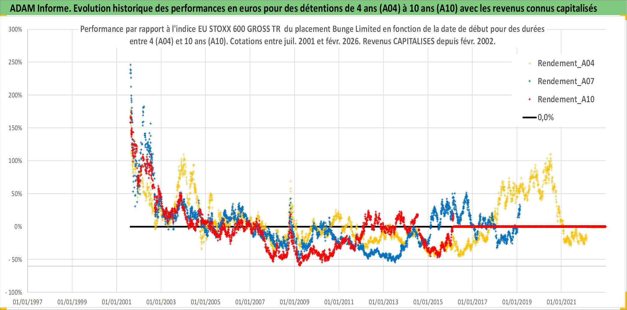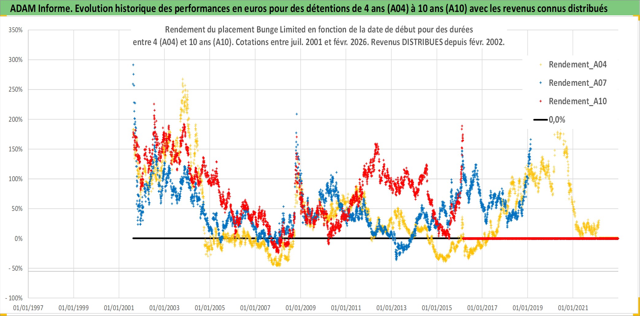 Site dédié aux investisseursPage dédiée sur site financeAnalyse des valorisations hebdomadaires de l'action Bunge Limited. Cet actif est cote en USD. Les valorisations sont en contrevaleur EURO et couvrent les semaines 2001W31 a 2026W09. Les revenus de cet actif financier sont pris en compte depuis la semaine 2002W06. La note globale ESG de cet actif est estimee a 4.0 (apres rebasage entre 0 et 20).