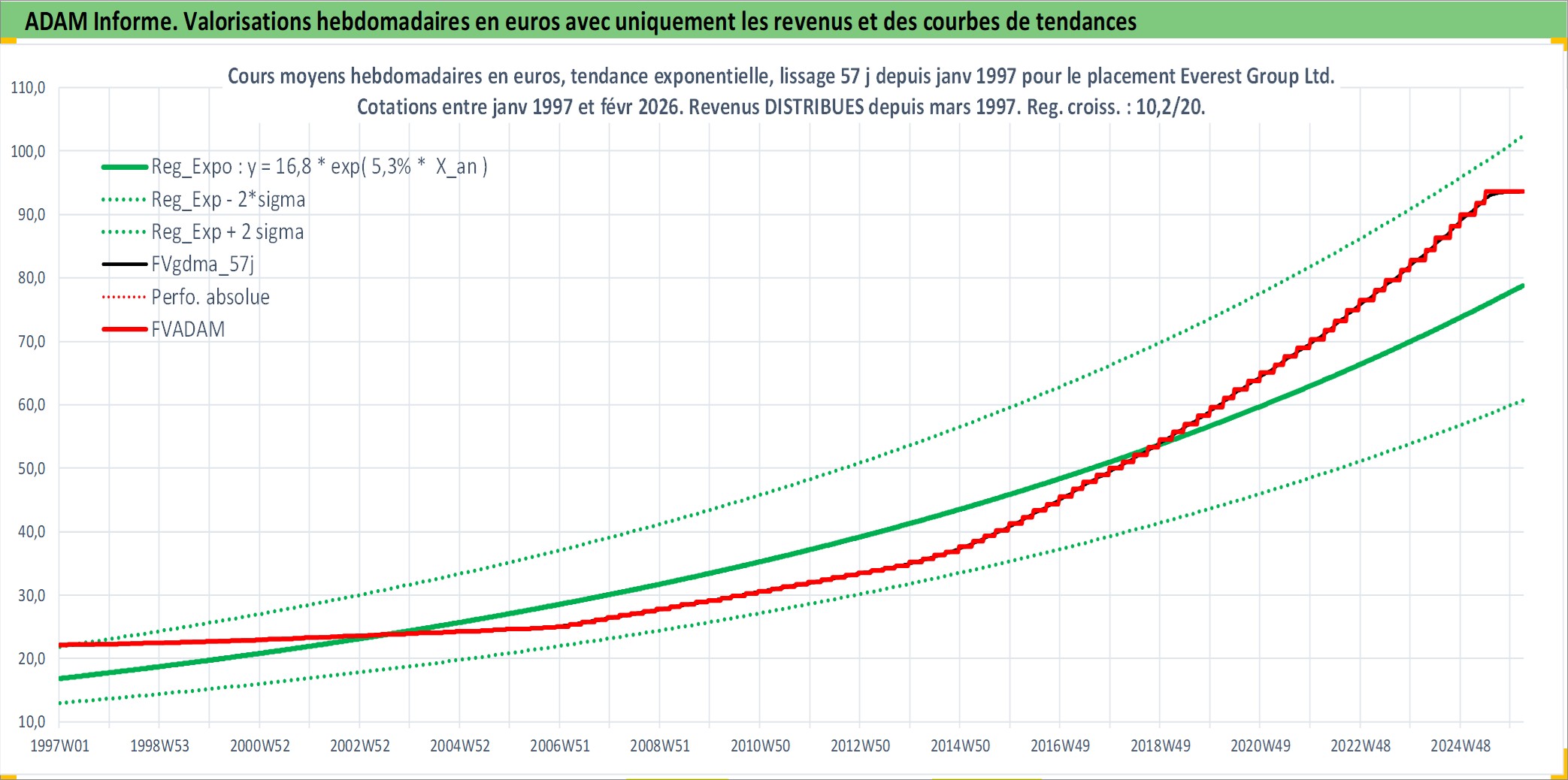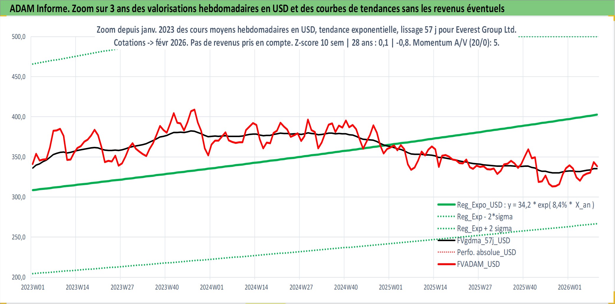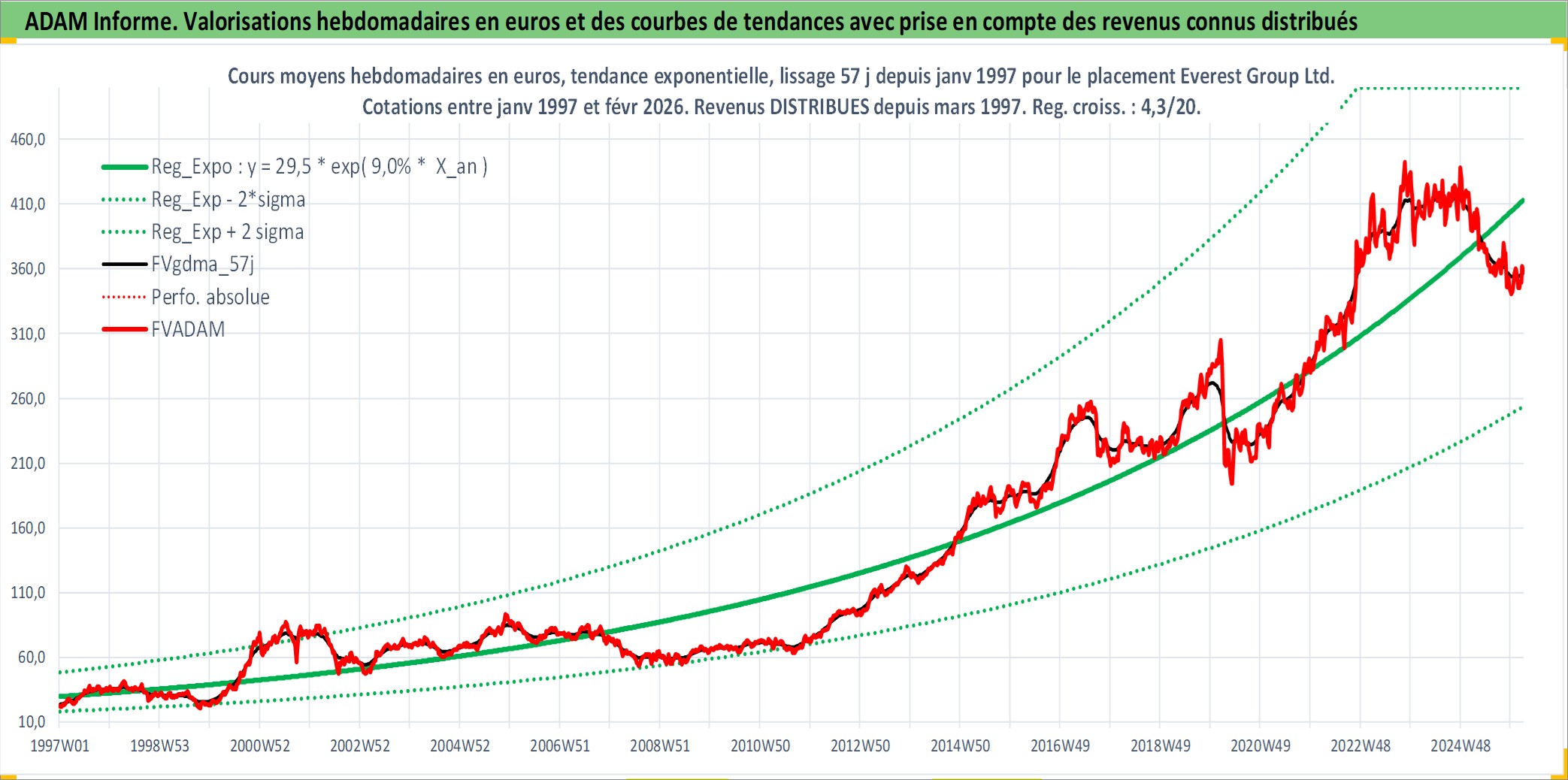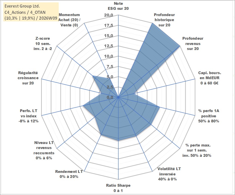 Site dédié aux investisseursPage dédiée sur site financeAnalyse des valorisations hebdomadaires de l'action Everest Group Ltd.. Cet actif est cote en USD. Les valorisations sont en contrevaleur EURO et couvrent les semaines 1997W01 a 2026W09. Les revenus de cet actif financier sont pris en compte depuis la semaine 1997W10. La note ESG de cet actif n'est pas connue.