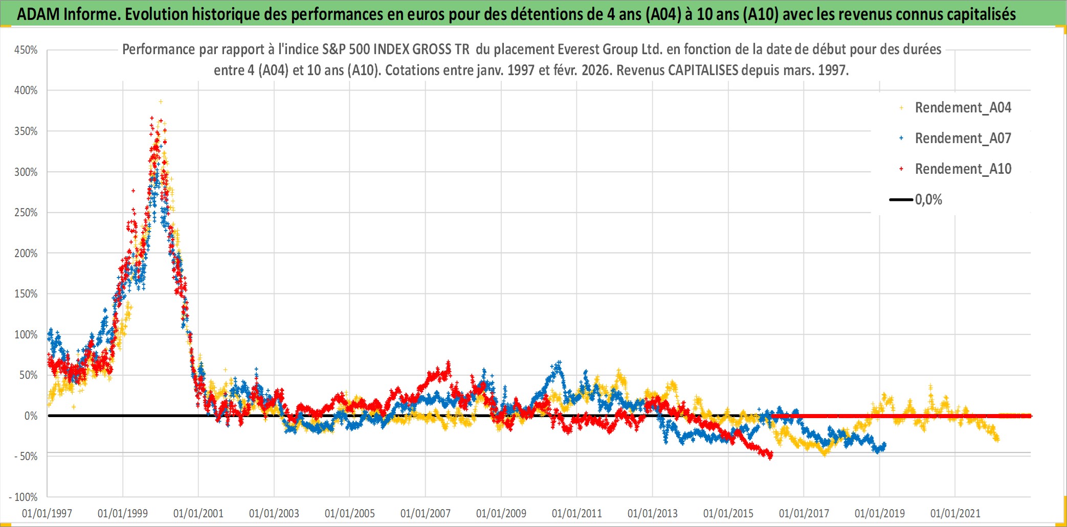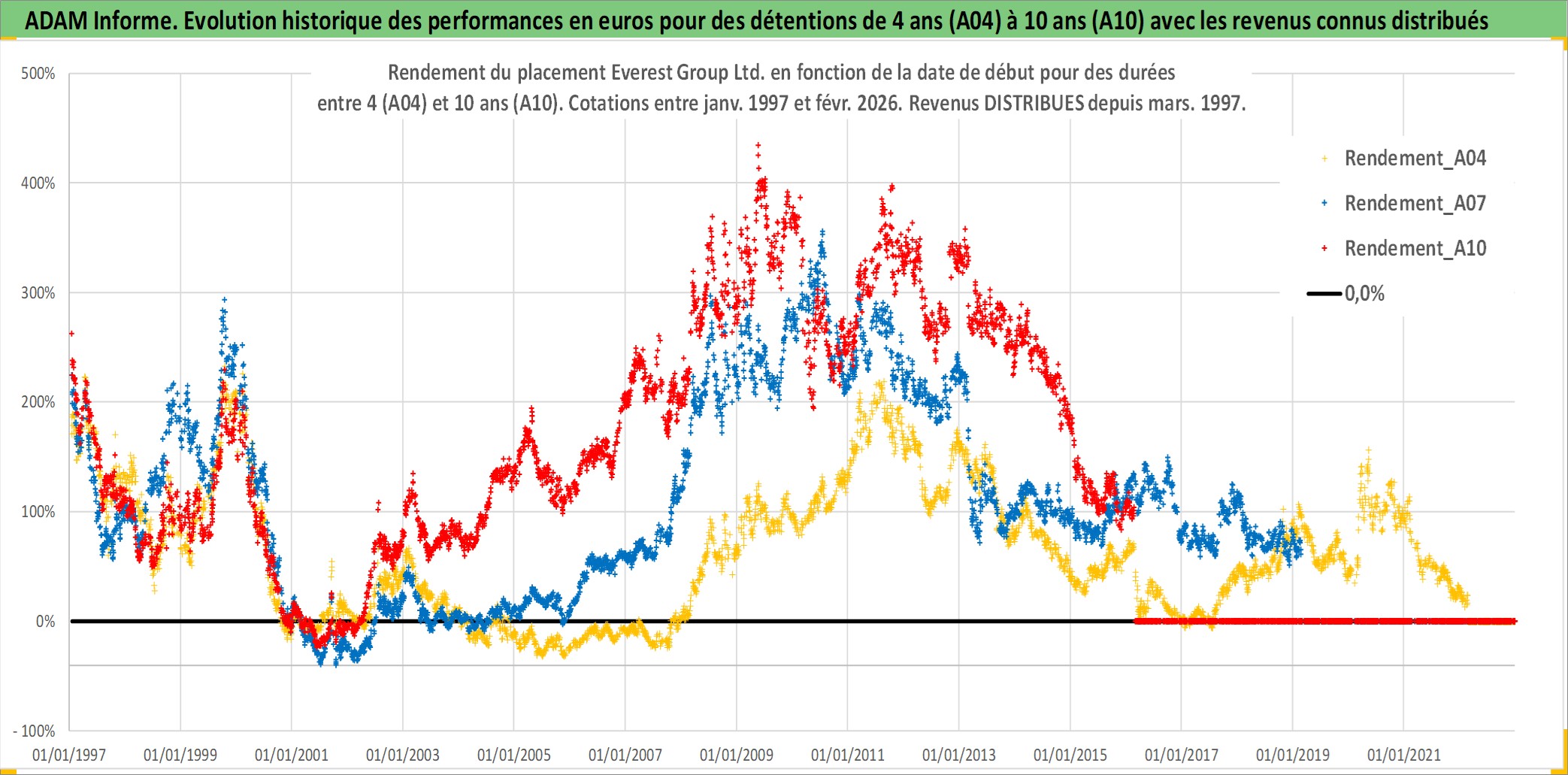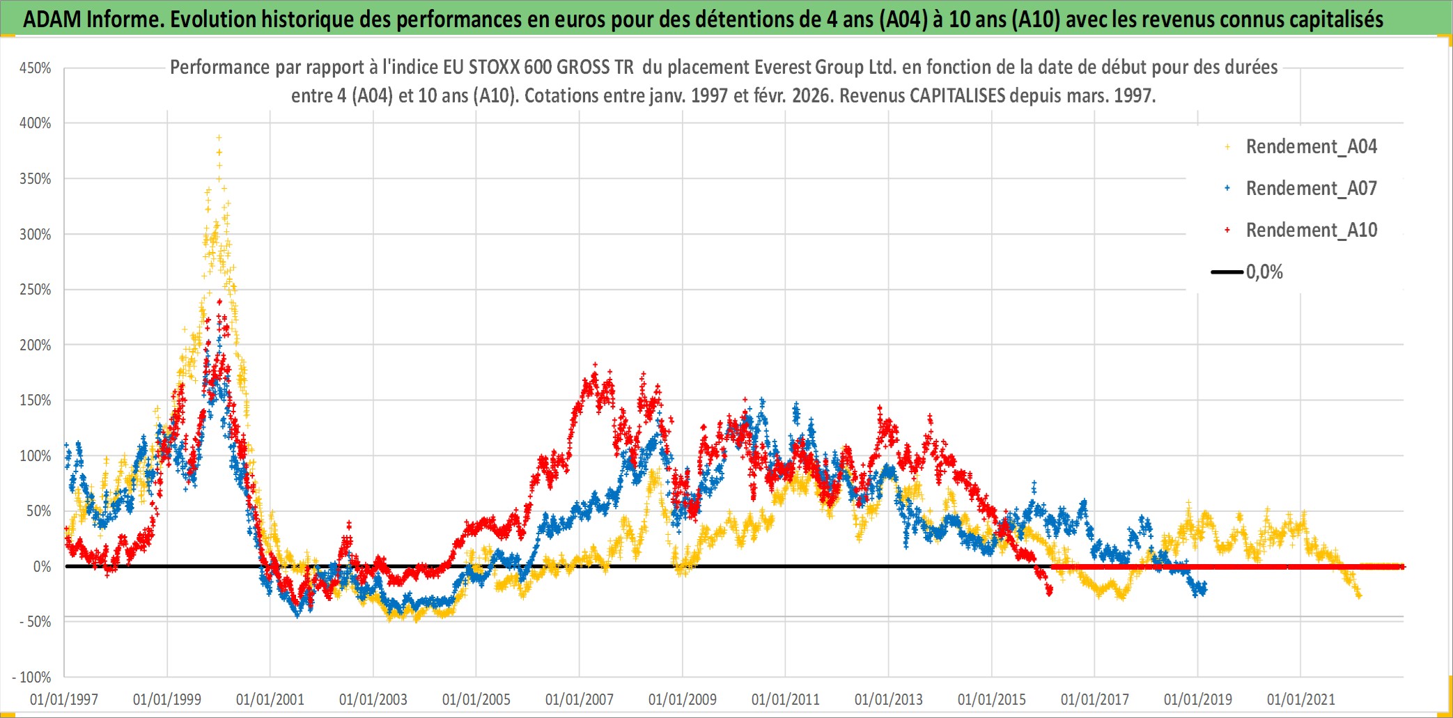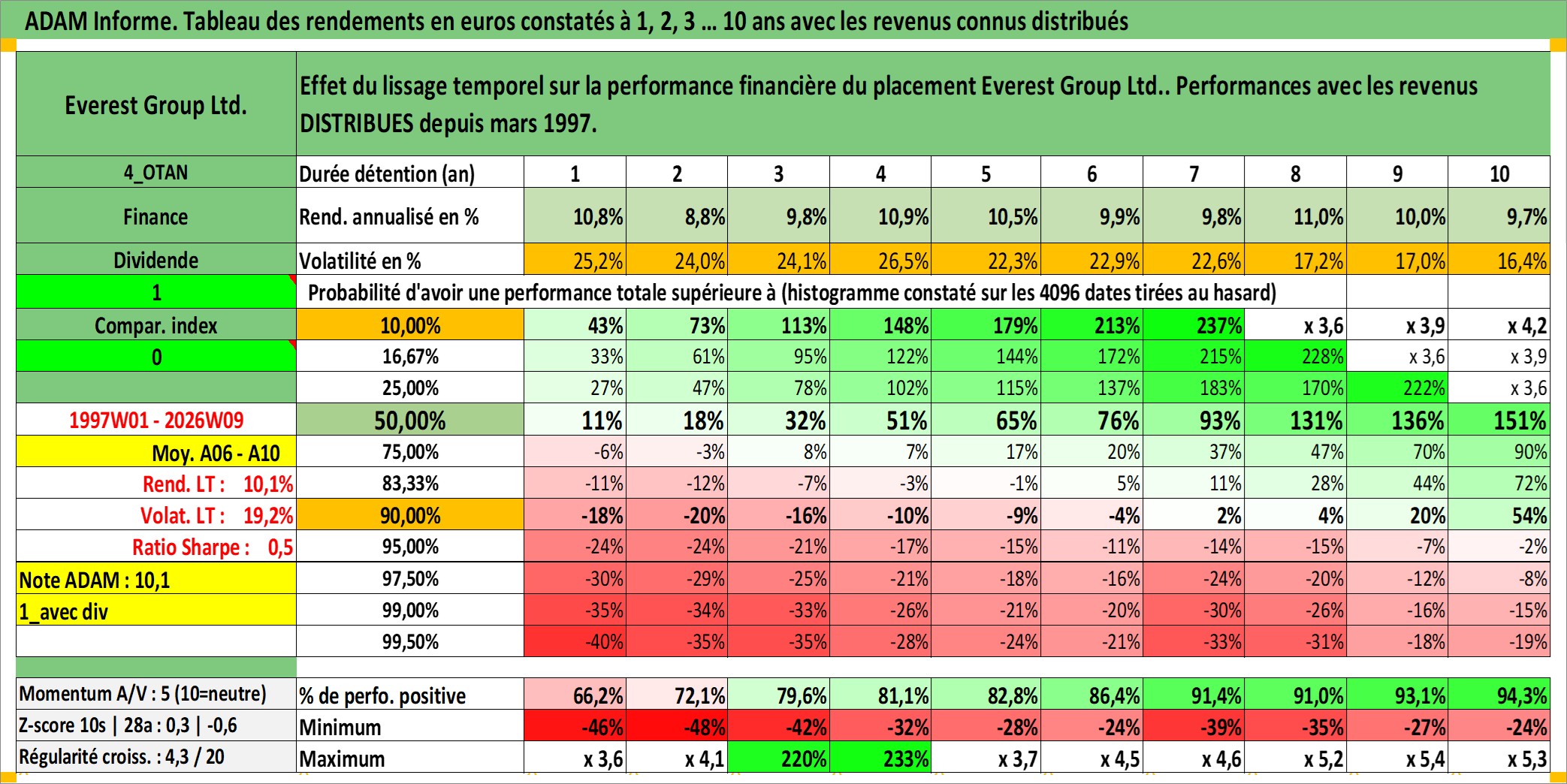 Site dédié aux investisseursPage dédiée sur site financeAnalyse des valorisations hebdomadaires de l'action Everest Group Ltd.. Cet actif est cote en USD. Les valorisations sont en contrevaleur EURO et couvrent les semaines 1997W01 a 2026W09. Les revenus de cet actif financier sont pris en compte depuis la semaine 1997W10. La note ESG de cet actif n'est pas connue.