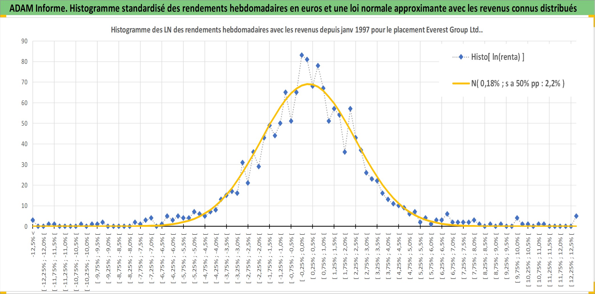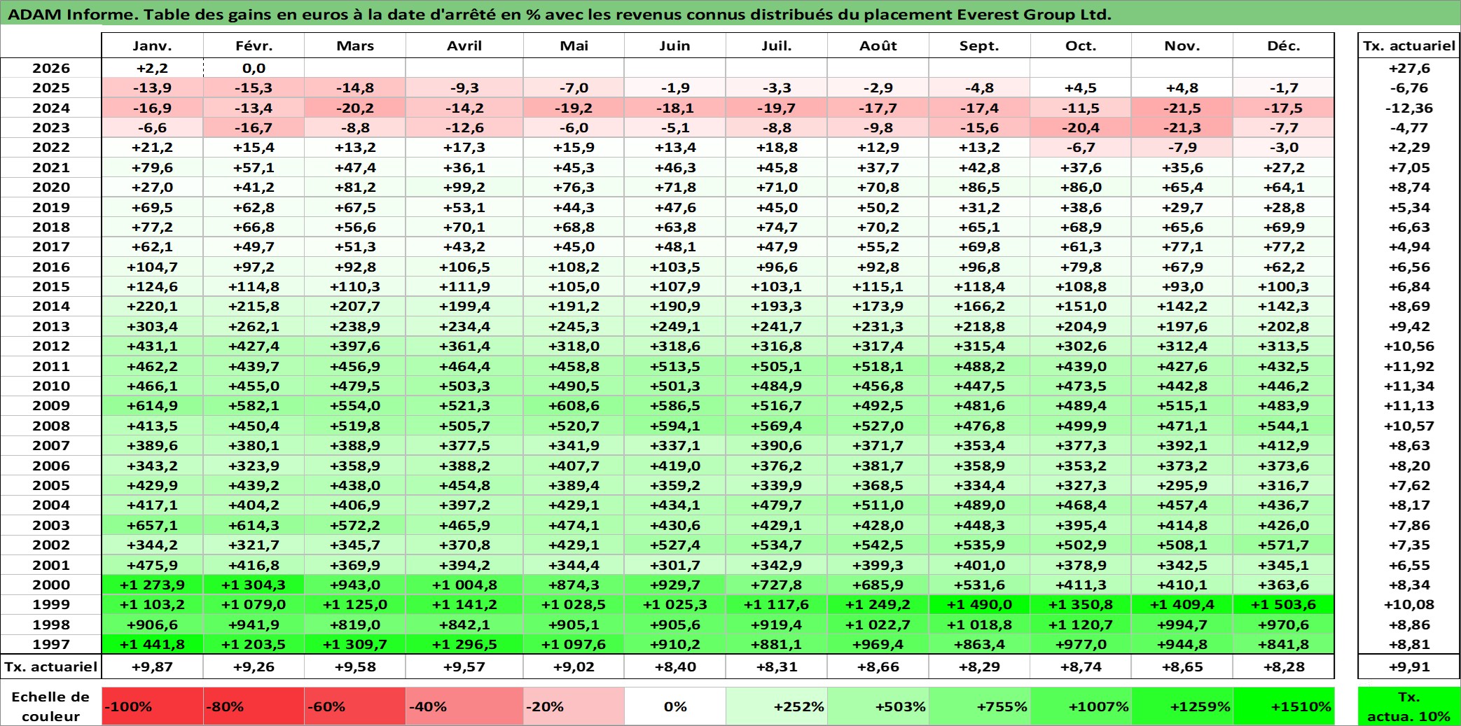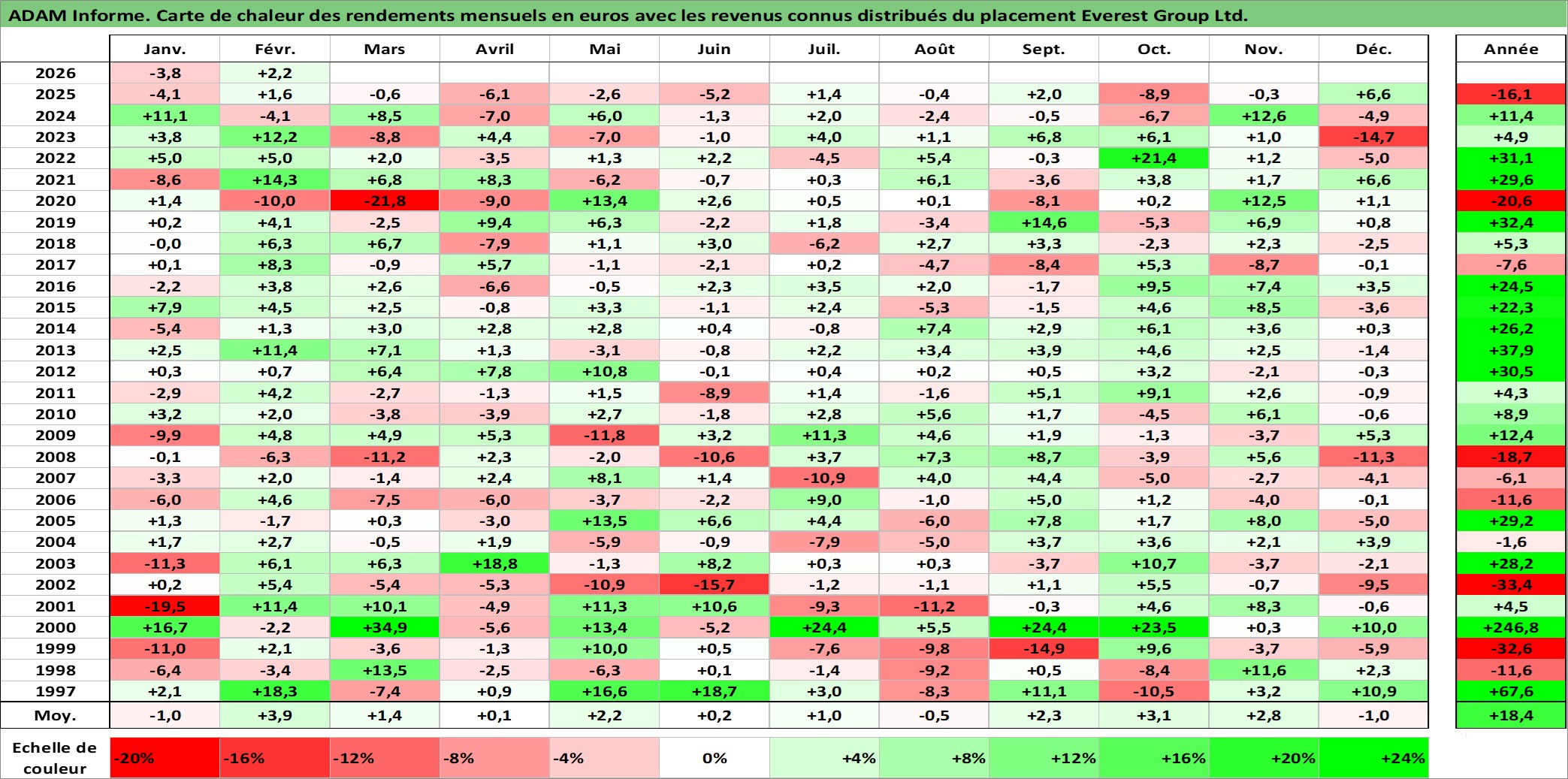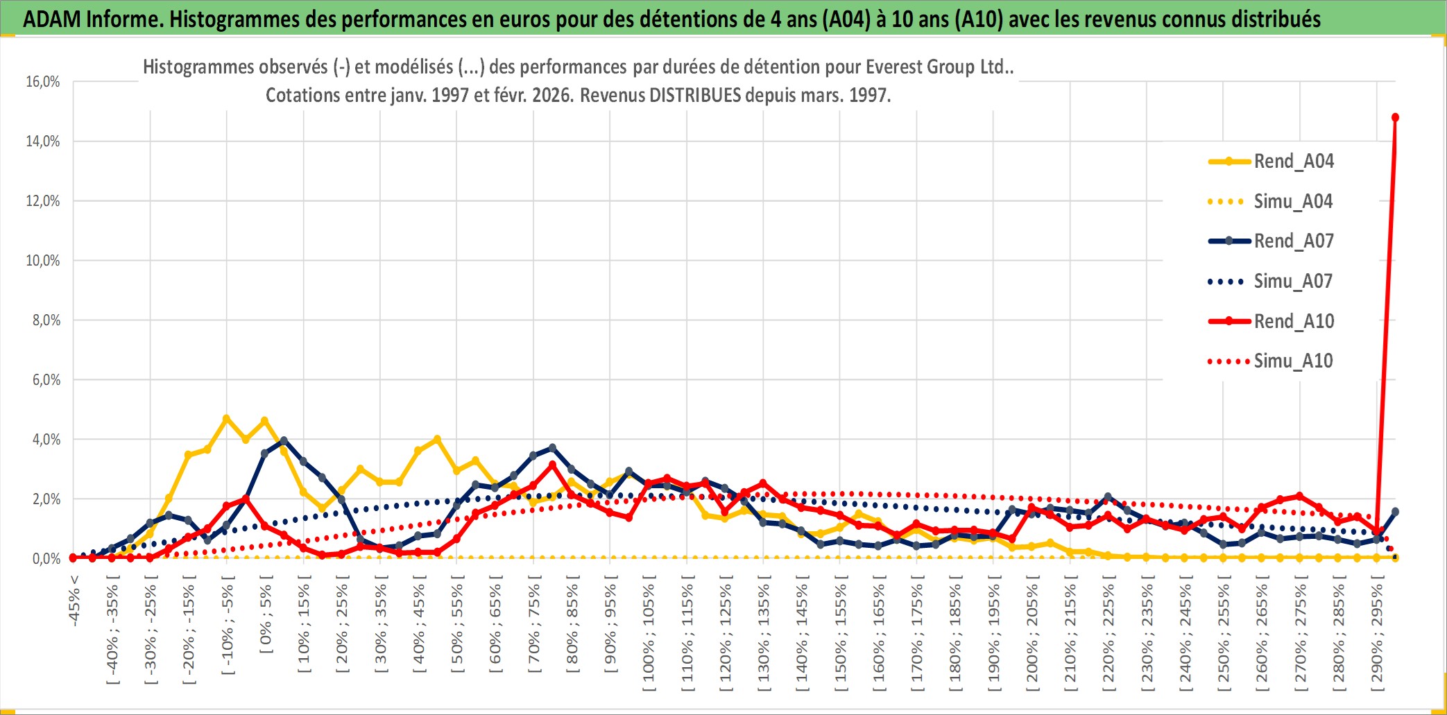 Site dédié aux investisseursPage dédiée sur site financeAnalyse des valorisations hebdomadaires de l'action Everest Group Ltd.. Cet actif est cote en USD. Les valorisations sont en contrevaleur EURO et couvrent les semaines 1997W01 a 2026W09. Les revenus de cet actif financier sont pris en compte depuis la semaine 1997W10. La note ESG de cet actif n'est pas connue.