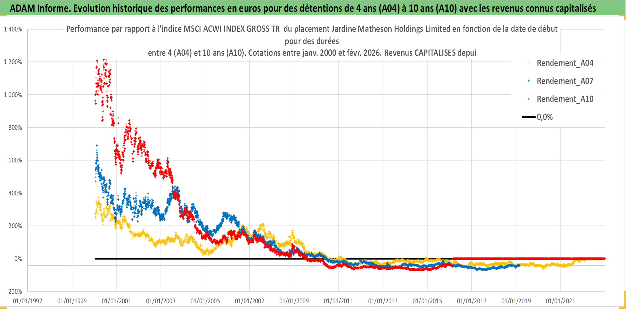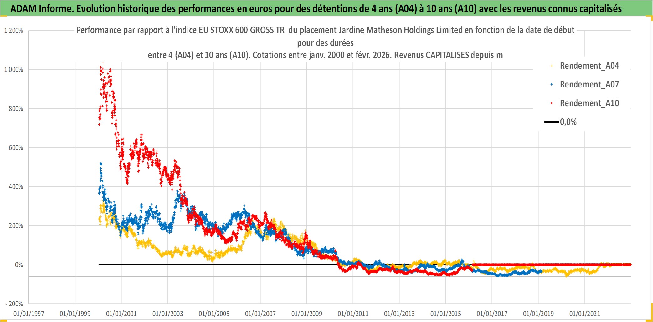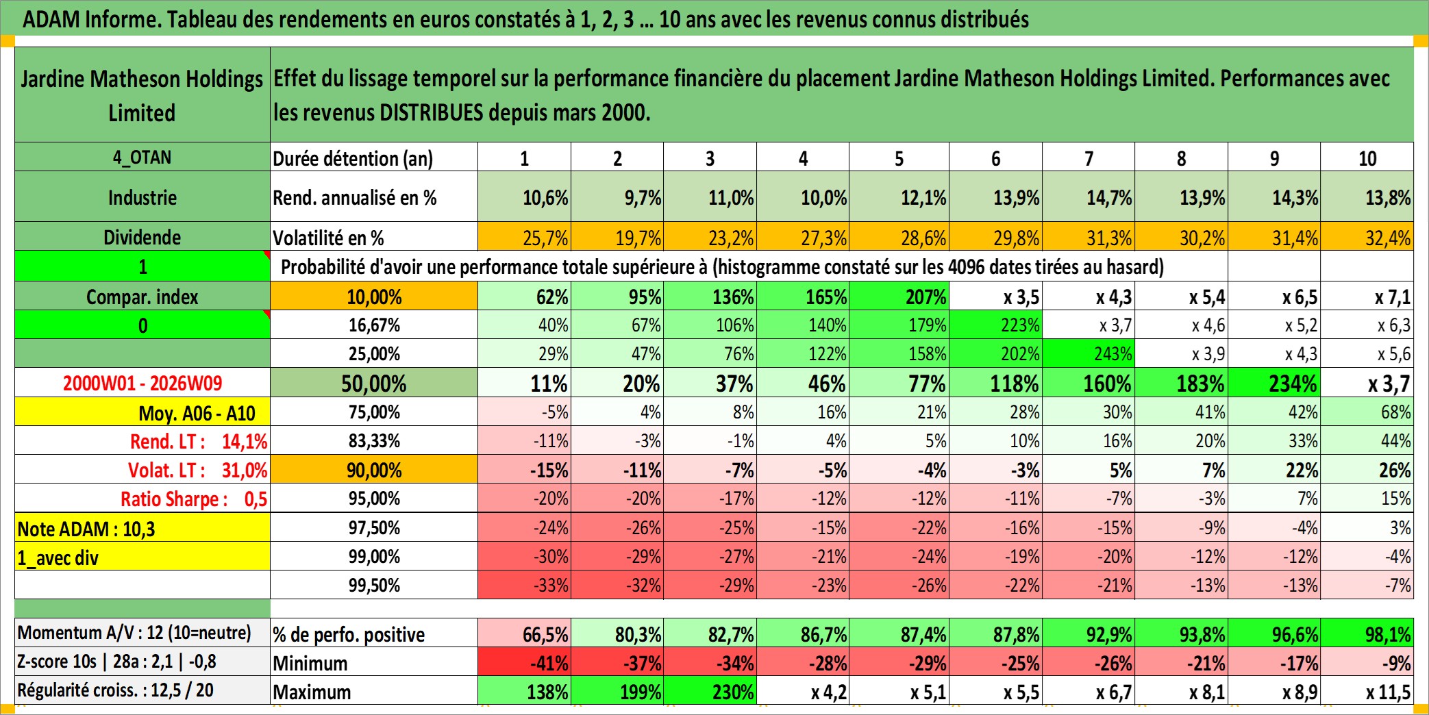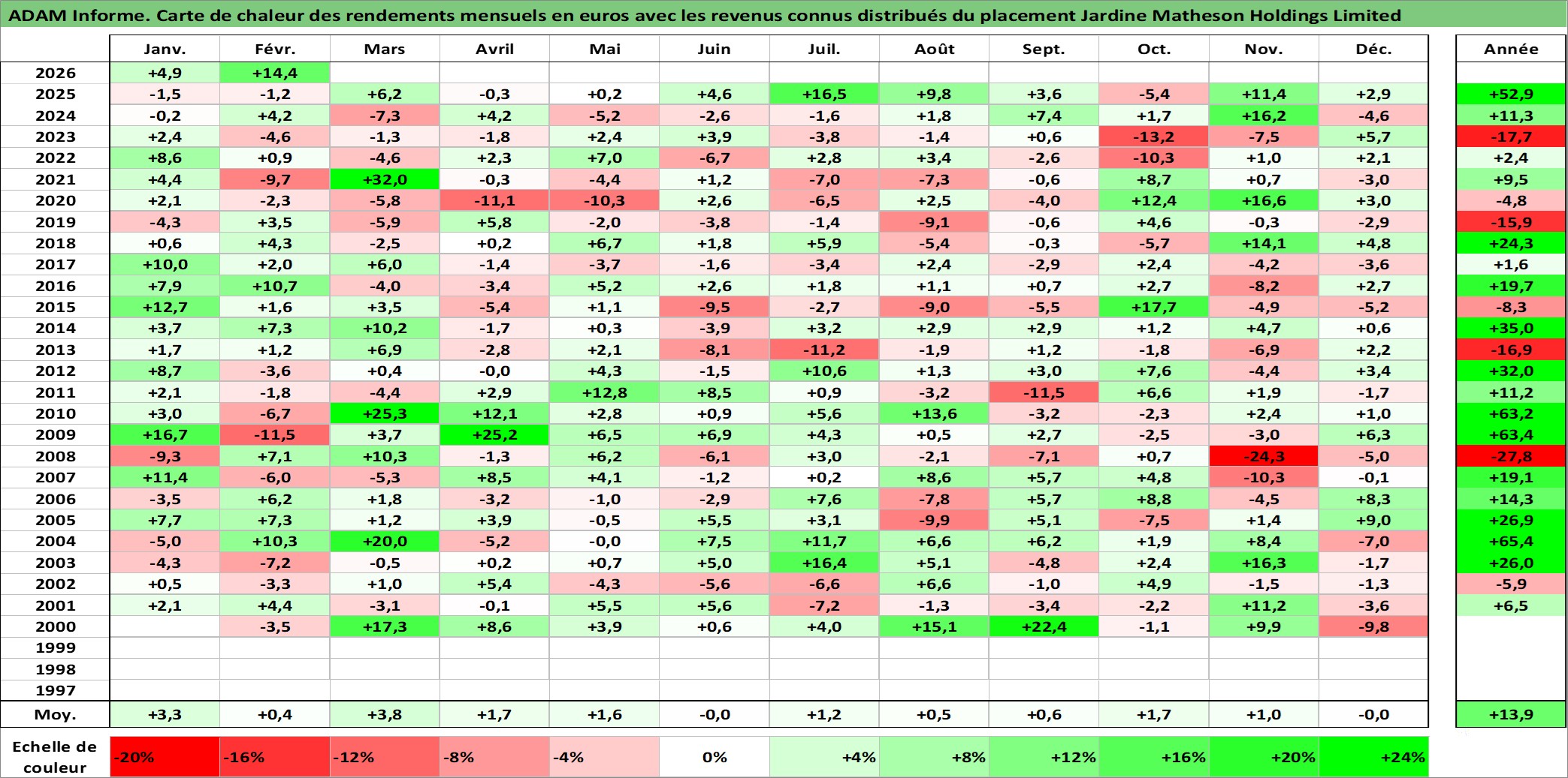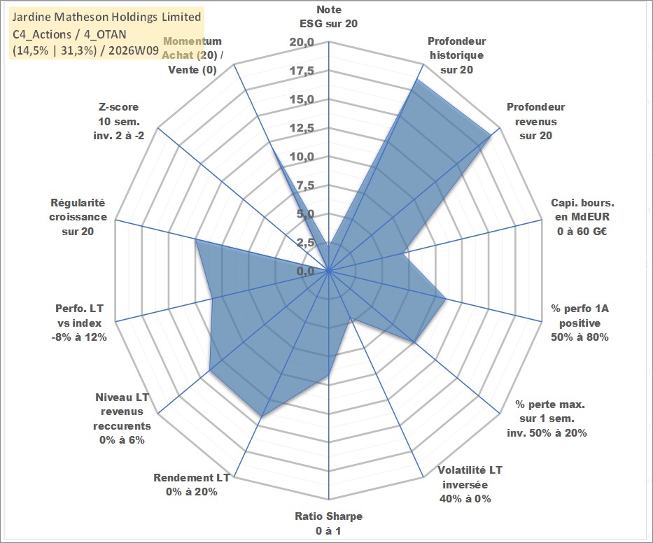 Site dédié aux investisseursPage dédiée sur site financeAnalyse des valorisations hebdomadaires de l'action Jardine Matheson Holdings Limited. Cet actif est cote en USD. Les valorisations sont en contrevaleur EURO et couvrent les semaines 2000W01 a 2026W09. Les revenus de cet actif financier sont pris en compte depuis la semaine 2000W12. La note globale ESG de cet actif est estimee a 2.0 (apres rebasage entre 0 et 20).