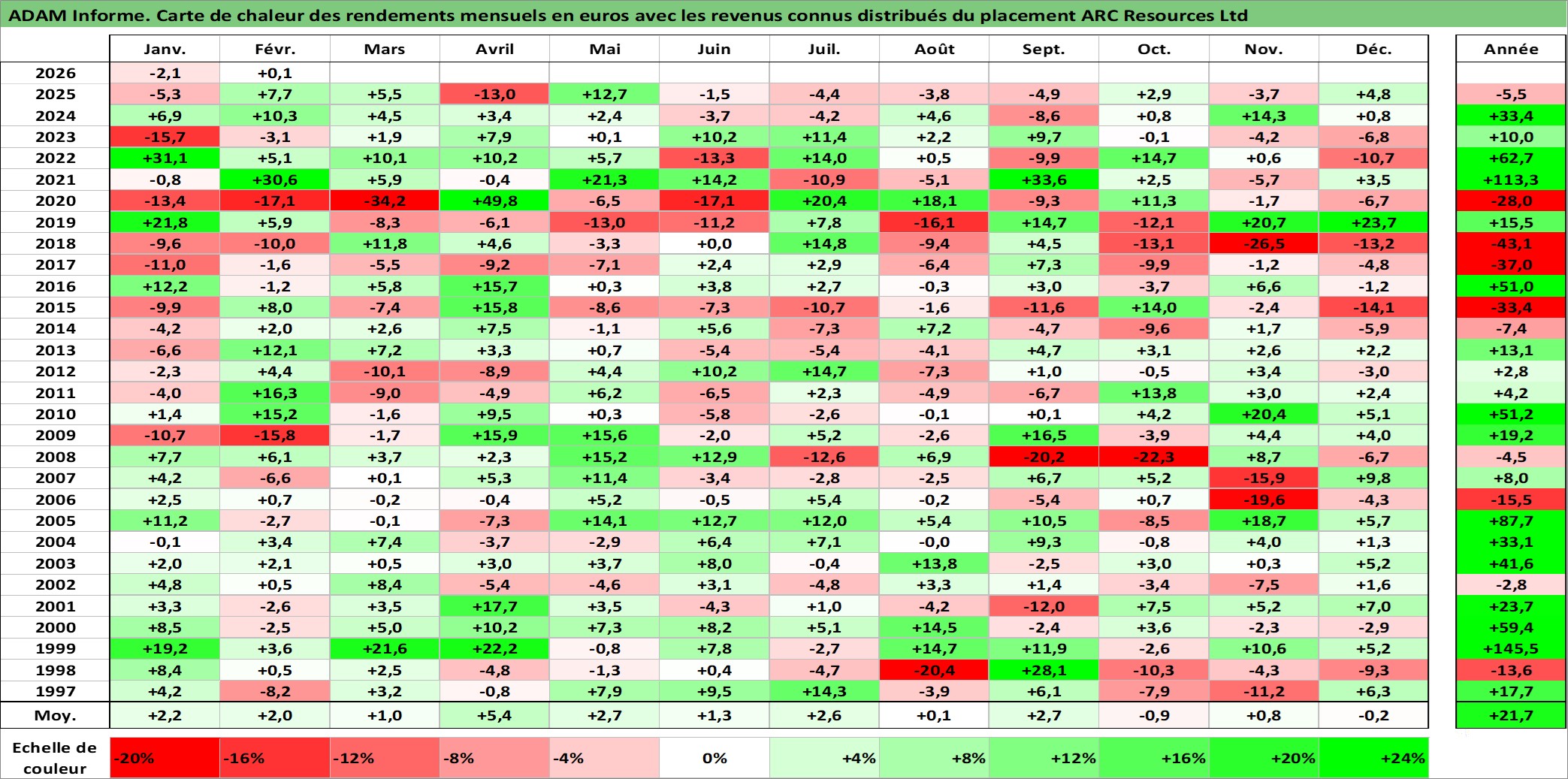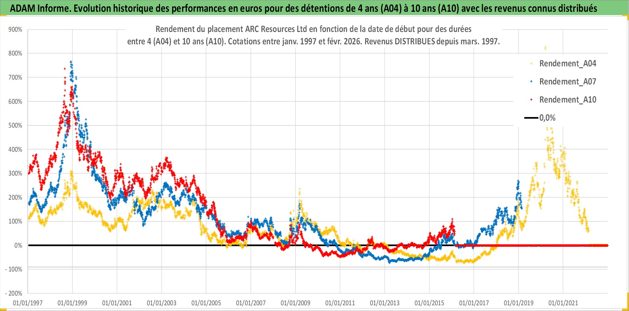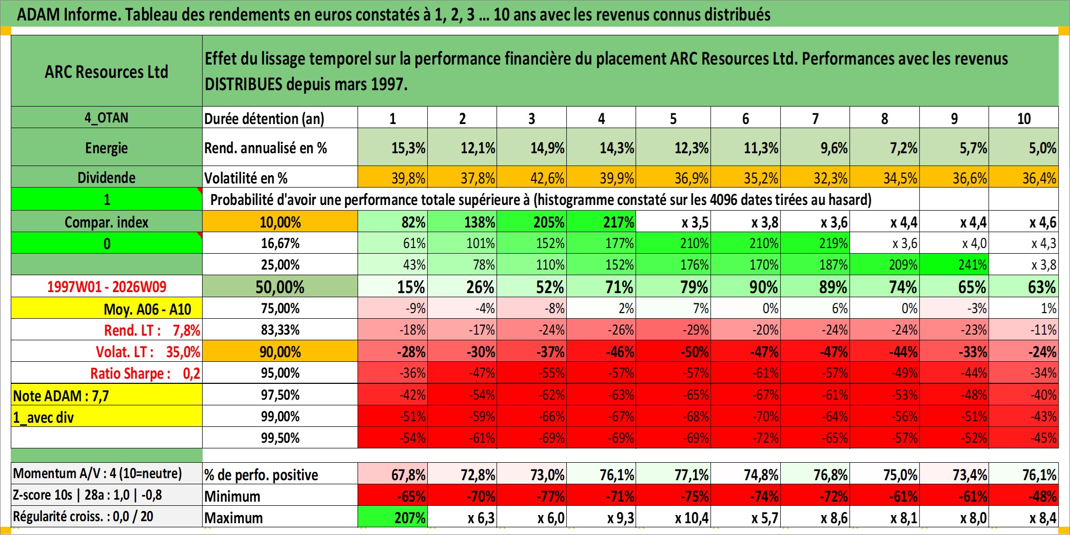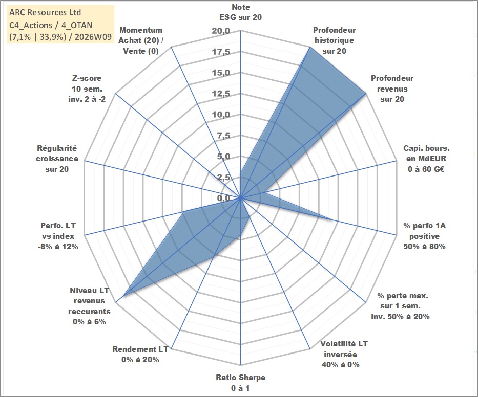 Site dédié aux investisseursPage dédiée sur site financeAnalyse des valorisations hebdomadaires de l'action ARC Resources Ltd. Cet actif est cote en CAD. Les valorisations sont en contrevaleur EURO et couvrent les semaines 1997W01 a 2026W09. Les revenus de cet actif financier sont pris en compte depuis la semaine 1997W13. La note globale ESG de cet actif est estimee a 3.0 (apres rebasage entre 0 et 20).