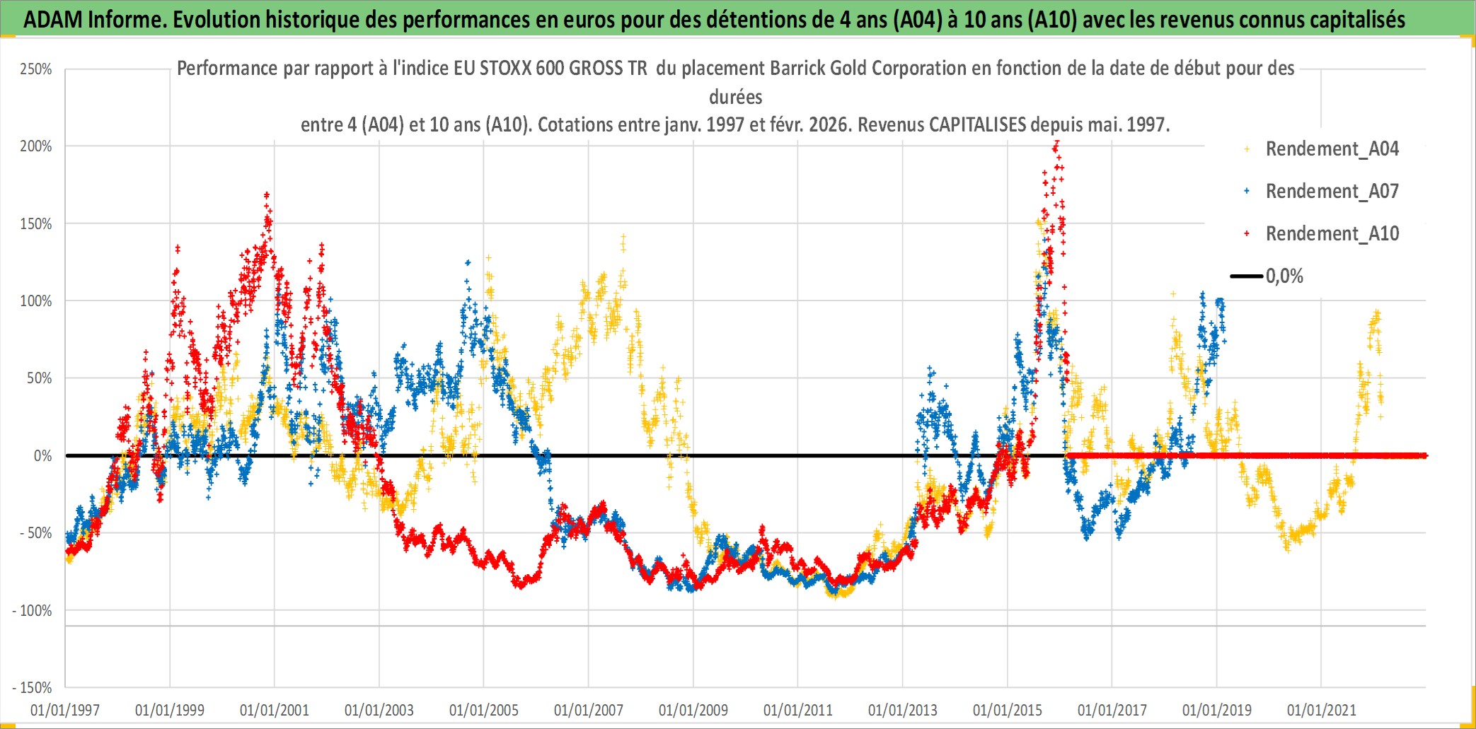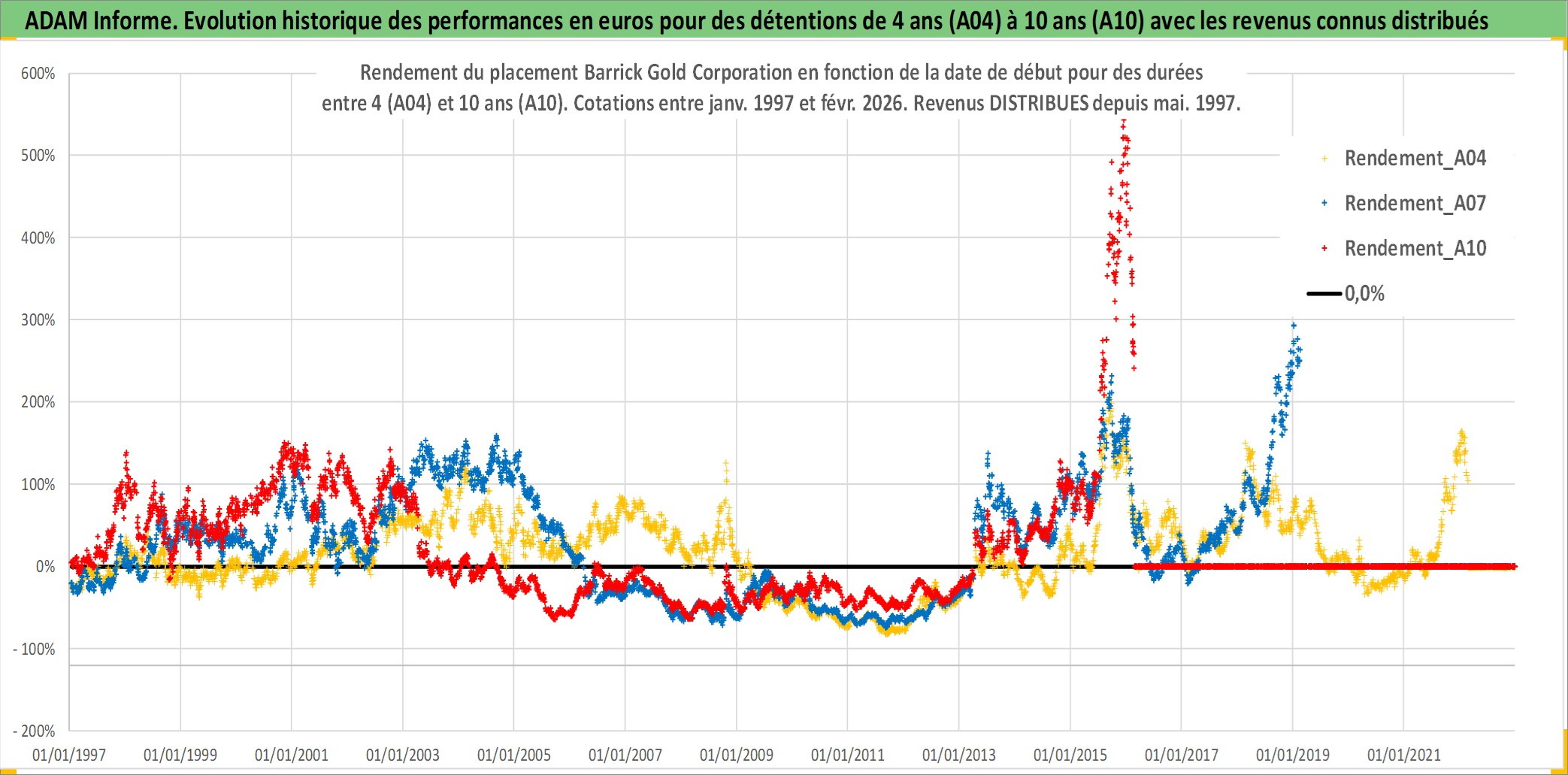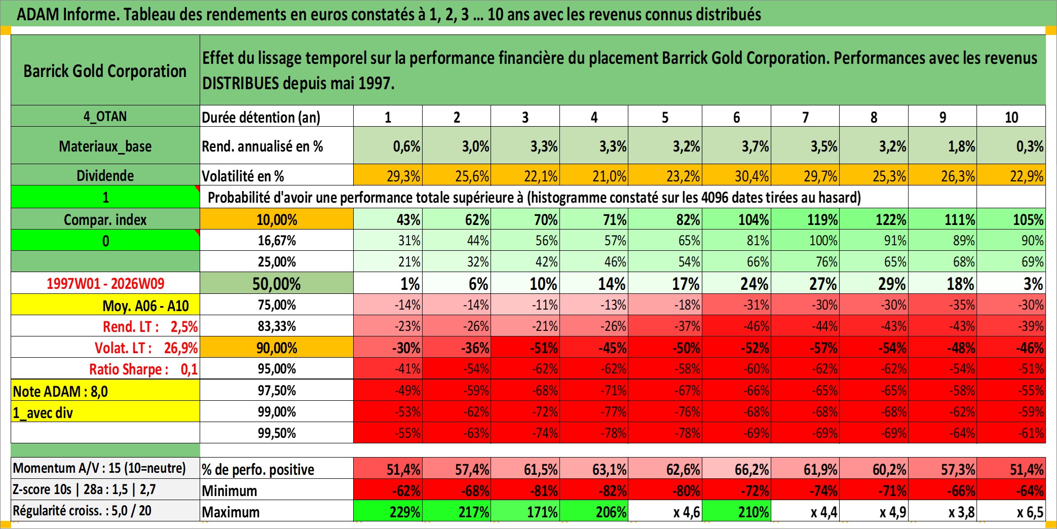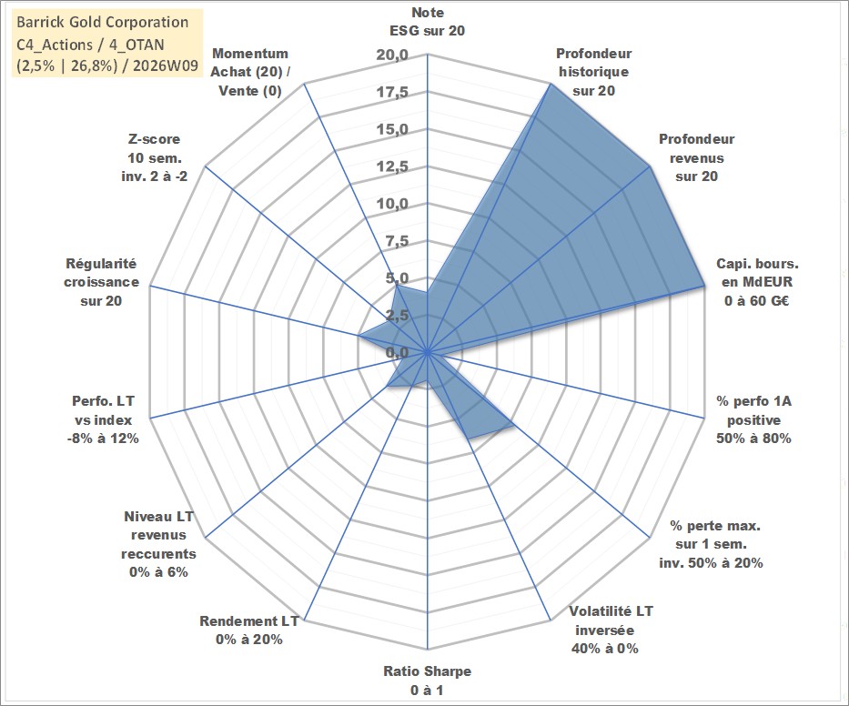 Site dédié aux investisseursPage dédiée sur site financeAnalyse des valorisations hebdomadaires de l'action Barrick Gold Corporation. Cet actif est cote en CAD. Les valorisations sont en contrevaleur EURO et couvrent les semaines 1997W01 a 2026W09. Les revenus de cet actif financier sont pris en compte depuis la semaine 1997W22. La note globale ESG de cet actif est estimee a 4.0 (apres rebasage entre 0 et 20).