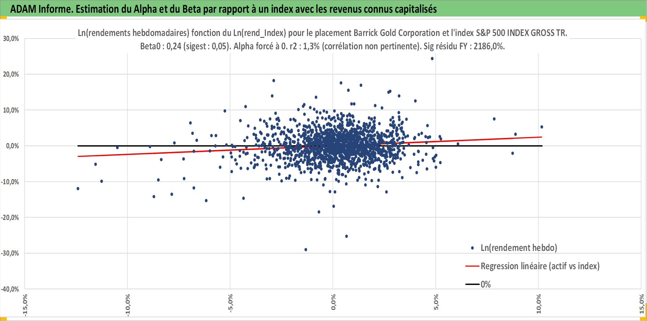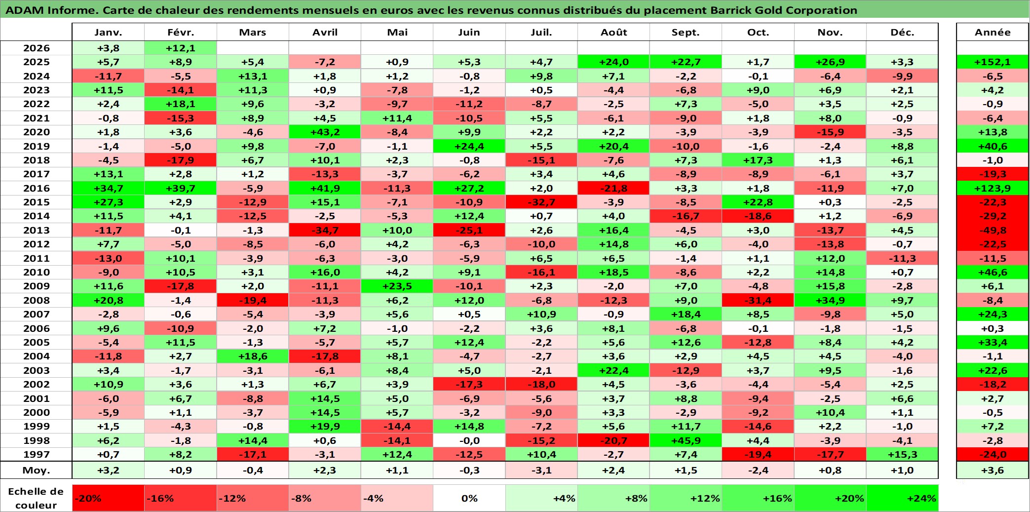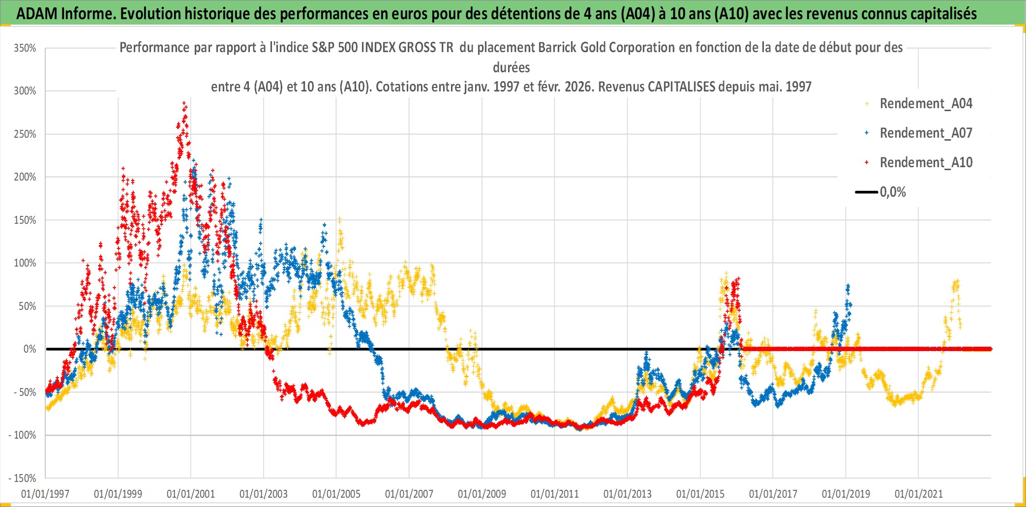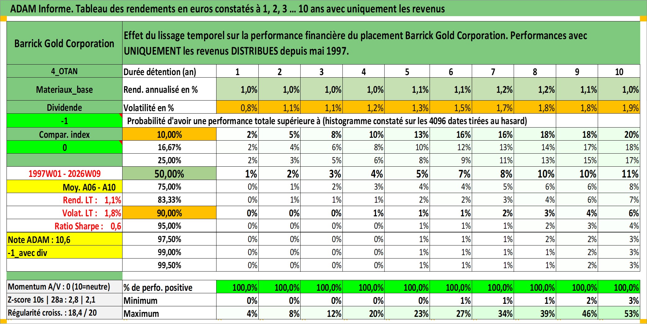 Site dédié aux investisseursPage dédiée sur site financeAnalyse des valorisations hebdomadaires de l'action Barrick Gold Corporation. Cet actif est cote en CAD. Les valorisations sont en contrevaleur EURO et couvrent les semaines 1997W01 a 2026W09. Les revenus de cet actif financier sont pris en compte depuis la semaine 1997W22. La note globale ESG de cet actif est estimee a 4.0 (apres rebasage entre 0 et 20).