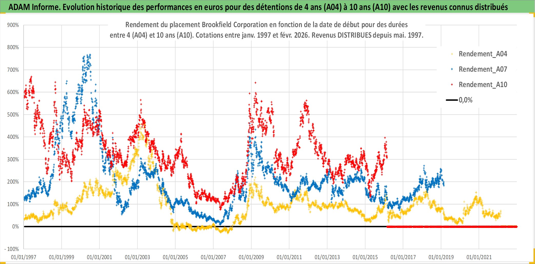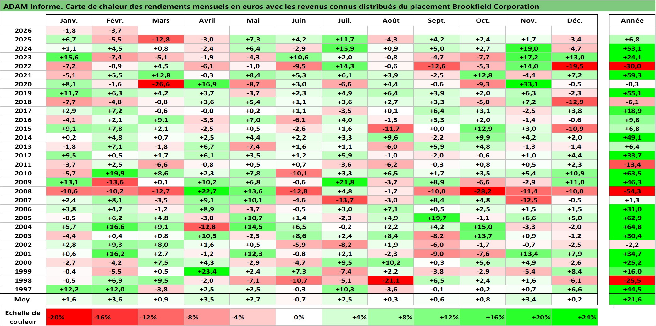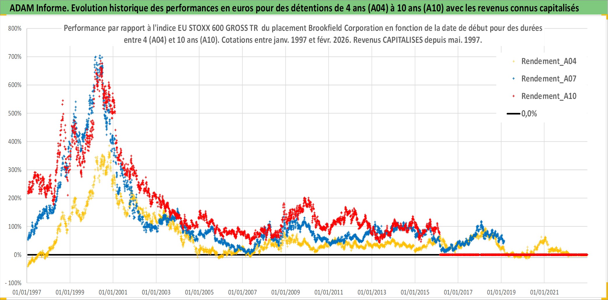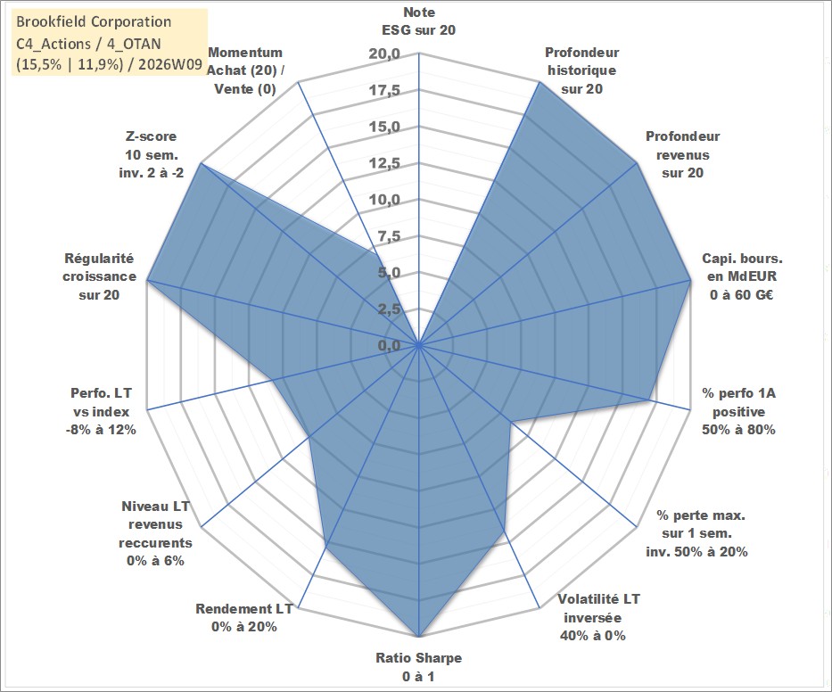 Site dédié aux investisseursPage dédiée sur site financeAnalyse des valorisations hebdomadaires de l'action Brookfield Corporation. Cet actif est cote en CAD. Les valorisations sont en contrevaleur EURO et couvrent les semaines 1997W01 a 2026W09. Les revenus de cet actif financier sont pris en compte depuis la semaine 1997W20. La note ESG de cet actif n'est pas connue.