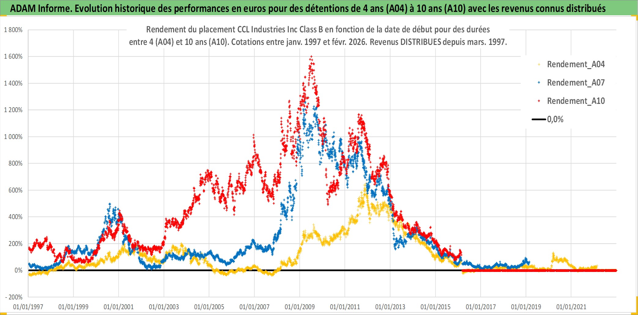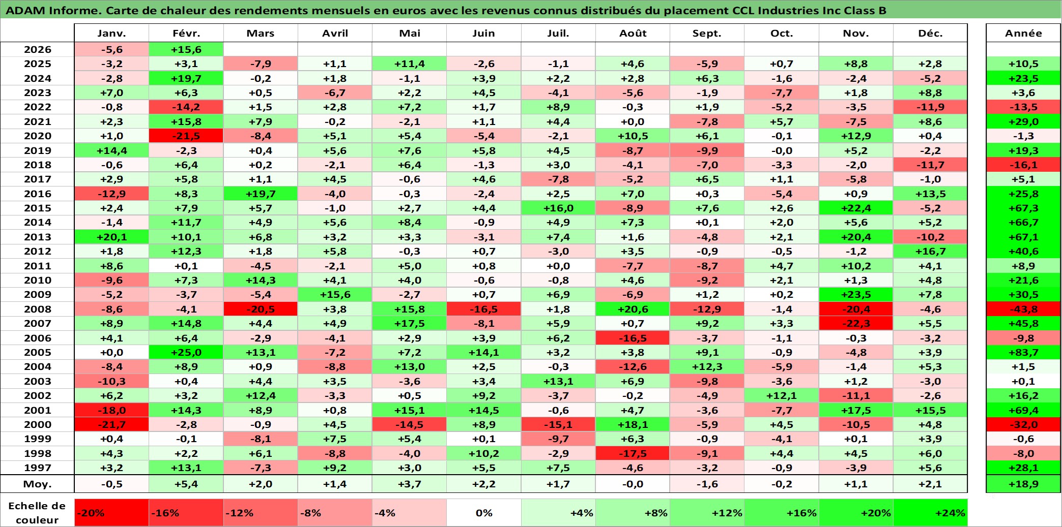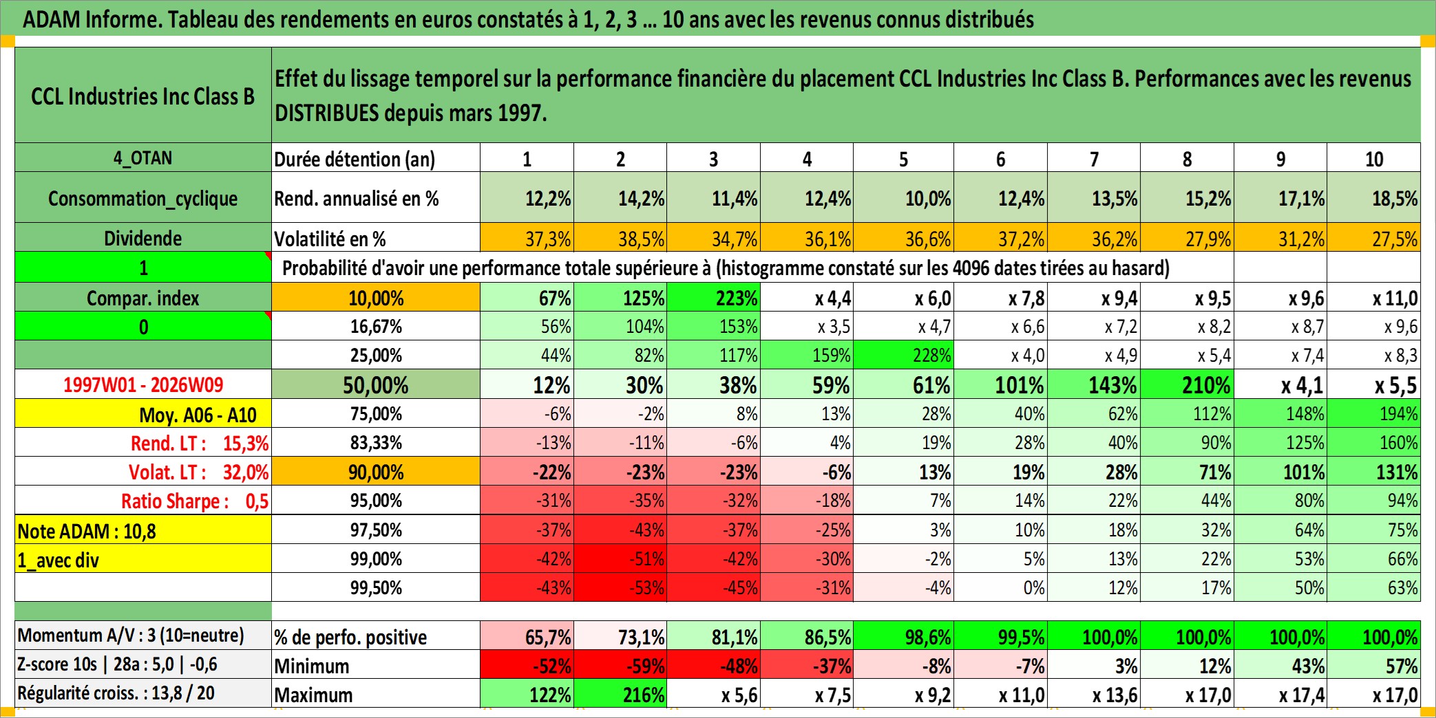 Site dédié aux investisseursPage dédiée sur site financeAnalyse des valorisations hebdomadaires de l'action CCL Industries Inc Class B. Cet actif est cote en CAD. Les valorisations sont en contrevaleur EURO et couvrent les semaines 1997W01 a 2026W09. Les revenus de cet actif financier sont pris en compte depuis la semaine 1997W11. La note globale ESG de cet actif est estimee a 11.0 (apres rebasage entre 0 et 20).