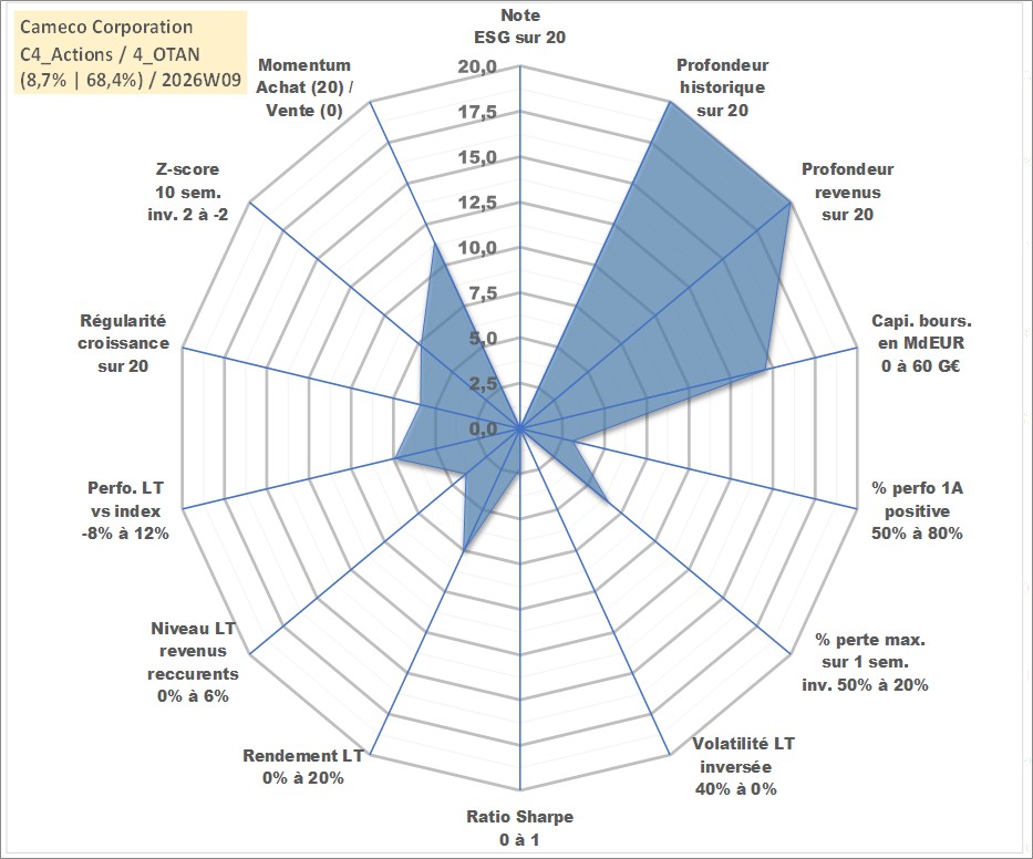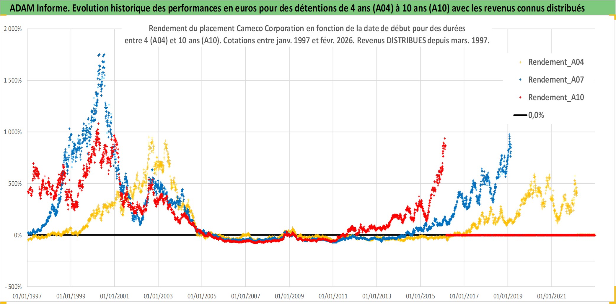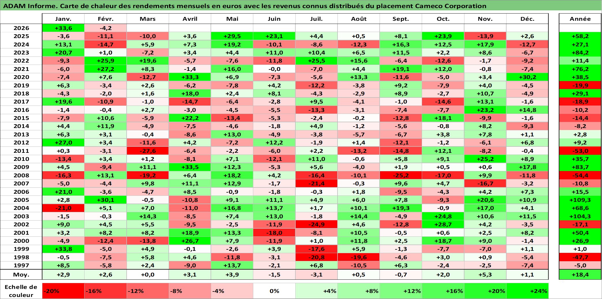 Site dédié aux investisseursPage dédiée sur site financeAnalyse des valorisations hebdomadaires de l'action Cameco Corporation. Cet actif est cote en CAD. Les valorisations sont en contrevaleur EURO et couvrent les semaines 1997W01 a 2026W09. Les revenus de cet actif financier sont pris en compte depuis la semaine 1997W13. La note ESG de cet actif n'est pas connue.