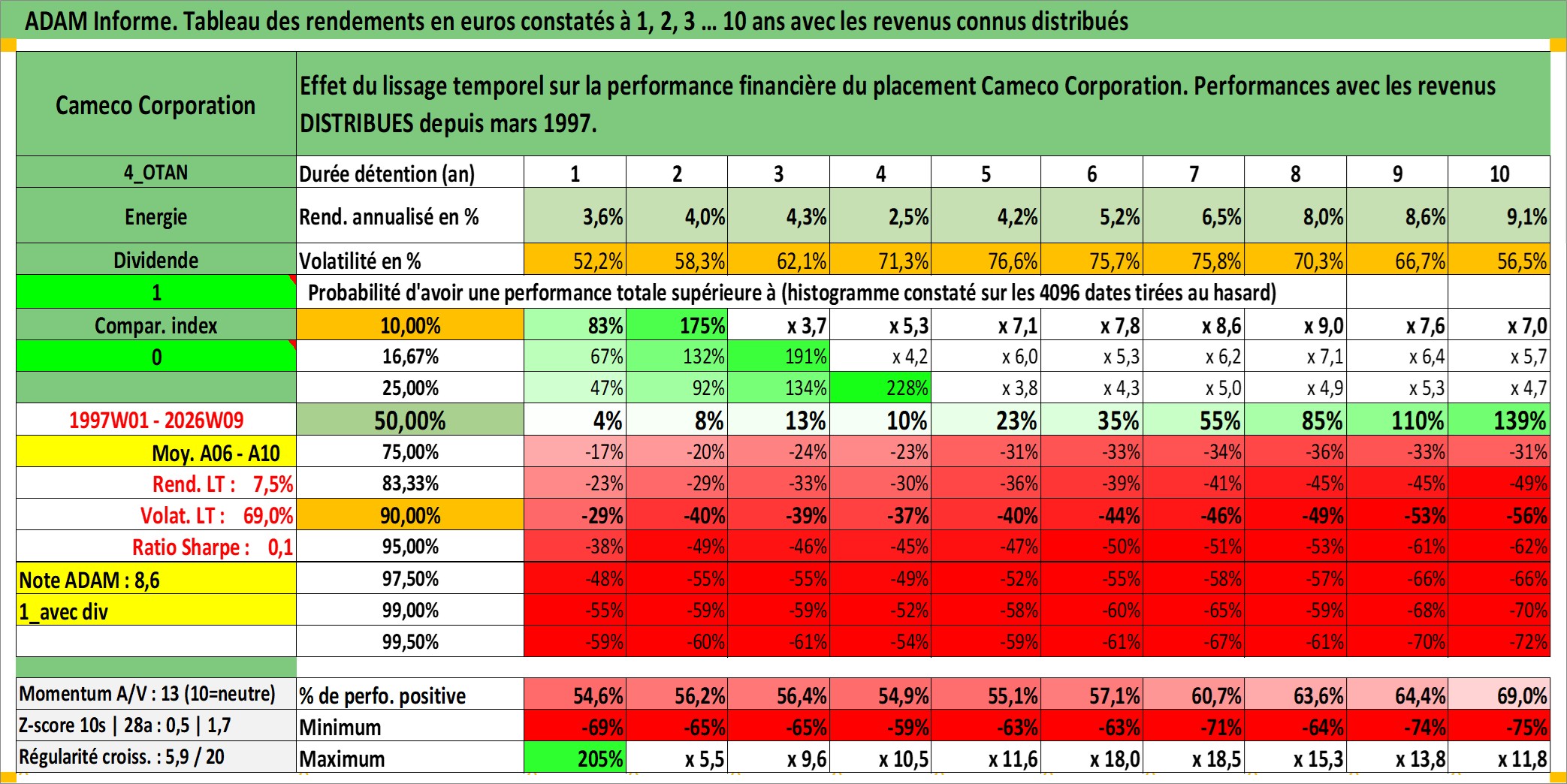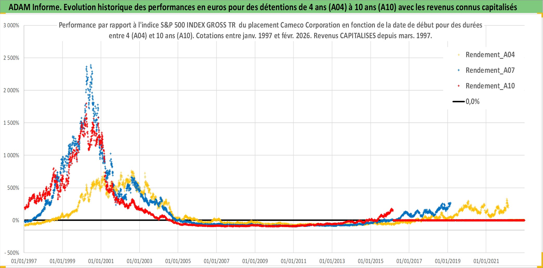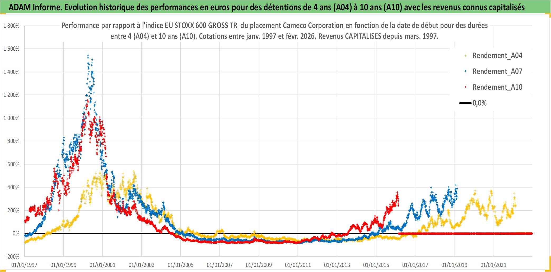 Site dédié aux investisseursPage dédiée sur site financeAnalyse des valorisations hebdomadaires de l'action Cameco Corporation. Cet actif est cote en CAD. Les valorisations sont en contrevaleur EURO et couvrent les semaines 1997W01 a 2026W09. Les revenus de cet actif financier sont pris en compte depuis la semaine 1997W13. La note ESG de cet actif n'est pas connue.