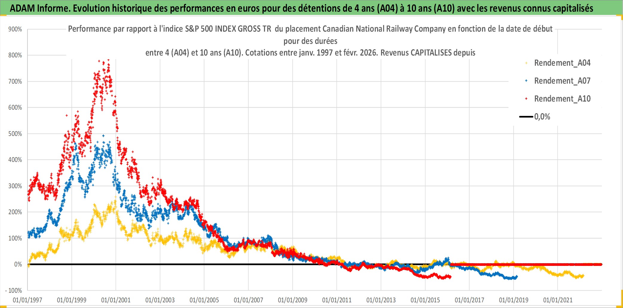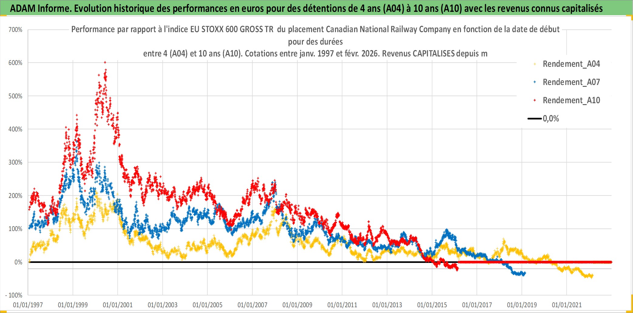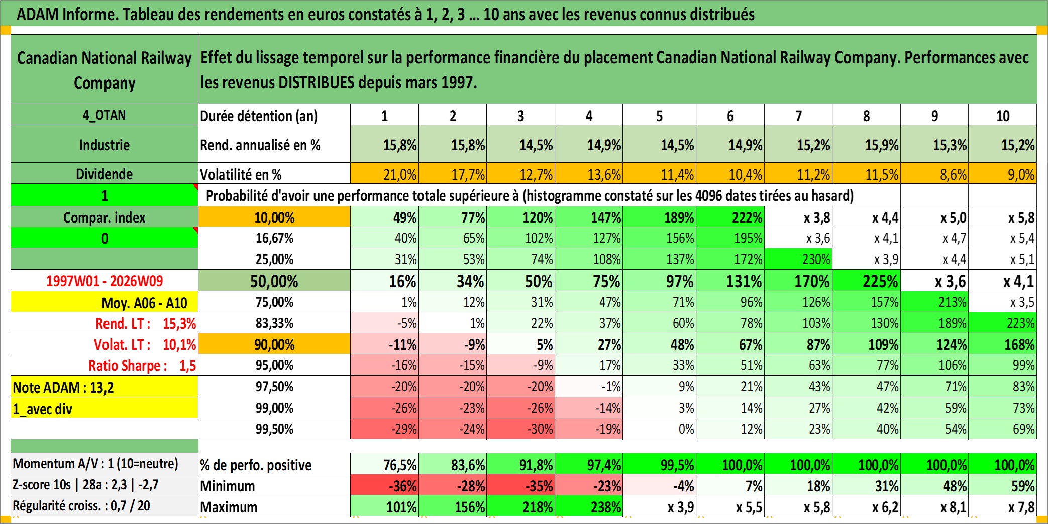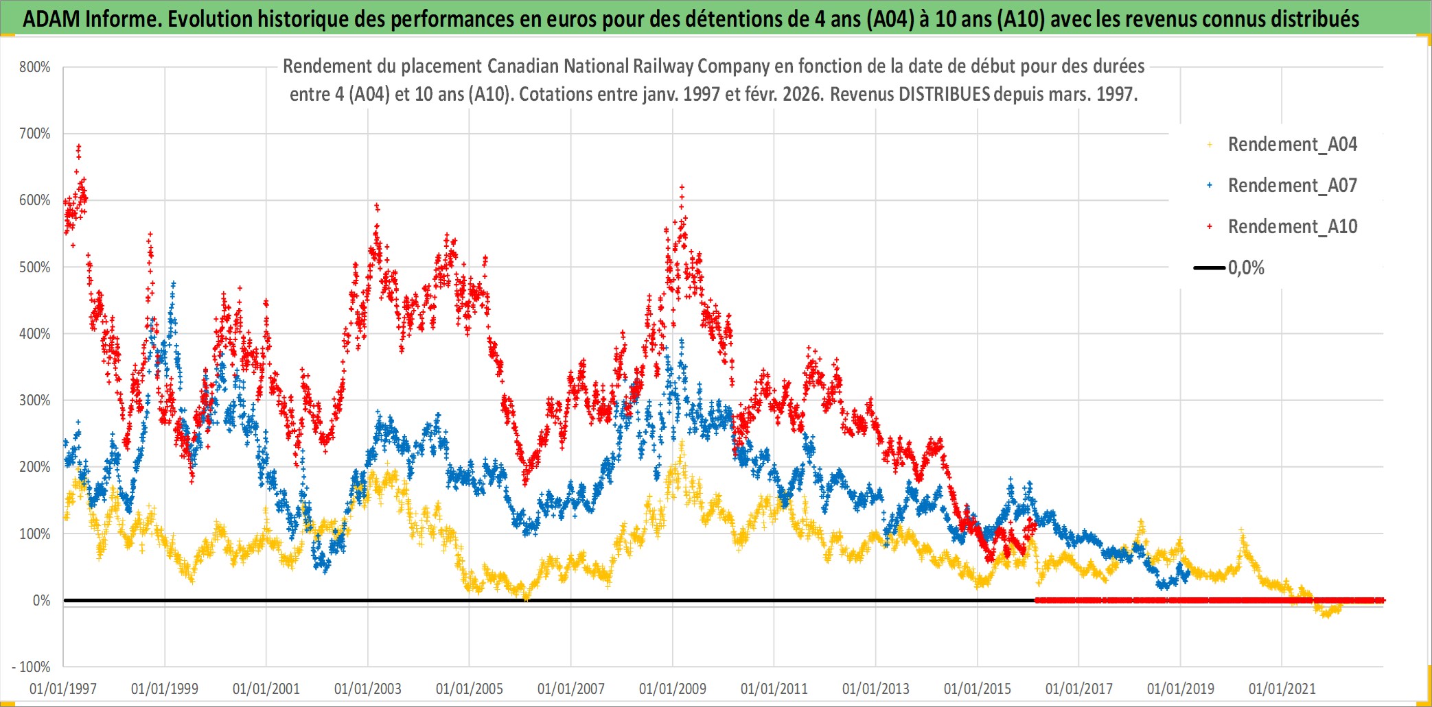 Site dédié aux investisseursPage dédiée sur site financeAnalyse des valorisations hebdomadaires de l'action Canadian National Railway Company. Cet actif est cote en CAD. Les valorisations sont en contrevaleur EURO et couvrent les semaines 1997W01 a 2026W09. Les revenus de cet actif financier sont pris en compte depuis la semaine 1997W10. La note globale ESG de cet actif est estimee a 13.0 (apres rebasage entre 0 et 20).