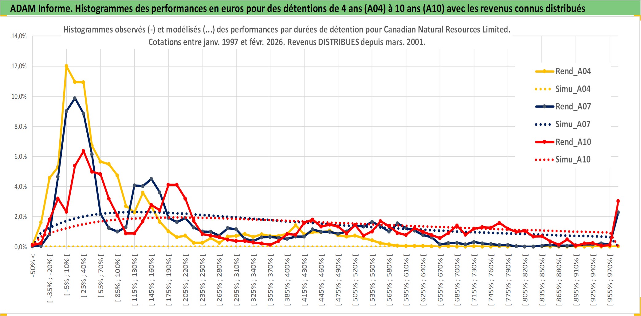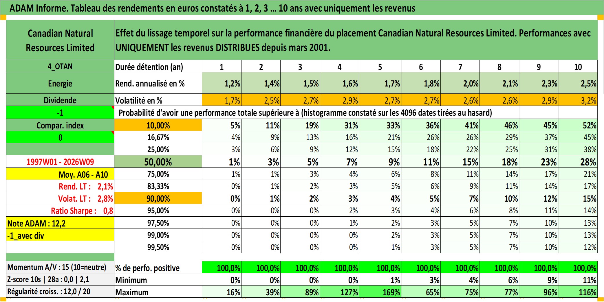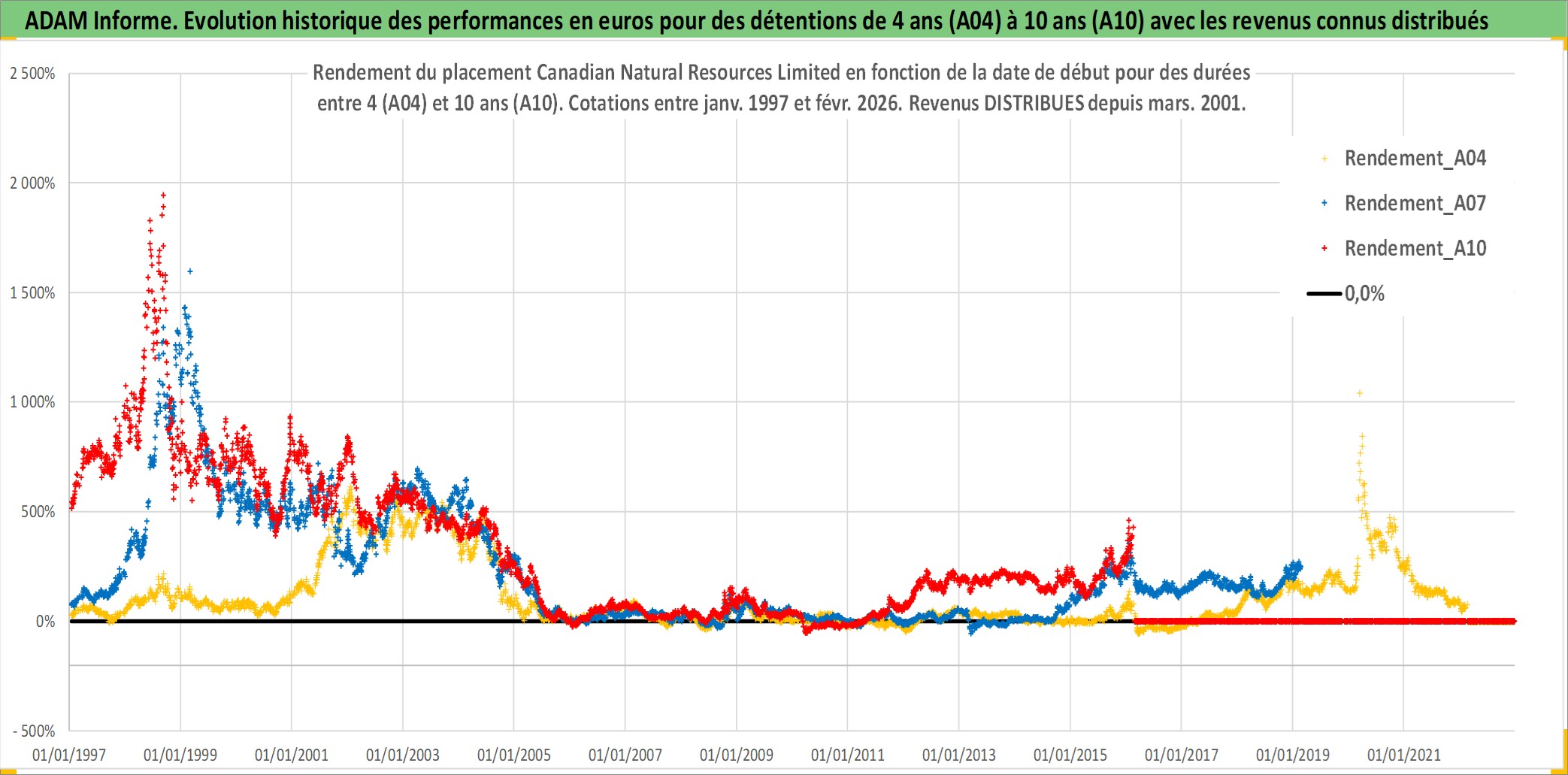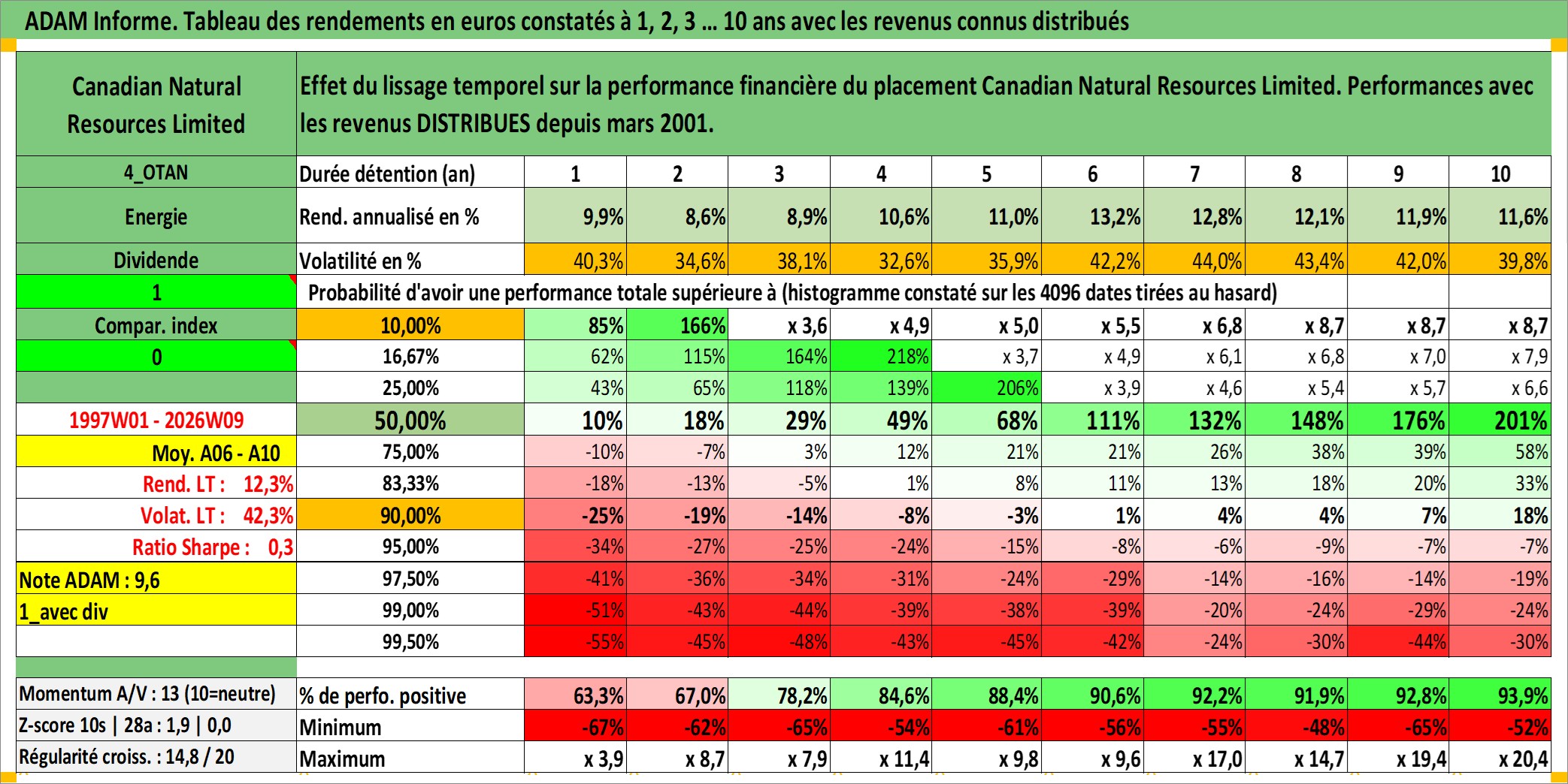 Site dédié aux investisseursPage dédiée sur site financeAnalyse des valorisations hebdomadaires de l'action Canadian Natural Resources Limited. Cet actif est cote en CAD. Les valorisations sont en contrevaleur EURO et couvrent les semaines 1997W01 a 2026W09. Les revenus de cet actif financier sont pris en compte depuis la semaine 2001W11. La note globale ESG de cet actif est estimee a 4.0 (apres rebasage entre 0 et 20).