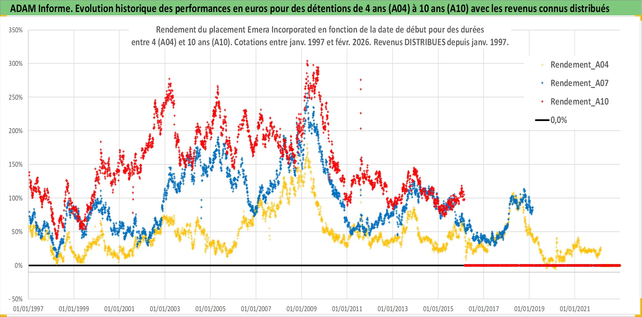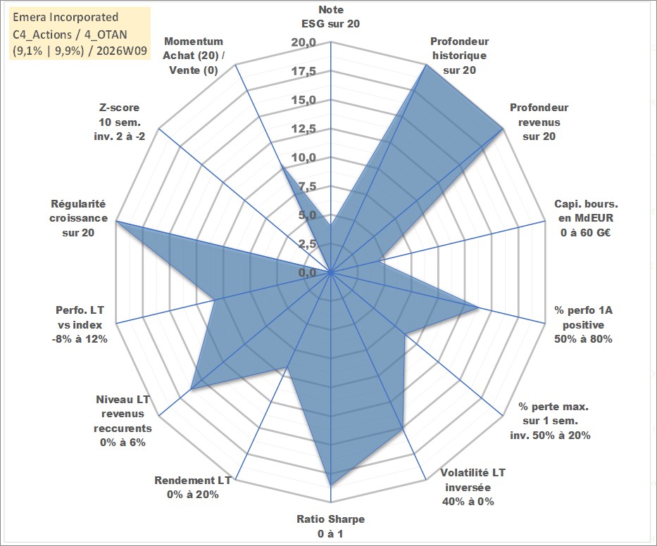 Site dédié aux investisseursPage dédiée sur site financeAnalyse des valorisations hebdomadaires de l'action Emera Incorporated. Cet actif est cote en CAD. Les valorisations sont en contrevaleur EURO et couvrent les semaines 1997W01 a 2026W09. Les revenus de cet actif financier sont pris en compte depuis la semaine 1997W05. La note globale ESG de cet actif est estimee a 4.0 (apres rebasage entre 0 et 20).