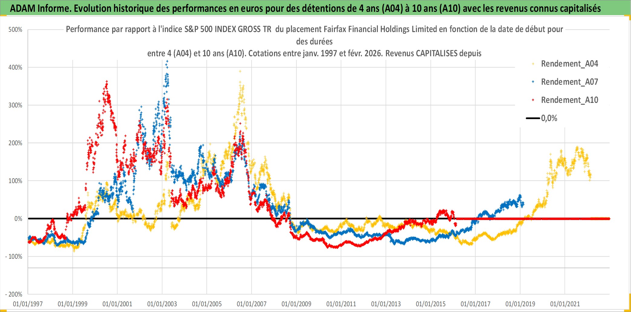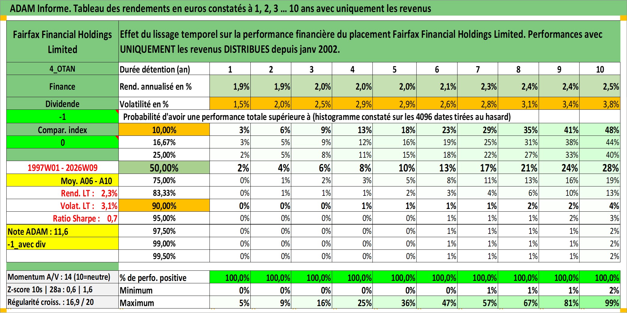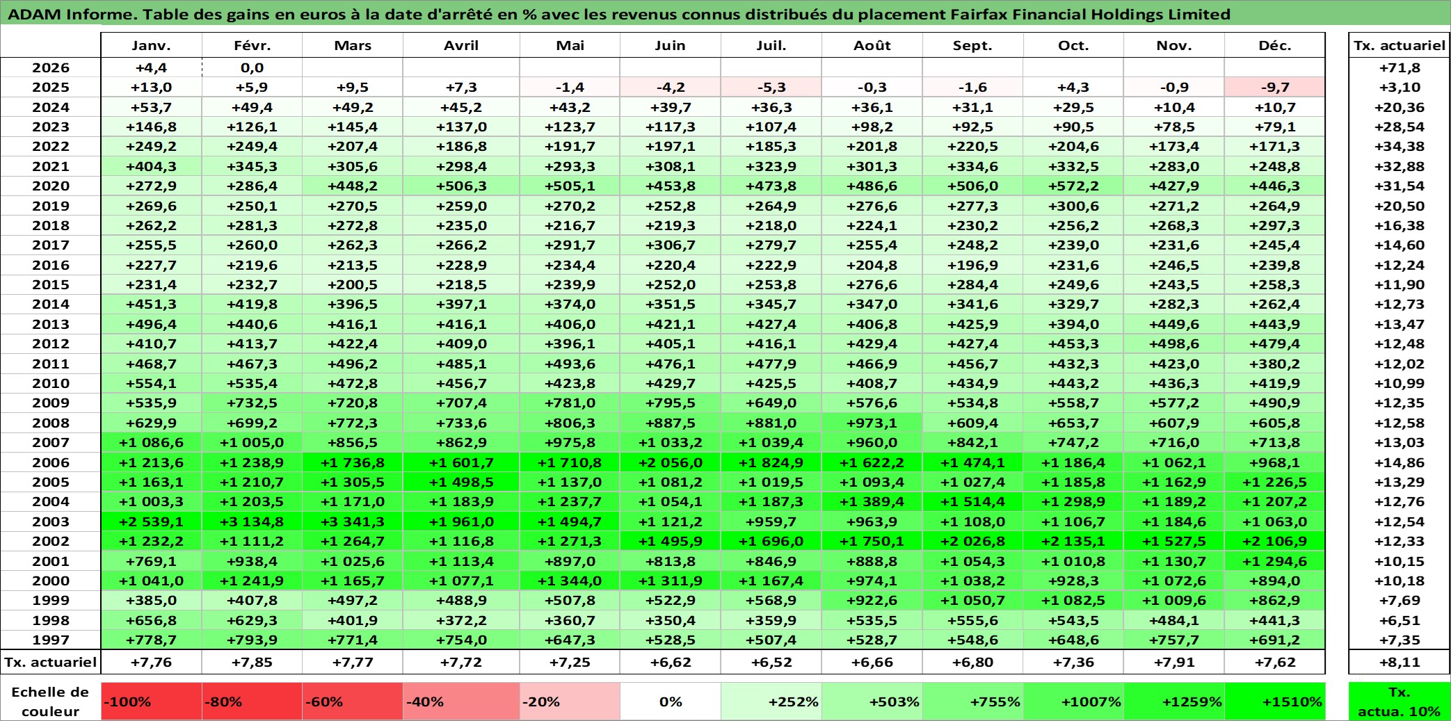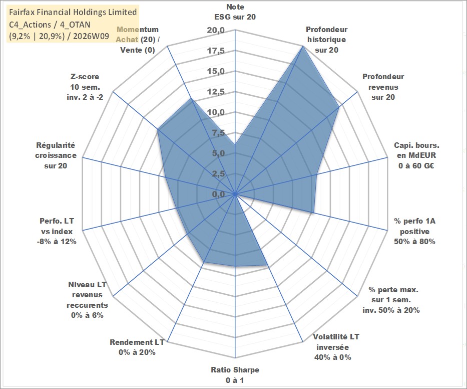 Site dédié aux investisseursPage dédiée sur site financeAnalyse des valorisations hebdomadaires de l'action Fairfax Financial Holdings Limited. Cet actif est cote en CAD. Les valorisations sont en contrevaleur EURO et couvrent les semaines 1997W01 a 2026W09. Les revenus de cet actif financier sont pris en compte depuis la semaine 2002W02. La note globale ESG de cet actif est estimee a 6.0 (apres rebasage entre 0 et 20).