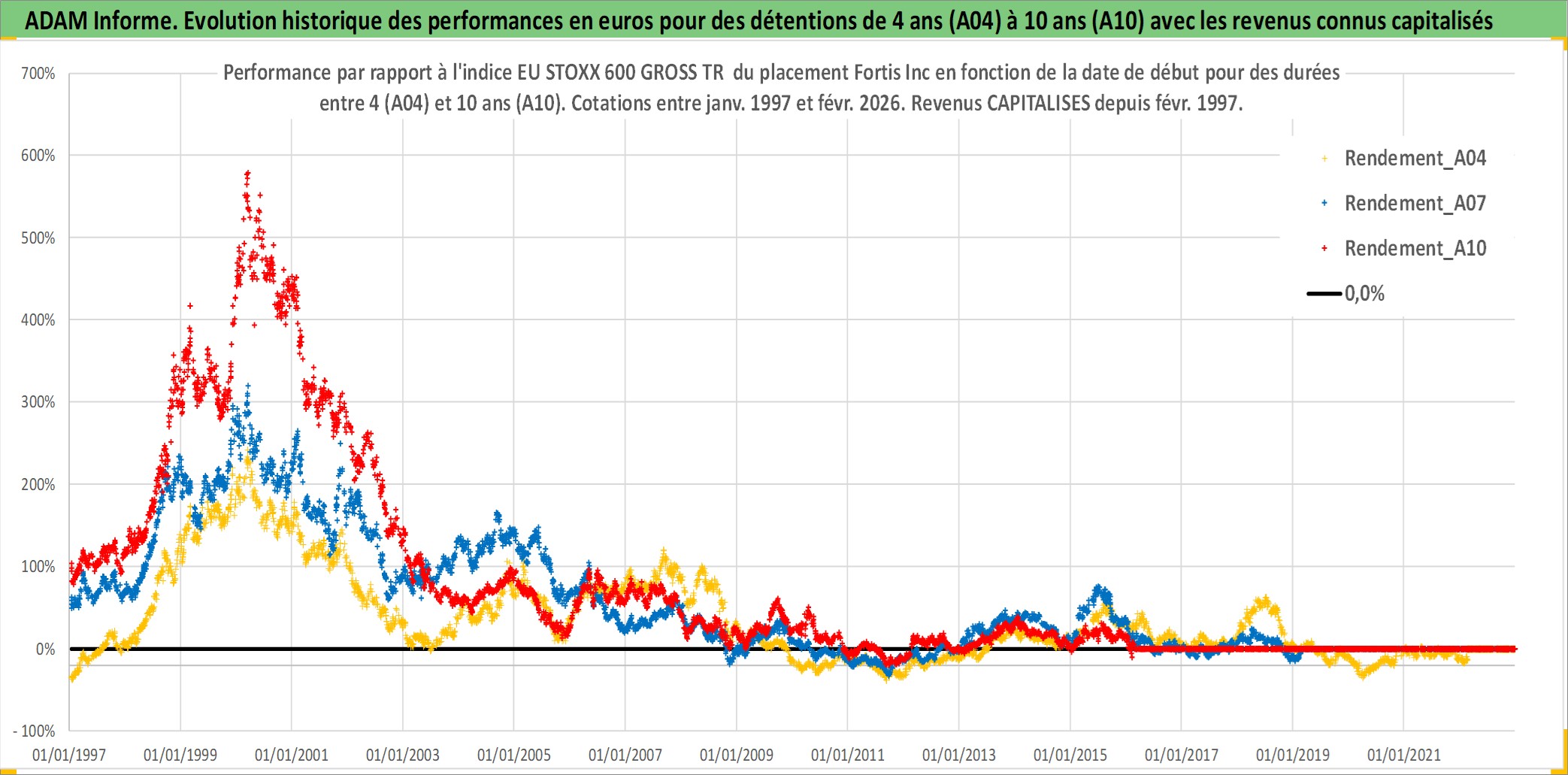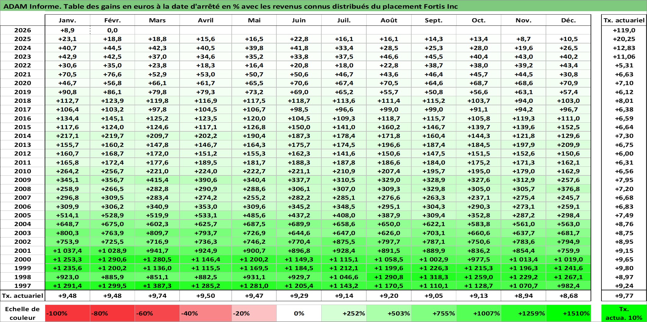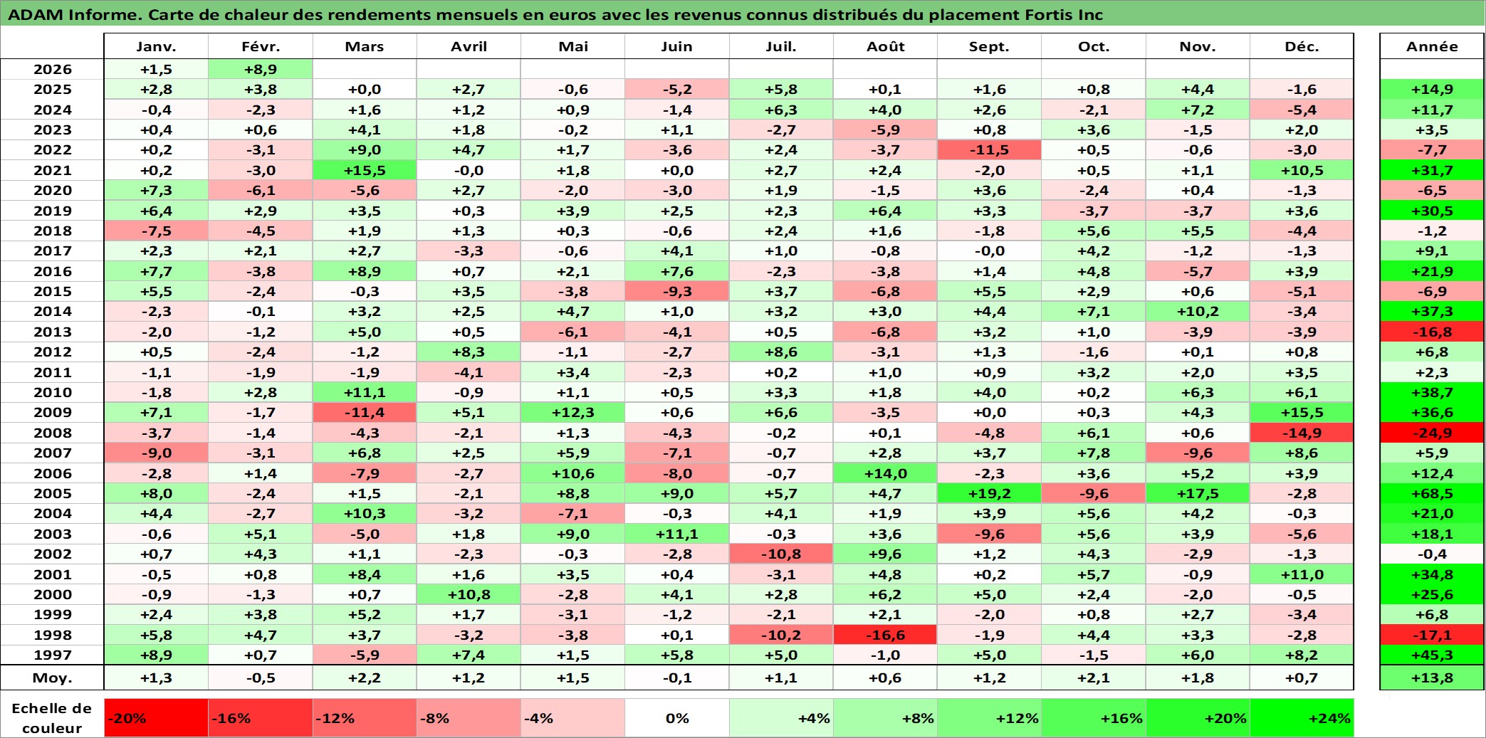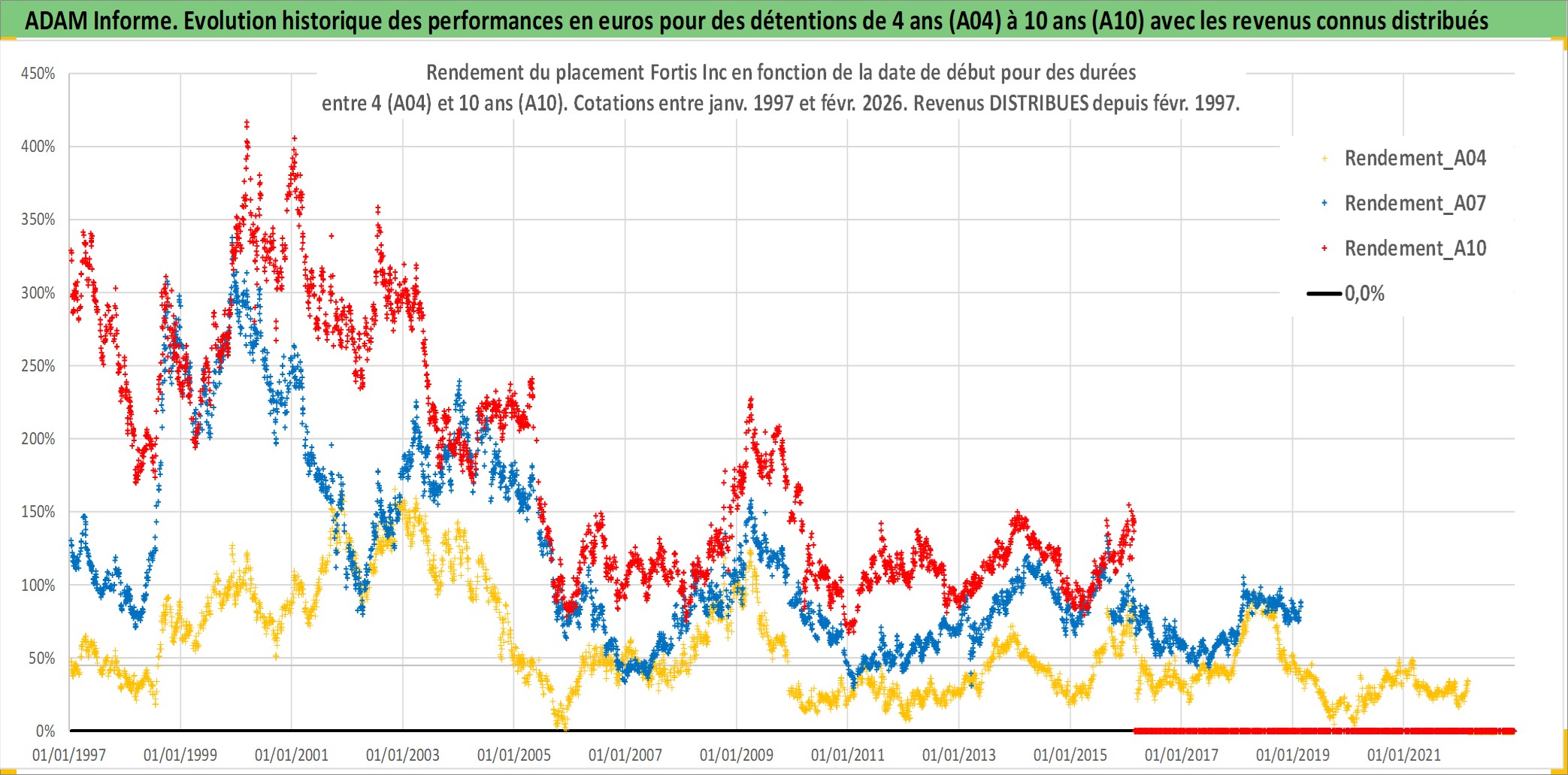 Site dédié aux investisseursPage dédiée sur site financeAnalyse des valorisations hebdomadaires de l'action Fortis Inc. Cet actif est cote en CAD. Les valorisations sont en contrevaleur EURO et couvrent les semaines 1997W01 a 2026W09. Les revenus de cet actif financier sont pris en compte depuis la semaine 1997W07. La note globale ESG de cet actif est estimee a 7.0 (apres rebasage entre 0 et 20).