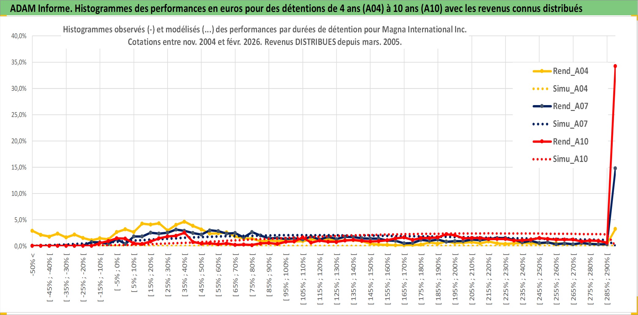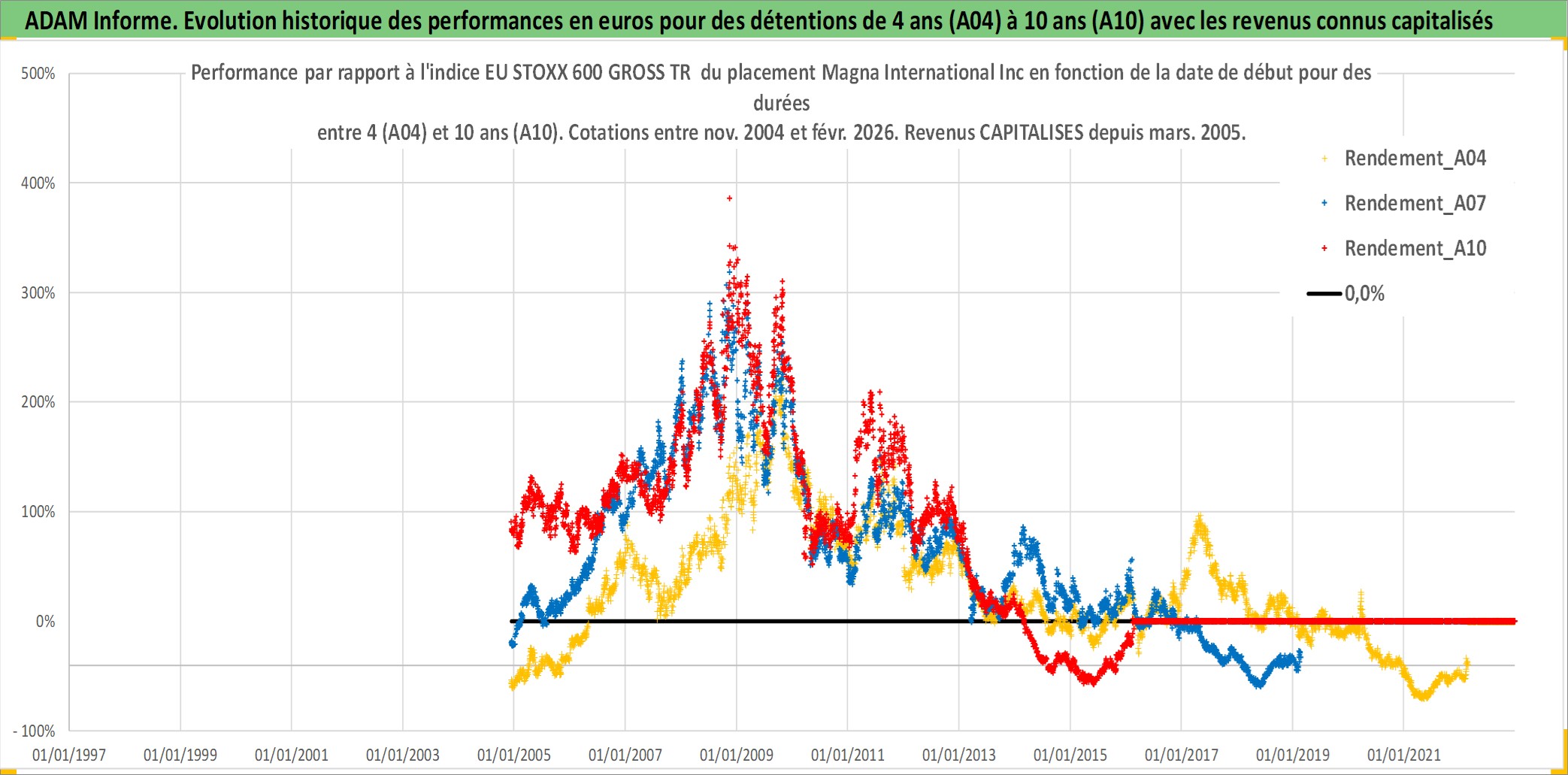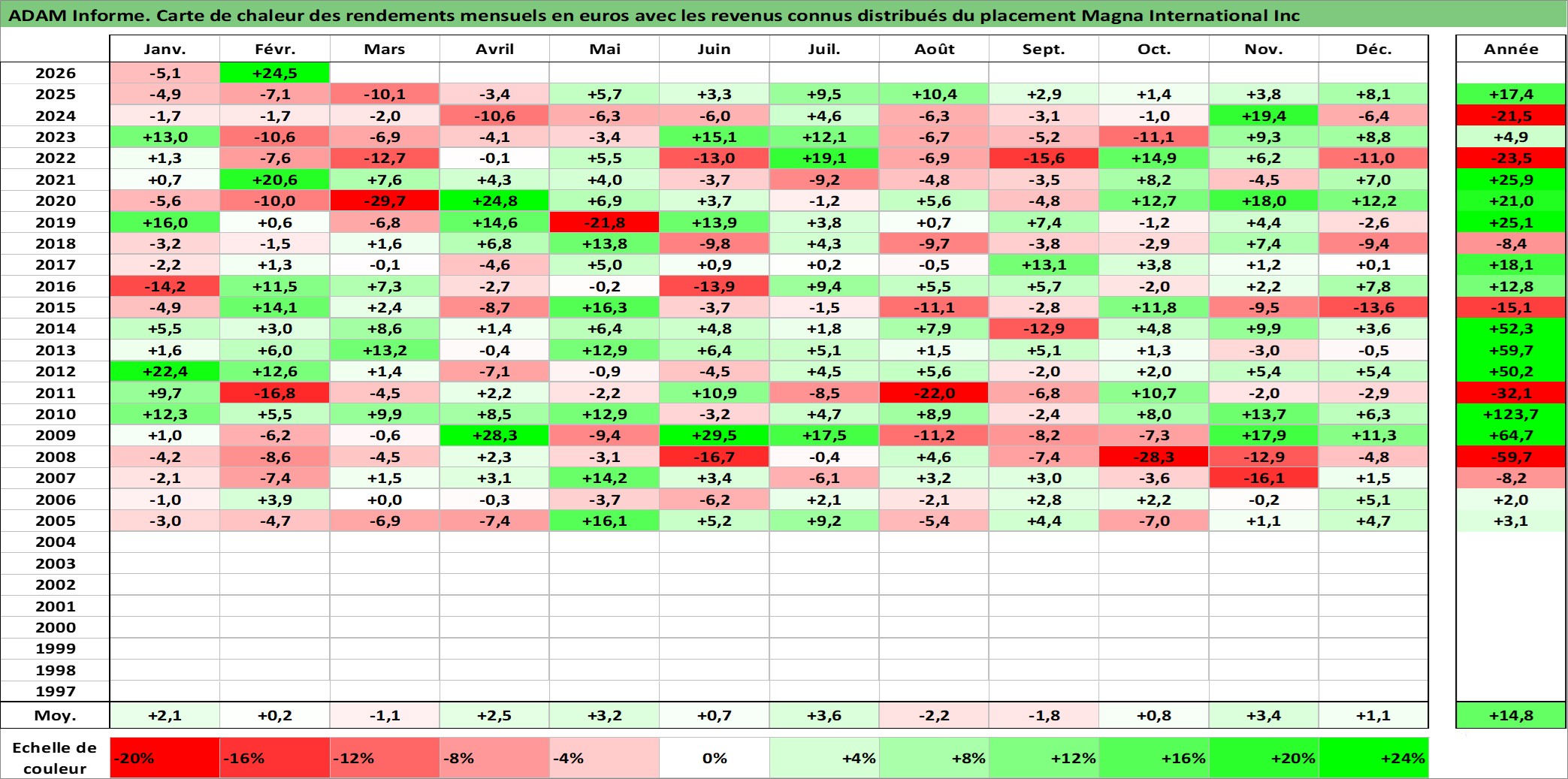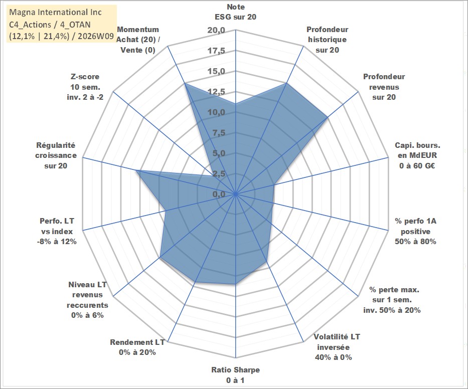 Site dédié aux investisseursPage dédiée sur site financeAnalyse des valorisations hebdomadaires de l'action Magna International Inc. Cet actif est cote en CAD. Les valorisations sont en contrevaleur EURO et couvrent les semaines 2004W49 a 2026W09. Les revenus de cet actif financier sont pris en compte depuis la semaine 2005W10. La note globale ESG de cet actif est estimee a 11.0 (apres rebasage entre 0 et 20).