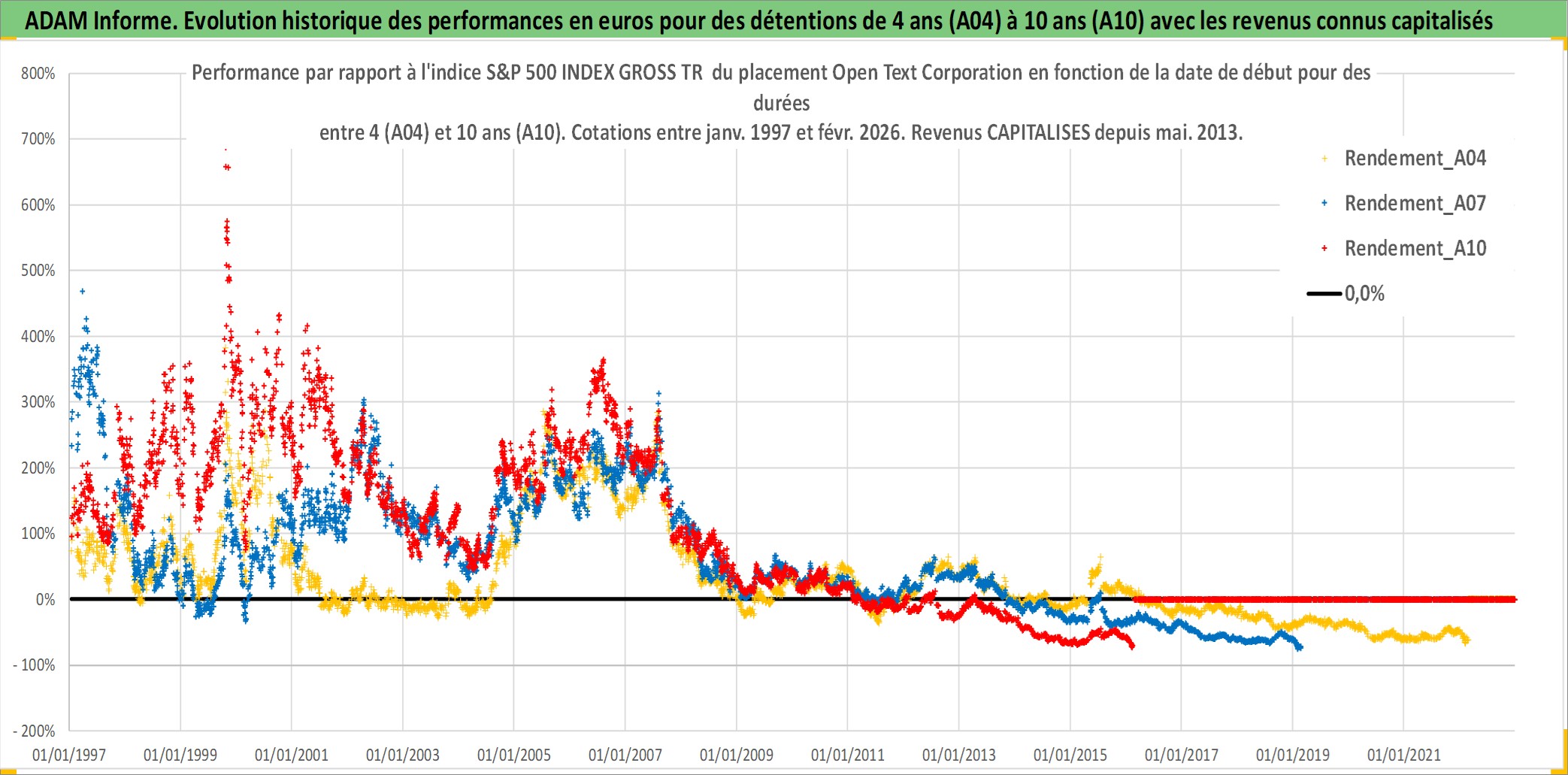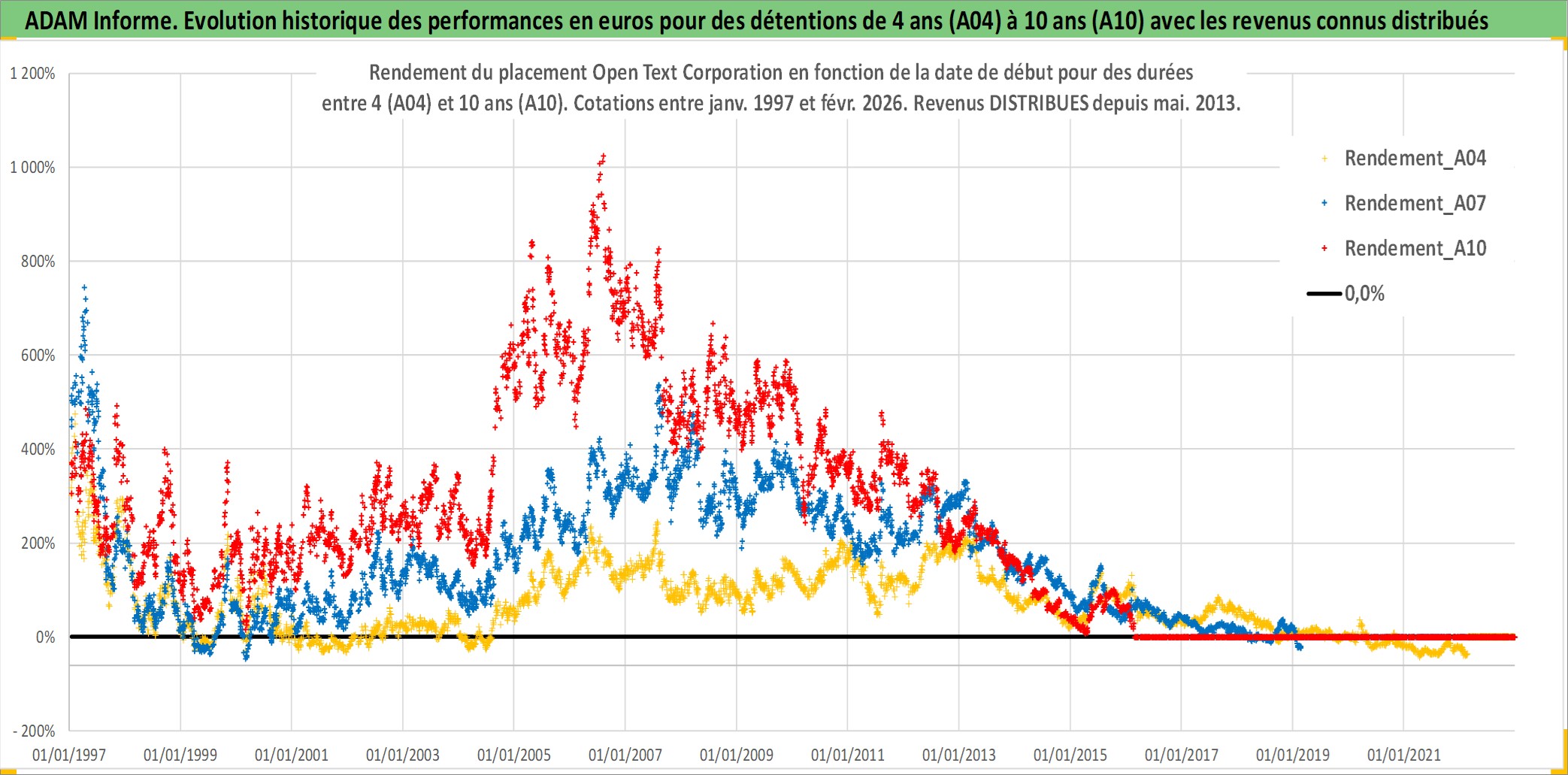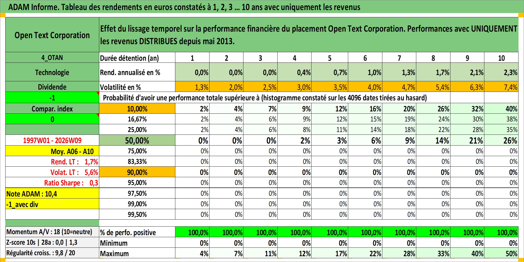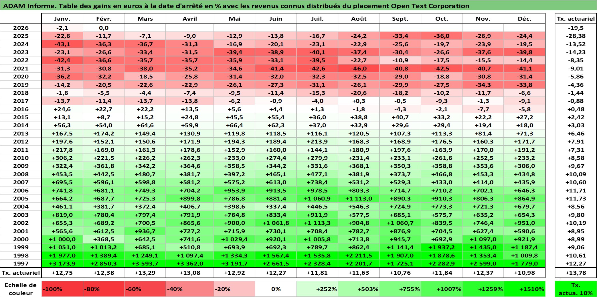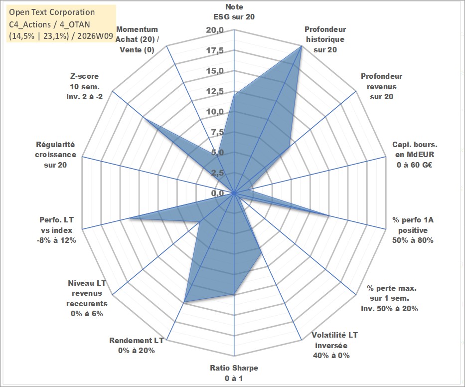 Site dédié aux investisseursPage dédiée sur site financeAnalyse des valorisations hebdomadaires de l'action Open Text Corporation. Cet actif est cote en USD. Les valorisations sont en contrevaleur EURO et couvrent les semaines 1997W01 a 2026W09. Les revenus de cet actif financier sont pris en compte depuis la semaine 2013W22. La note globale ESG de cet actif est estimee a 12.0 (apres rebasage entre 0 et 20).