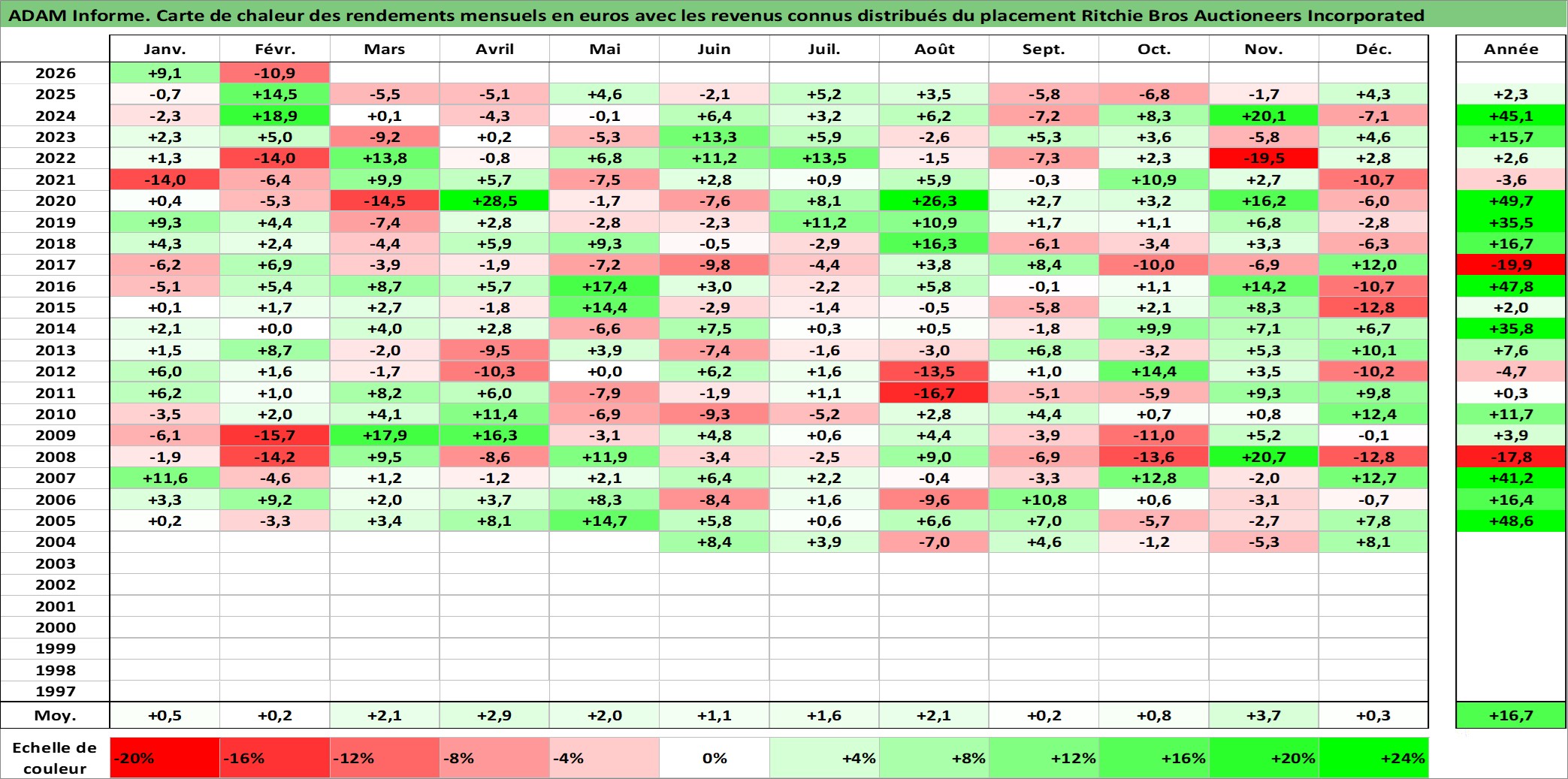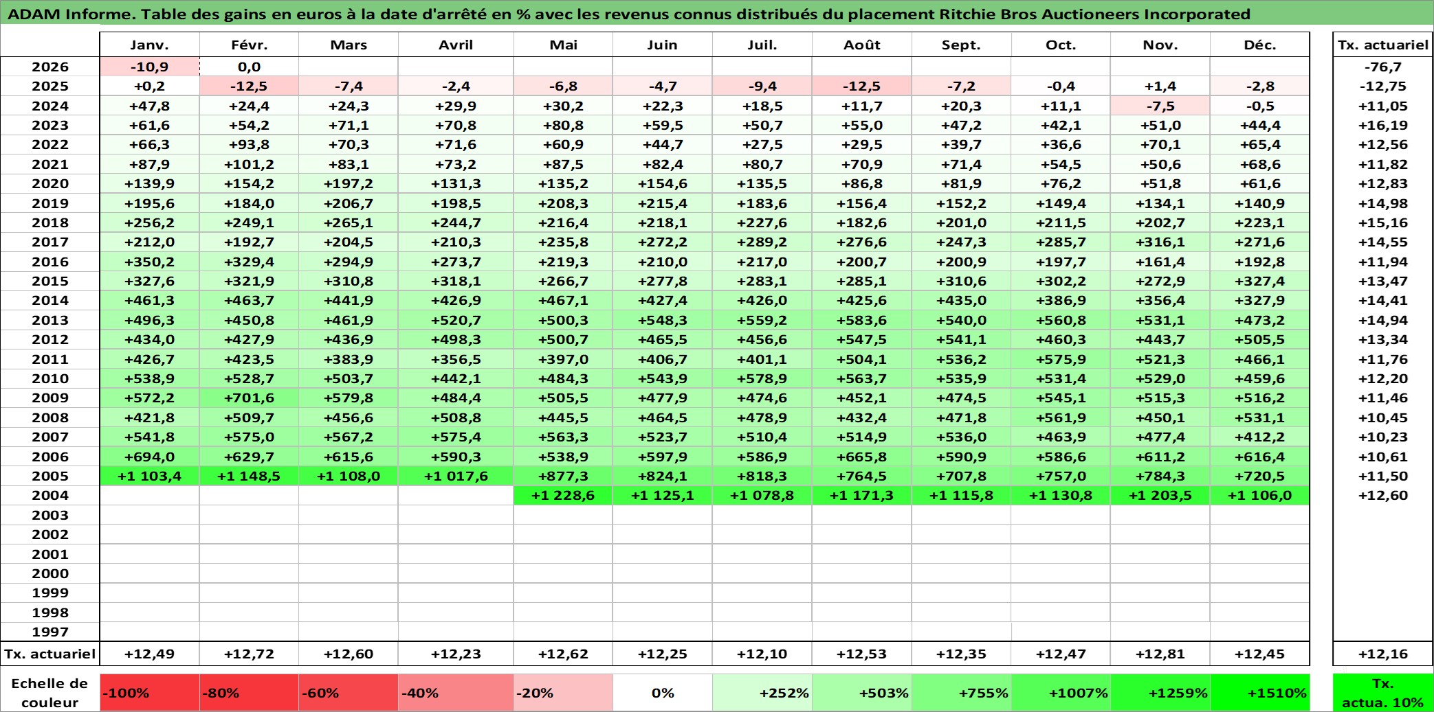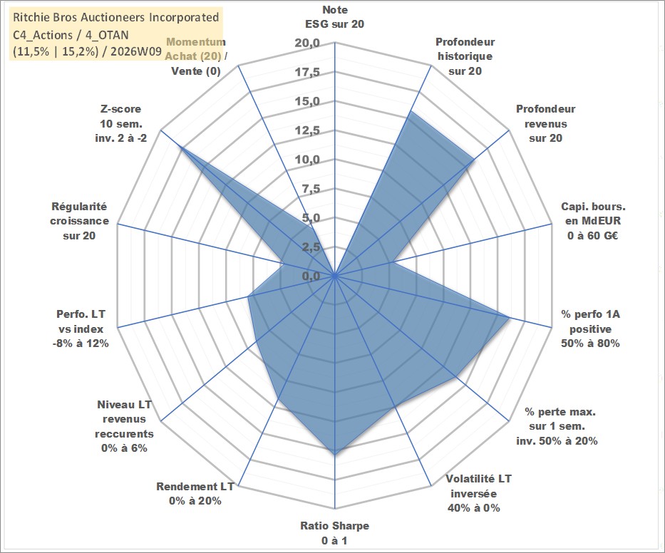 Site dédié aux investisseursPage dédiée sur site financeAnalyse des valorisations hebdomadaires de l'action Ritchie Bros Auctioneers Incorporated. Cet actif est cote en CAD. Les valorisations sont en contrevaleur EURO et couvrent les semaines 2004W19 a 2026W09. Les revenus de cet actif financier sont pris en compte depuis la semaine 2004W22. La note ESG de cet actif n'est pas connue.