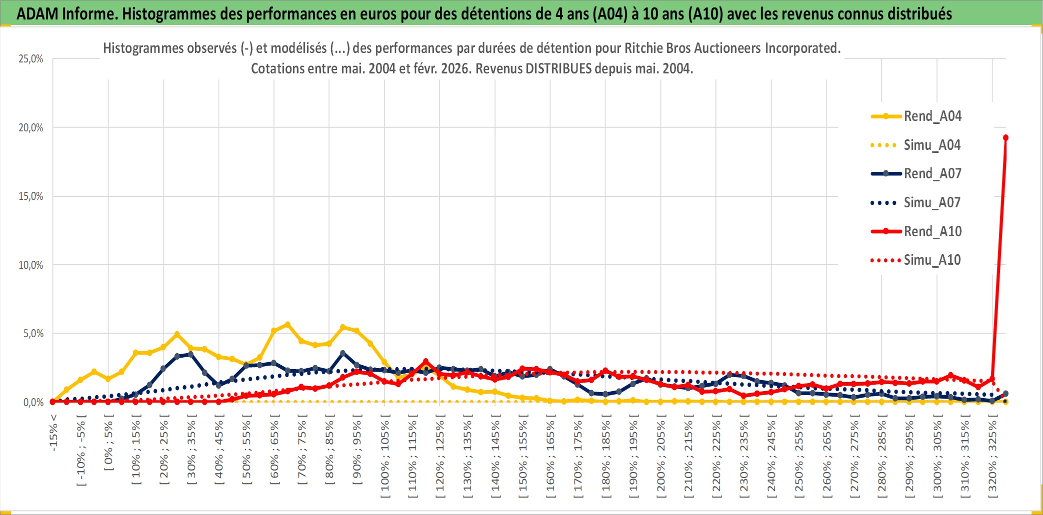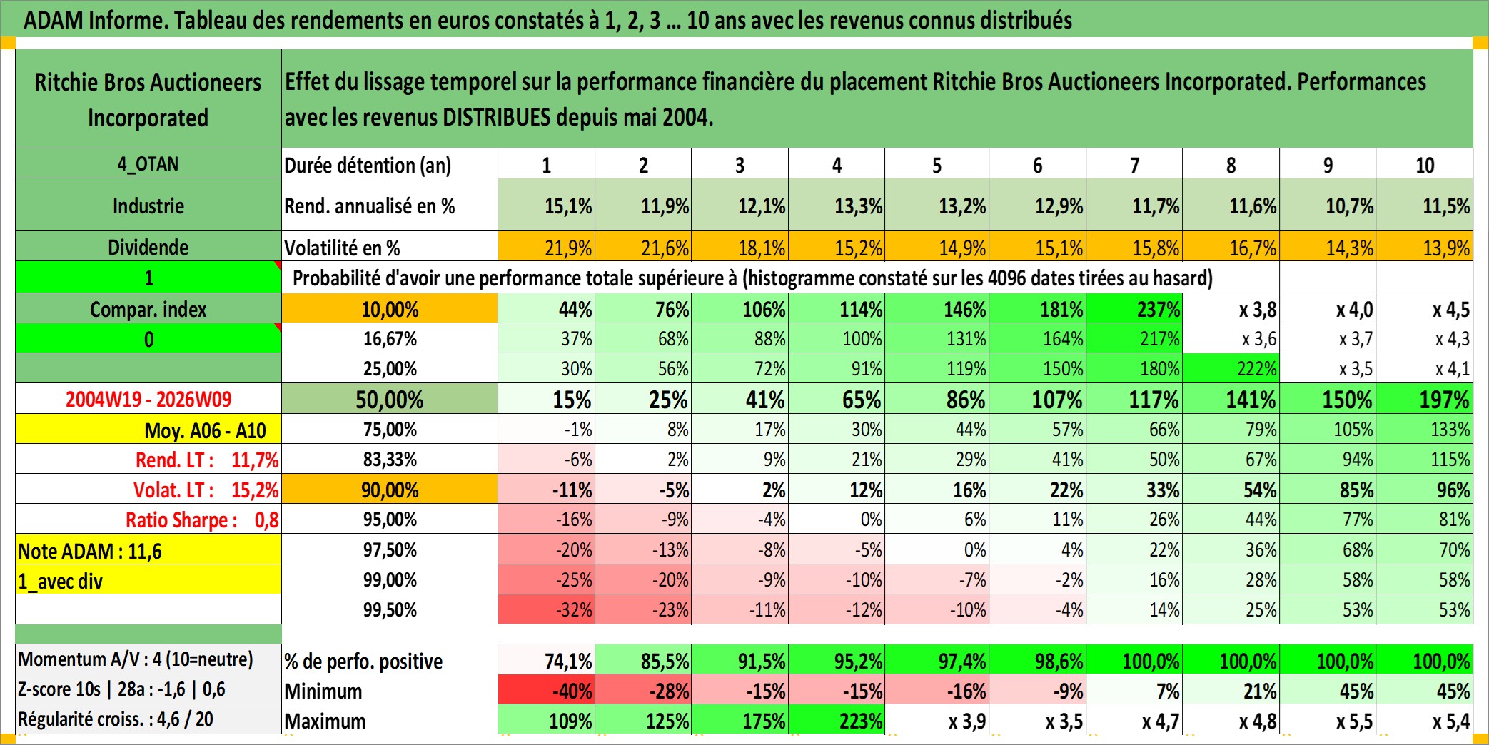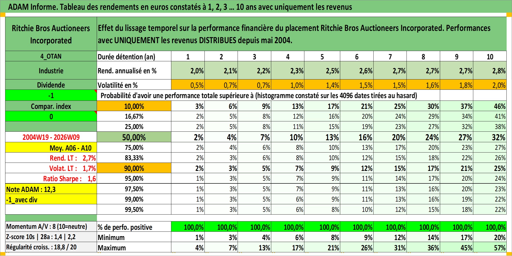 Site dédié aux investisseursPage dédiée sur site financeAnalyse des valorisations hebdomadaires de l'action Ritchie Bros Auctioneers Incorporated. Cet actif est cote en CAD. Les valorisations sont en contrevaleur EURO et couvrent les semaines 2004W19 a 2026W09. Les revenus de cet actif financier sont pris en compte depuis la semaine 2004W22. La note ESG de cet actif n'est pas connue.